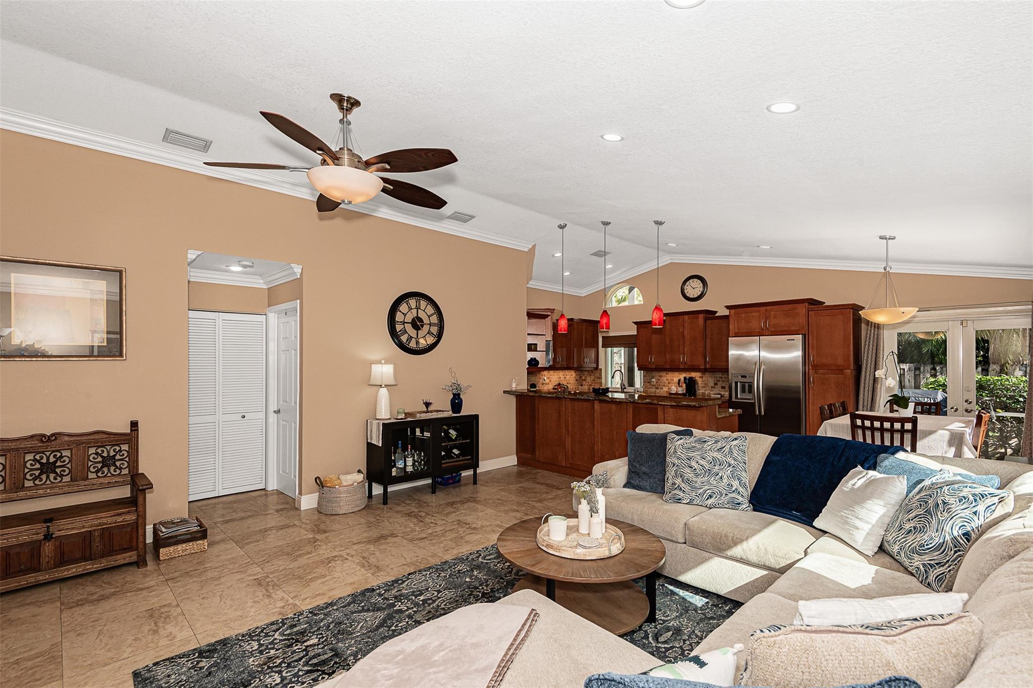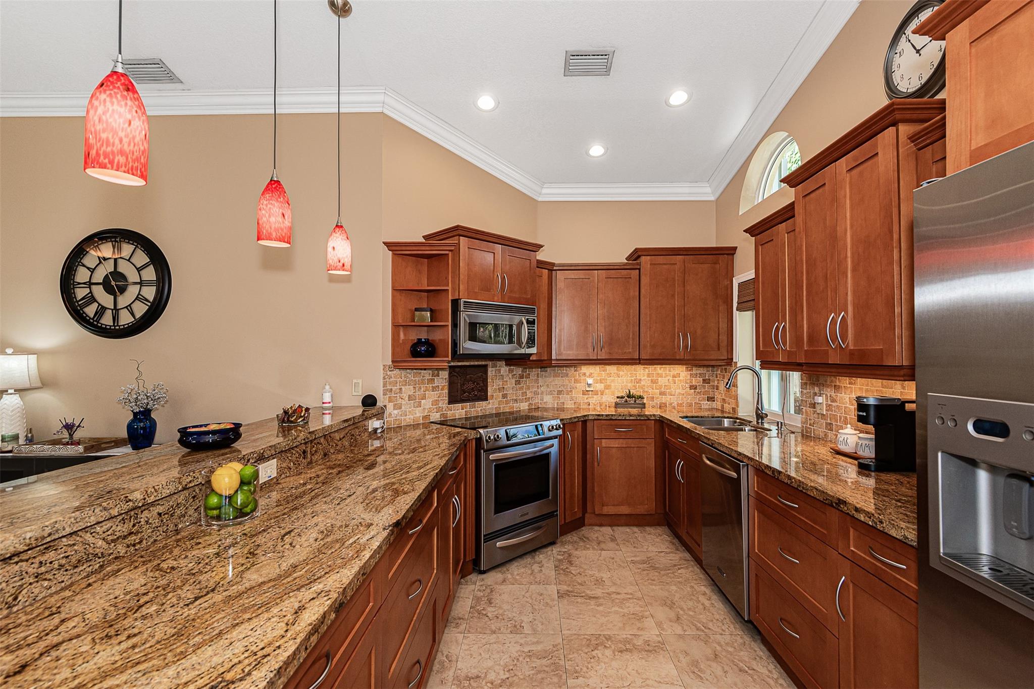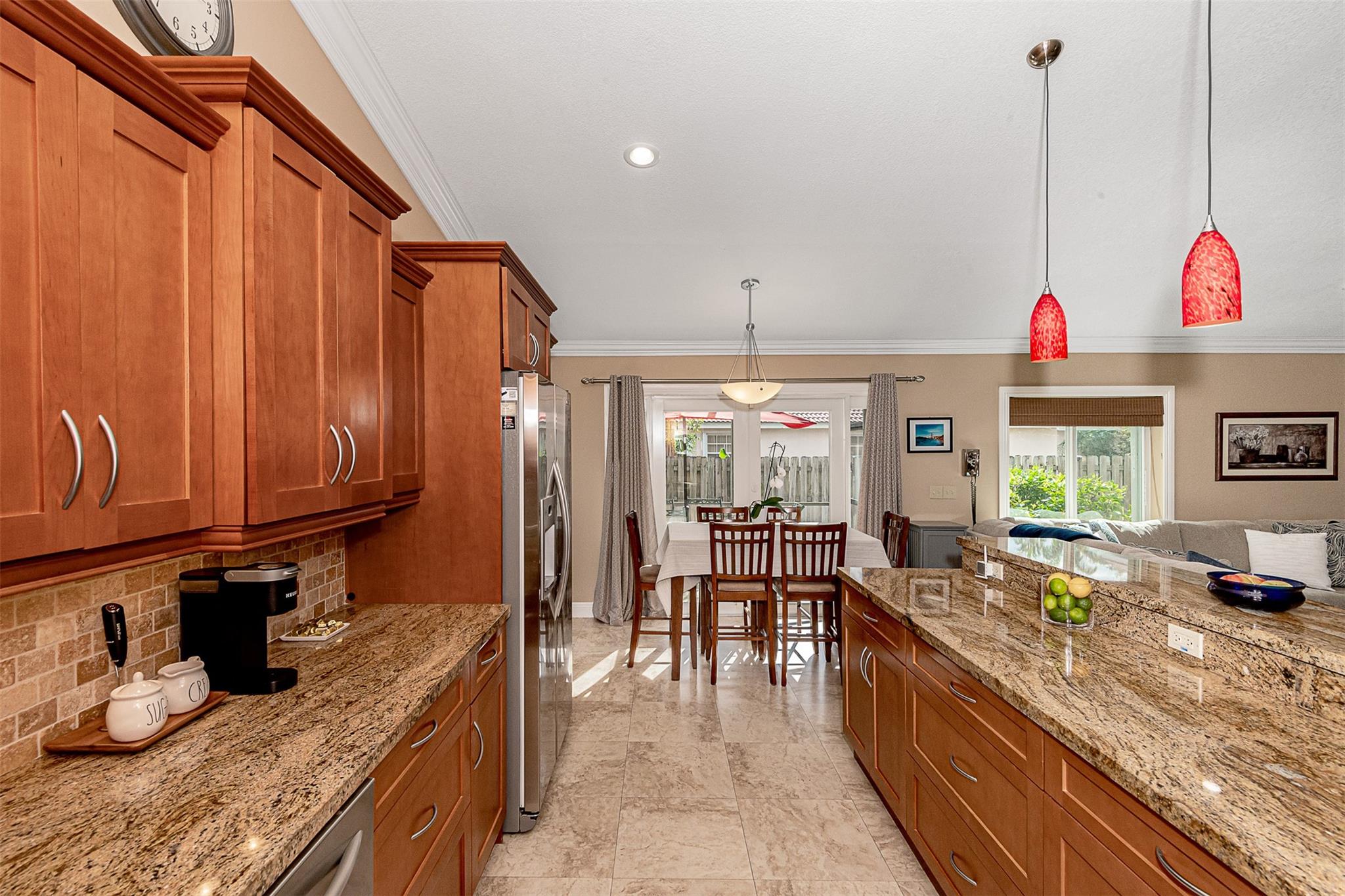 Move in condition, with expanded, remodeled kitchen with tall cabinets w/pull outs, granite counter tops, KitchenAid stainless steel appliances. Upgraded bathroom vanities. 20" porcelain tiles and 6" baseboards. Crown molding throughout main living area. The following were installed or replaced 2023: impact skylight, impact widows and door, impact overhead garage door, exterior of home painted. In 2000-2002: water heater, Craftsman garage door opener, accordion shutters. Interior doors and hardware updated. Open floor plan and split bedrooms. Custom closets in all bedrooms. Oversized, fenced backyard features sprinkler system and various plants, plenty of room for dogs and swing sets. 600 sq. ft. screened patio. 6x10 shed included. 2 car driveway. Only 3 bedroom Garden Home available.