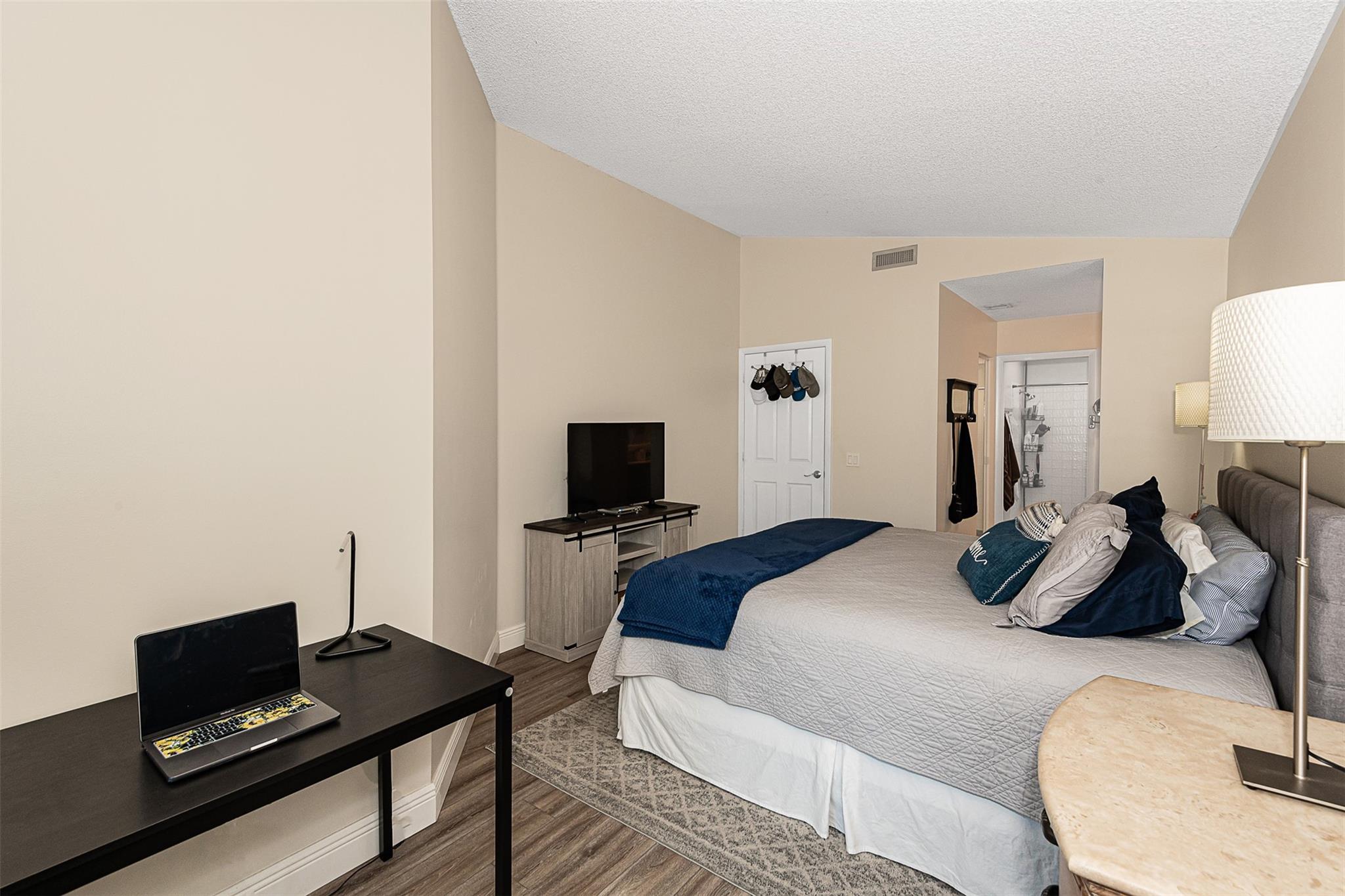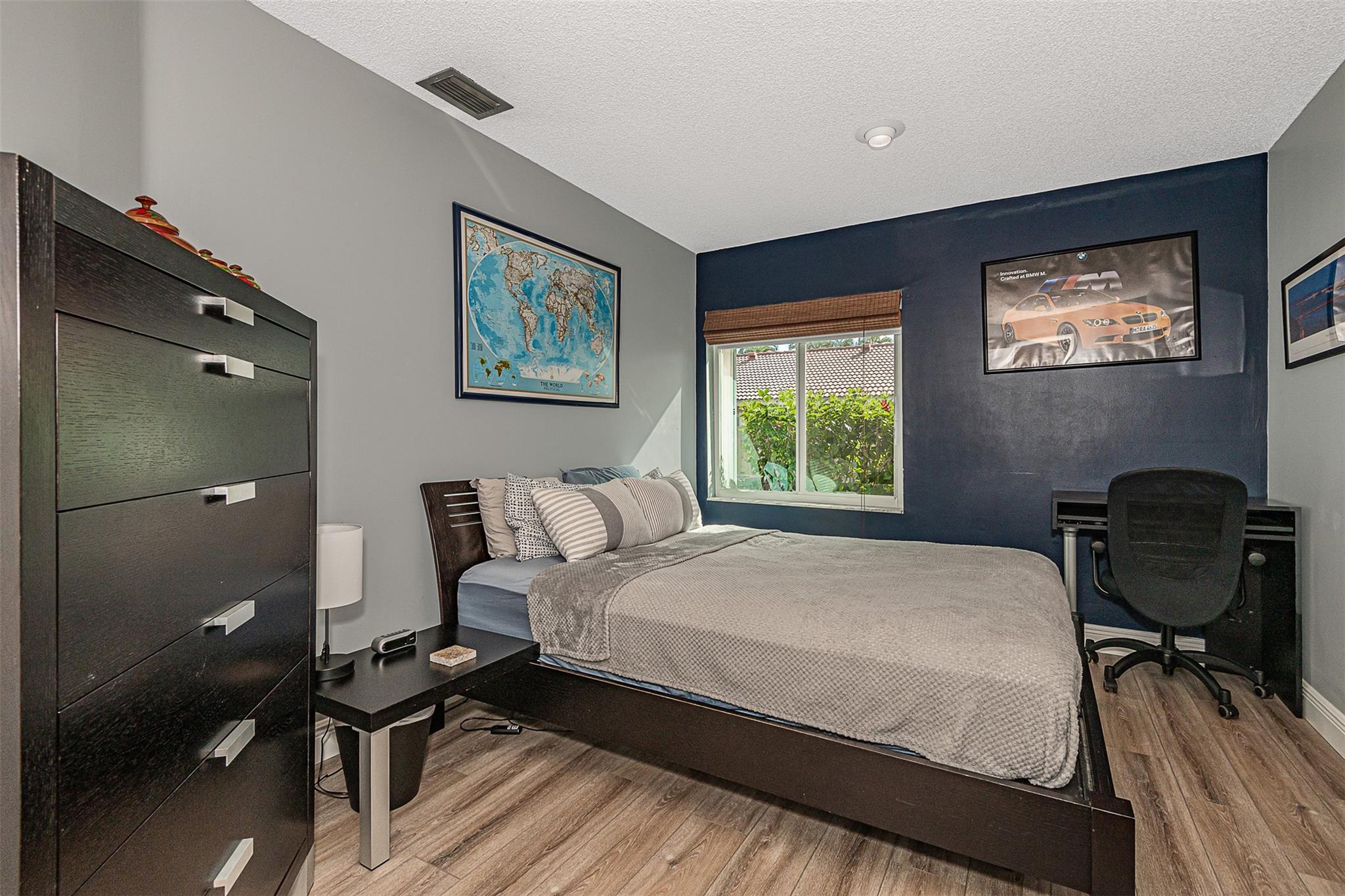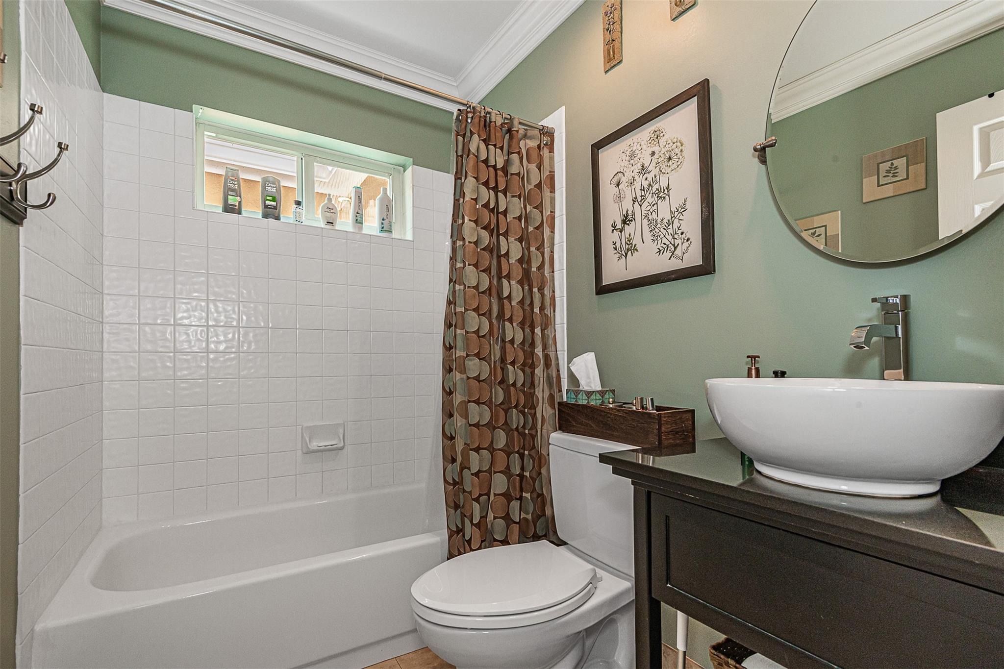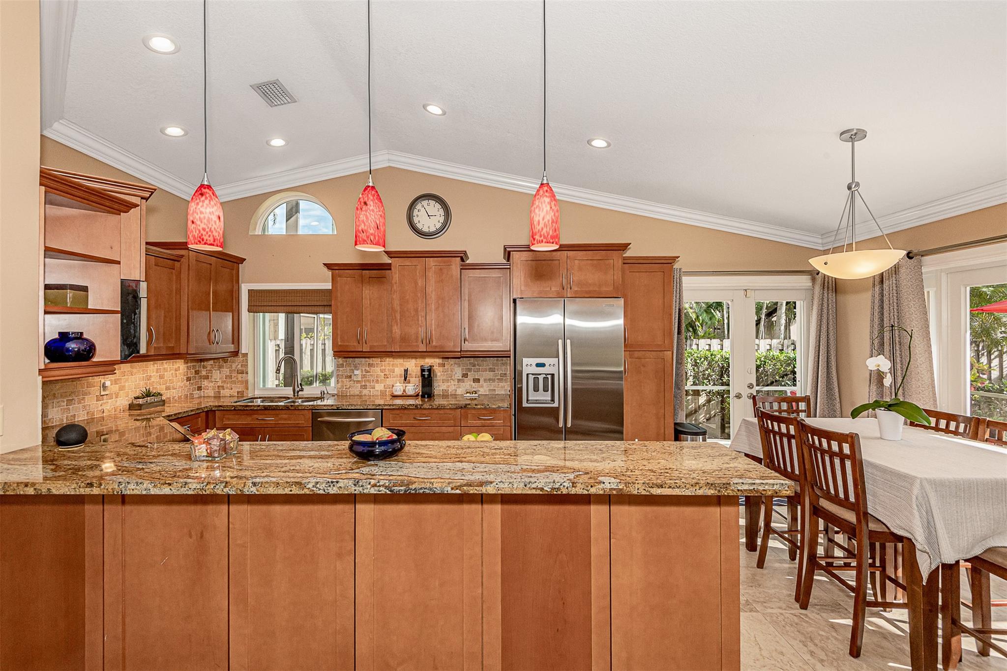 Move in condition, with expanded, remodeled kitchen with tall cabinets w/pull outs, granite counter tops, KitchenAid stainless steel appliances. Upgraded bathroom vanities. 20" porcelain tiles and 6" baseboards. Crown molding throughout main living area. The following were installed or replaced 2023: impact skylight, impact widows and door, impact overhead garage door, exterior of home painted. In 2000-2002: water heater, Craftsman garage door opener, accordion shutters. Interior doors and hardware updated. Open floor plan and split bedrooms. Custom closets in all bedrooms. Oversized, fenced backyard features sprinkler system and various plants, plenty of room for dogs and swing sets. 600 sq. ft. screened patio. 6x10 shed included. 2 car driveway. Only 3 bedroom Garden Home available.