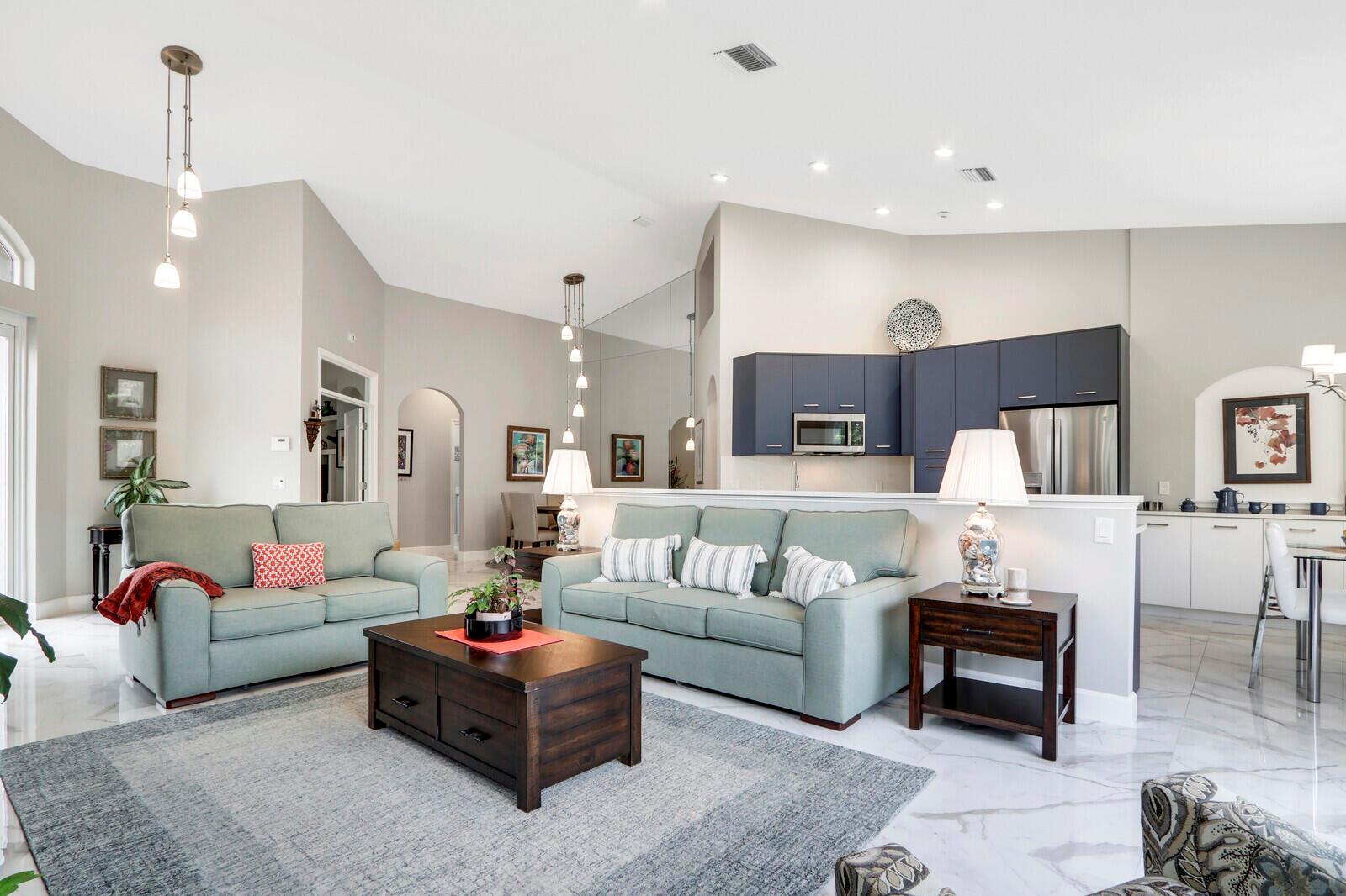 You've never seen a Sandpiper Cove home like this! FULLY RENOVATED over two years (2021-2023), inside and out, this spacious and open concept home has been transformed with a NEW ROOF (2023), and NEW IMPACT GLASS WINDOWS AND DOORS (2022.) Offered furnished excluding artwork/accessories. New over-sized Porcelain tile throughout the main living area and luxury vinyl flooring in the bedrooms. Stunning Italian kitchen cabinetry, quartz countertops and GE Profile stainless appliance package make this 2023-renovated kitchen a dynamic focal point of the home. Both primary and guest bathrooms were fully remodeled in in 2023, as was the laundry room. All new LED lighting throughout, epoxy flooring in the garage, new interior paint throughout (2023) and the exterior was painted by the HOA in 2023.
