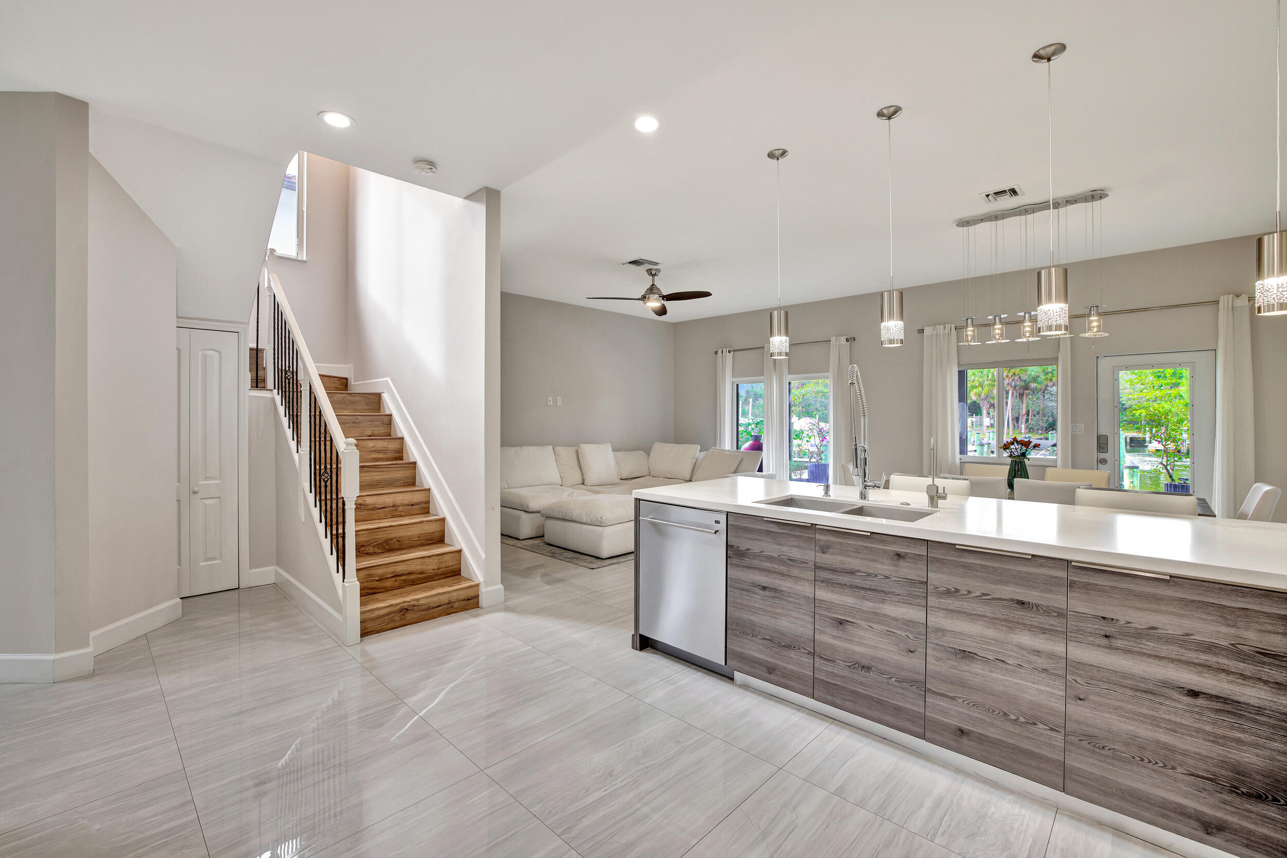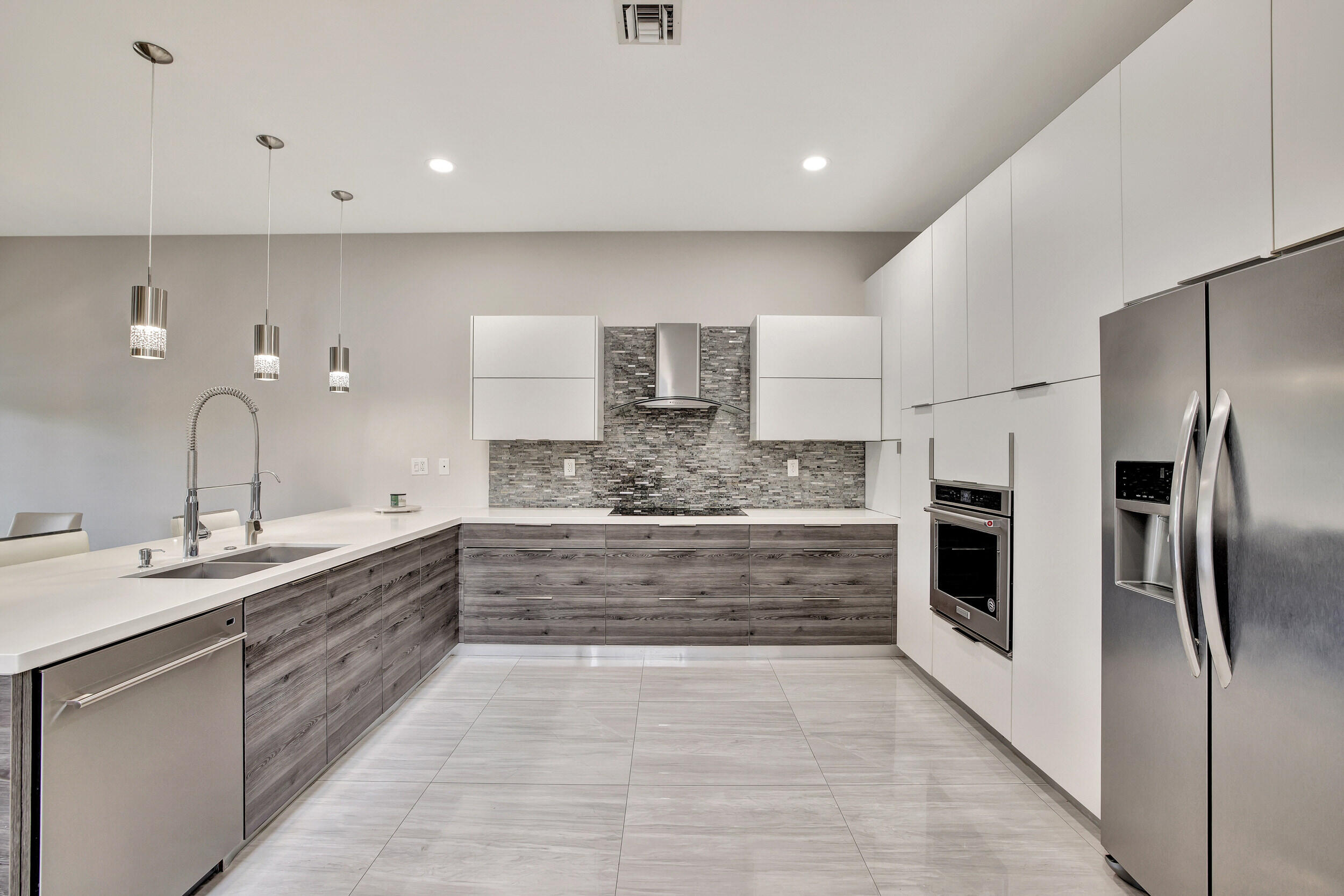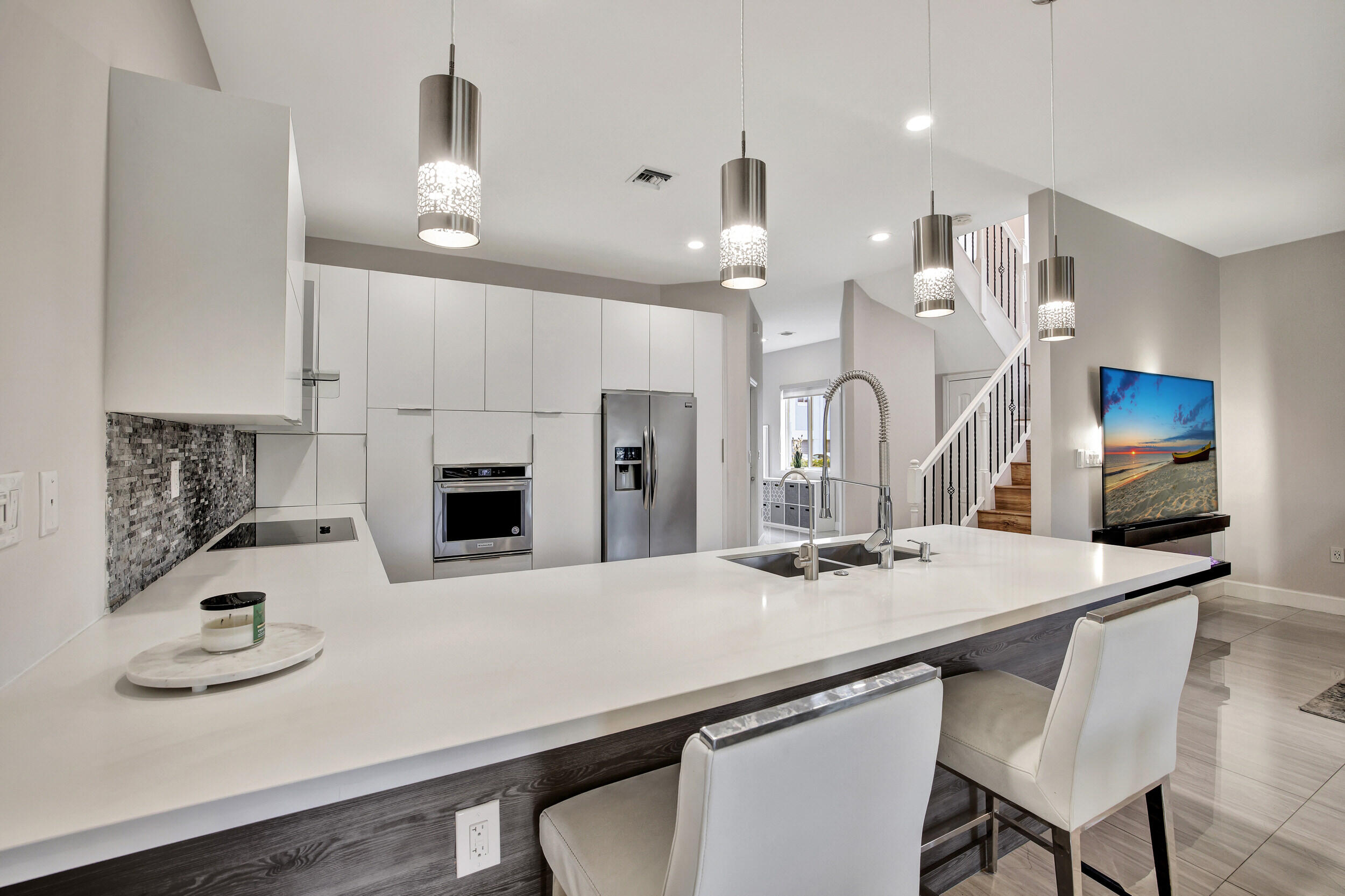 Absolutely spectacular modern townhome boasting sweeping water views just outside its doors. Recently painted with carefully chosen neutral and rich colors by interior designers, this home is move-in ready - just pack your bags and settle in. Completely remodeled with no expense spared, this residence features gorgeous oversized rectified porcelain floors throughout.The spacious master suite offers stunning wood floors, a walk-in closet, and a master bath that rivals a spa experience. The gourmet kitchen is a chef's dream, equipped with endless gorgeous white quartz counters, high-end cabinets, top-of-the-line stainless steel appliances, and a custom tile backsplash. Custom compartments in the cabinets discreetly conceal smaller appliances, maintaining the sleek aesthetic.