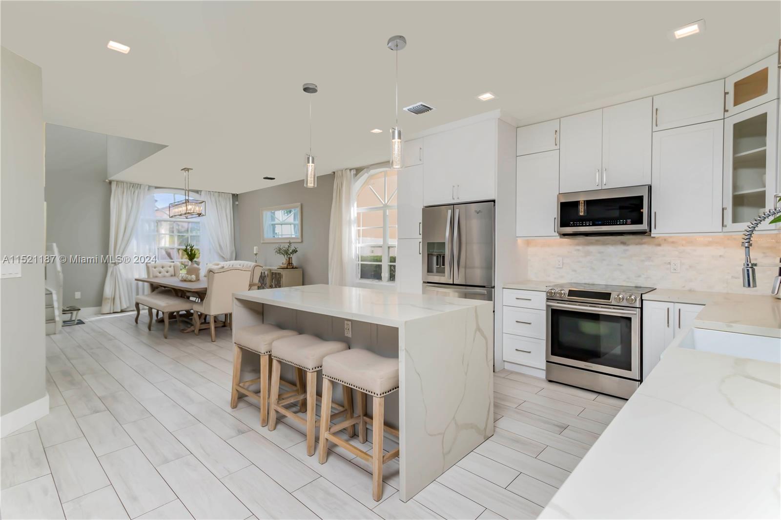 Fully renovated 3 bed, 2.5 bath in the gated community of Towngate - Contempo Walk. Porcelain tile throughout first floor and laminate on stairs and second floor. Custom kitchen with showcase cabinets, LED lighting, wine fridge, and large island. Large primary bedroom with a walk-in closet and spa-like bathroom with a soaking tub. Custom closets, shaker doors, and modern baseboards. Perfect backyard for entertaining, featuring a saltwater pool with sundeck, pergola, artificial turf and putting green. Private backyard enclosed with Podocarpus hedges. Wonderful community amenities. Central location right off I-75 surrounded by excellent restaurants and shopping.