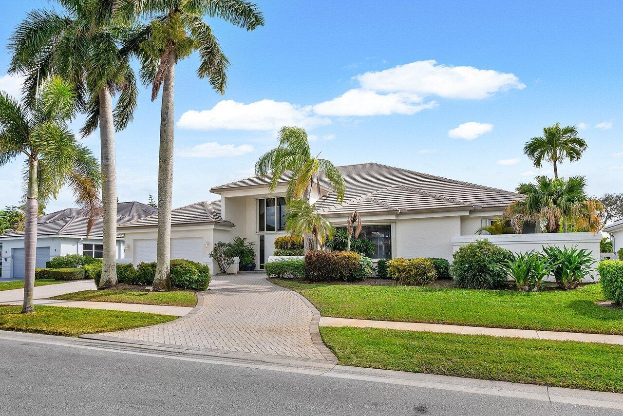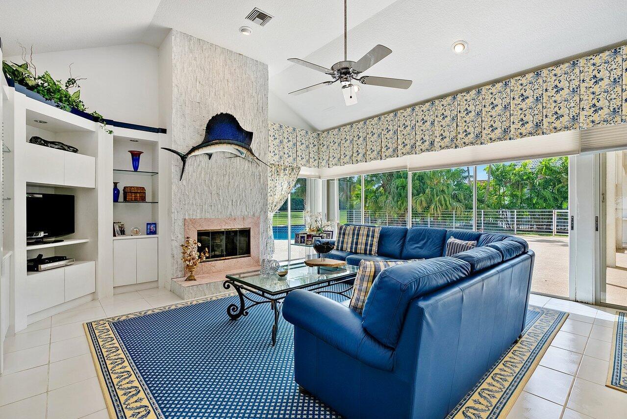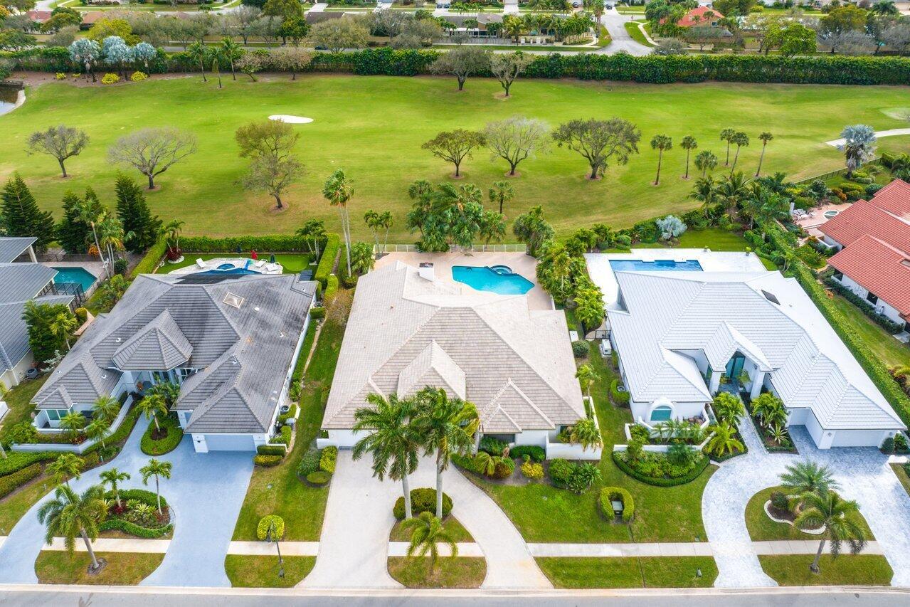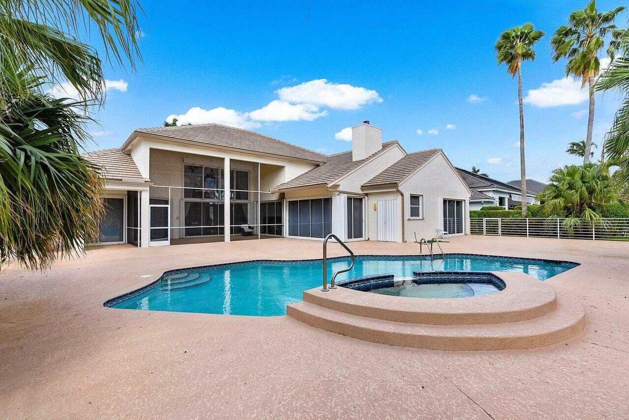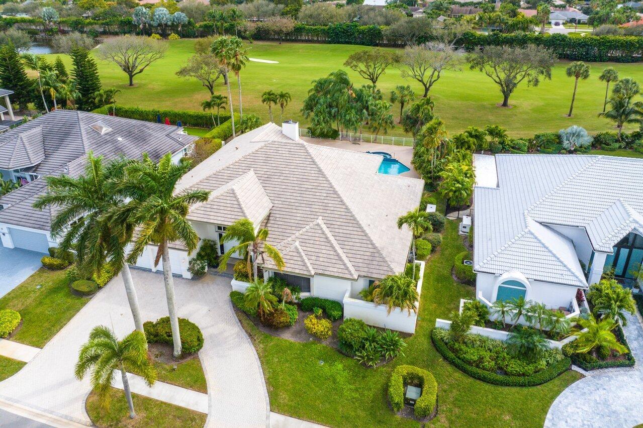 Over 4000 square feet with soaring ceilings and high windows! Spacious split bedrooms - each with ensuite bathrooms plus a large office (has 1/2 bath attached can be 4TH BEDROOM). Primary bedroom boasts his & her bathrooms & two large walk-in closets. Beautiful family room off kitchen has fireplace and natural light from the floor-ceiling windows. A screened porch leads to a spectacular pool & patio with gorgeous golf course views. Great layout! Roof replaced in 2021 - contemporary flat tile! Full hurricane shutter protection & Generator! Desirable boutique Bocaire Country Club is mandatory membership including GOLF - active and inclusive community with high end amenities. Bocaire is eastern club close to beach, restaurants, I95, shopping and in an A rated school district!