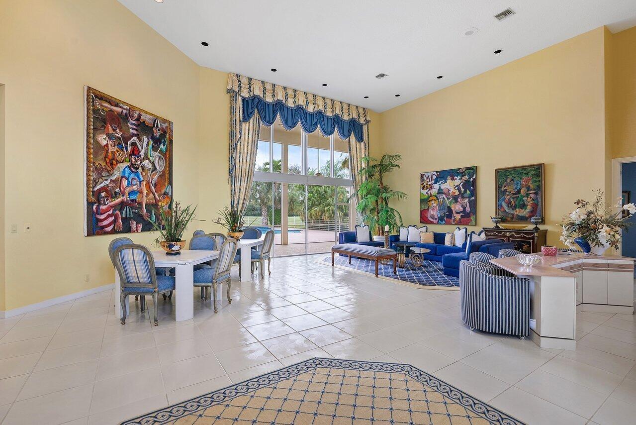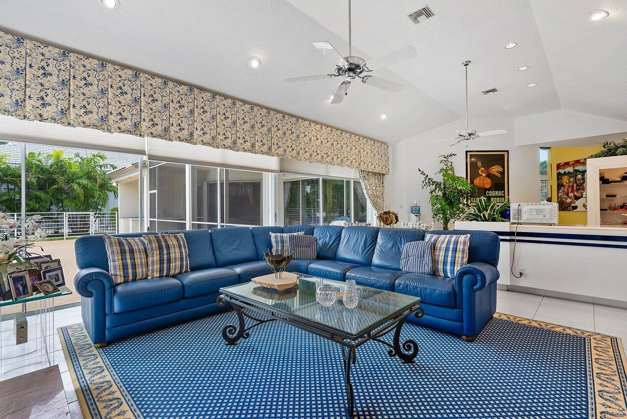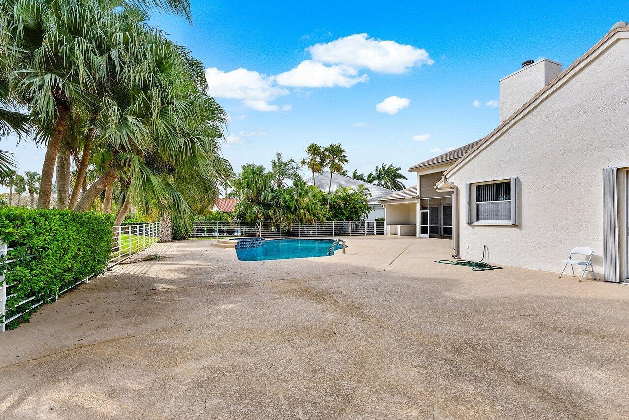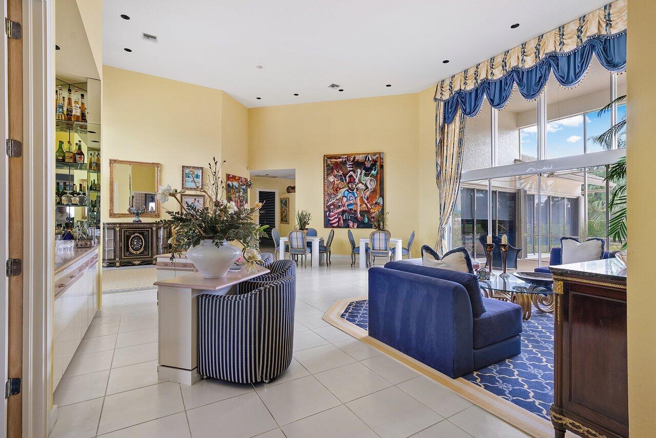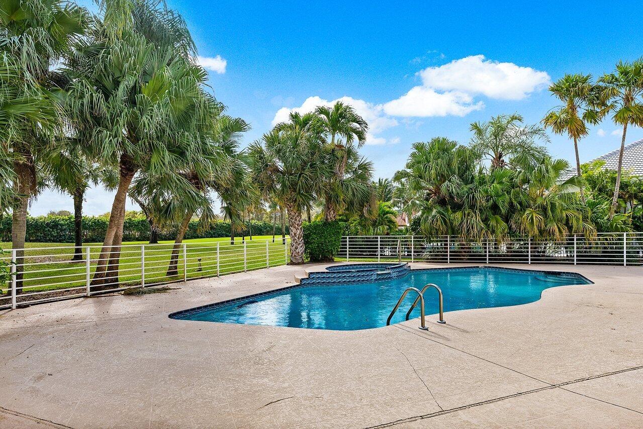 Over 4000 square feet with soaring ceilings and high windows! Spacious split bedrooms - each with ensuite bathrooms plus a large office (has 1/2 bath attached can be 4TH BEDROOM). Primary bedroom boasts his & her bathrooms & two large walk-in closets. Beautiful family room off kitchen has fireplace and natural light from the floor-ceiling windows. A screened porch leads to a spectacular pool & patio with gorgeous golf course views. Great layout! Roof replaced in 2021 - contemporary flat tile! Full hurricane shutter protection & Generator! Desirable boutique Bocaire Country Club is mandatory membership including GOLF - active and inclusive community with high end amenities. Bocaire is eastern club close to beach, restaurants, I95, shopping and in an A rated school district!