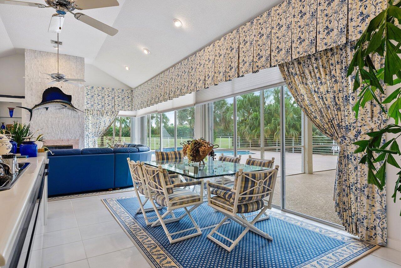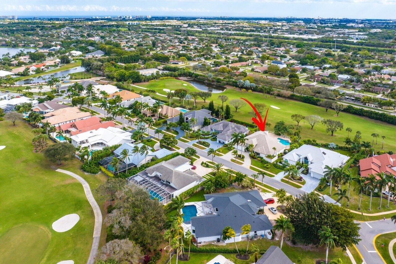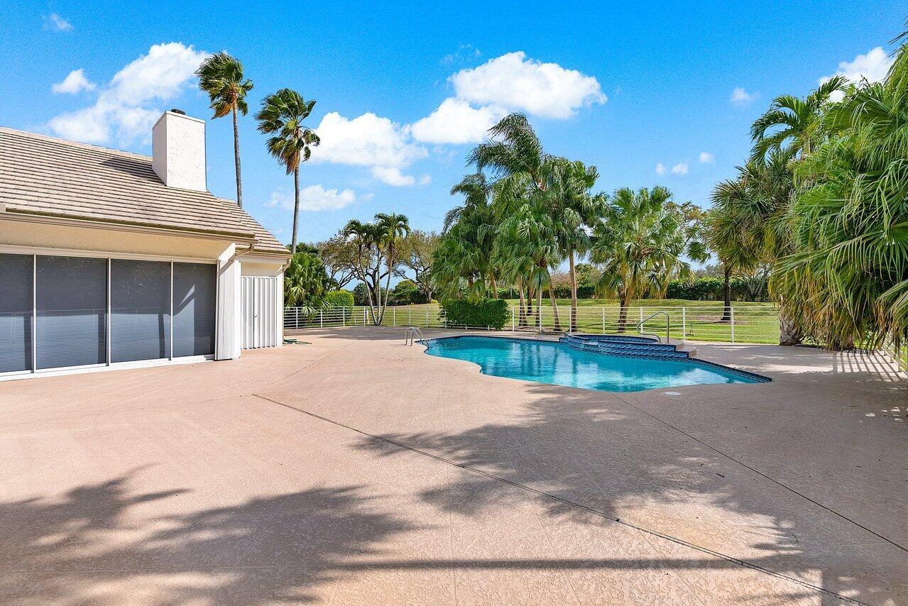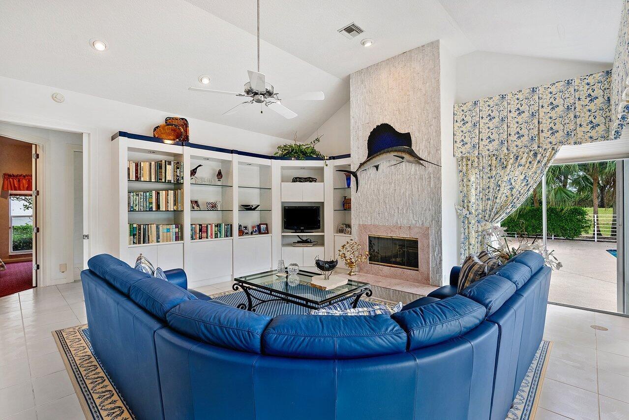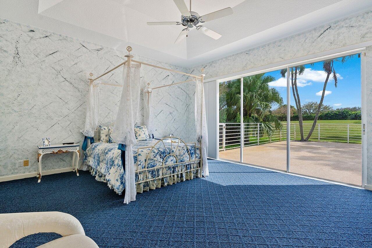 Over 4000 square feet with soaring ceilings and high windows! Spacious split bedrooms - each with ensuite bathrooms plus a large office (has 1/2 bath attached can be 4TH BEDROOM). Primary bedroom boasts his & her bathrooms & two large walk-in closets. Beautiful family room off kitchen has fireplace and natural light from the floor-ceiling windows. A screened porch leads to a spectacular pool & patio with gorgeous golf course views. Great layout! Roof replaced in 2021 - contemporary flat tile! Full hurricane shutter protection & Generator! Desirable boutique Bocaire Country Club is mandatory membership including GOLF - active and inclusive community with high end amenities. Bocaire is eastern club close to beach, restaurants, I95, shopping and in an A rated school district!