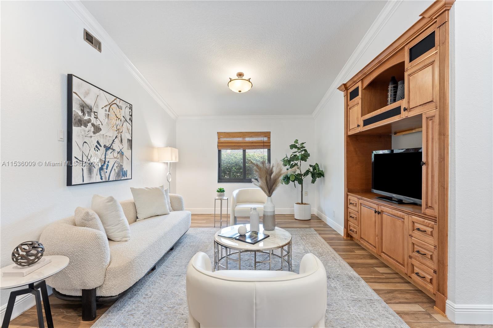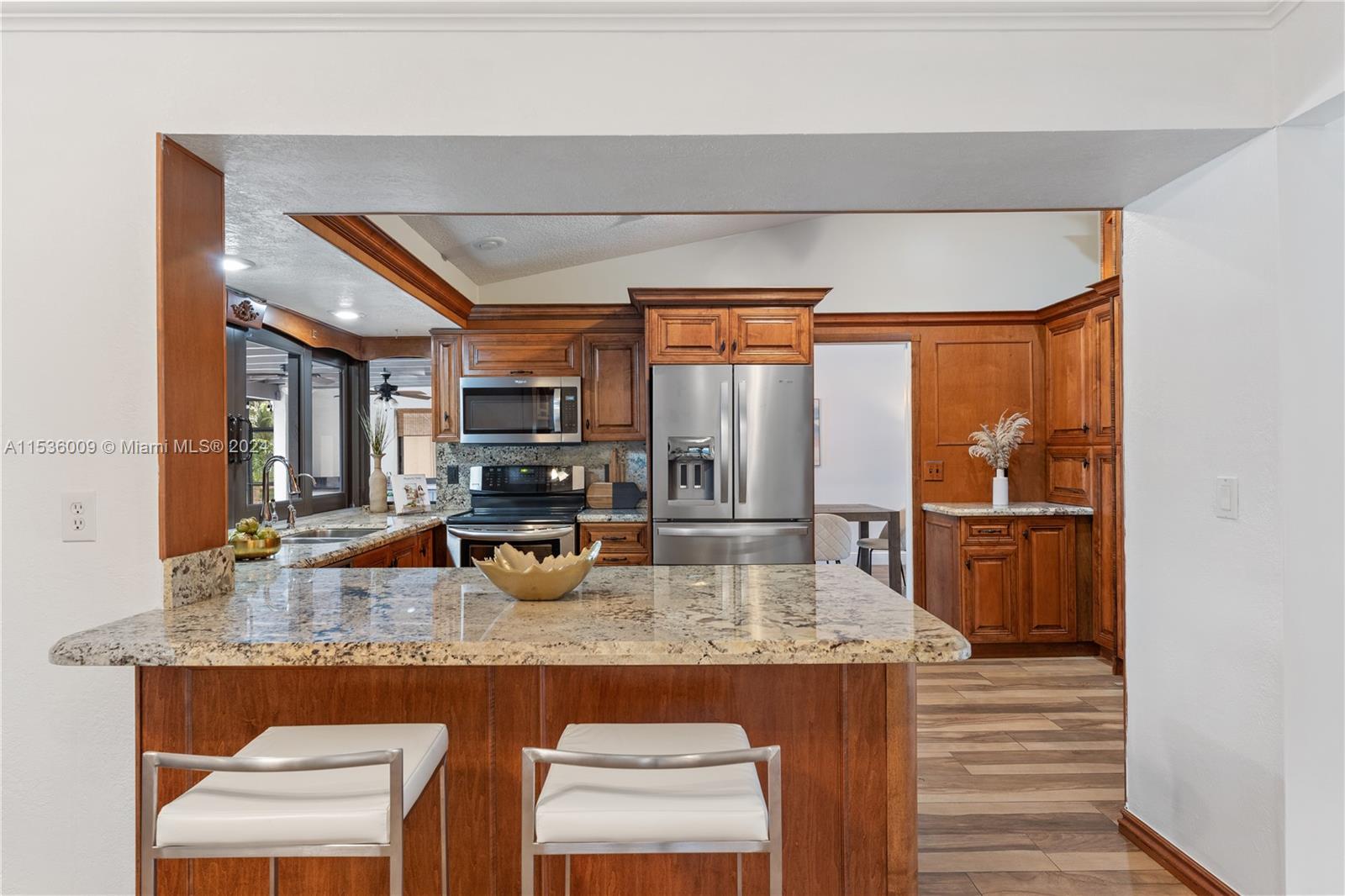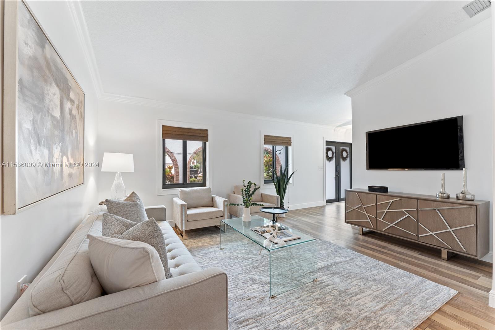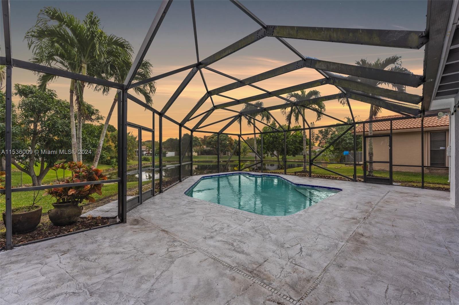 Experience luxury in this meticulously maintained ranch-style home in prestigious Jacaranda Lakes. With four bedrooms and three full bathrooms, the residence offers comfortable living space and breathtaking water views. The updated custom kitchen features incredible storage, space and top-of-the-line appliances. Updated bathrooms add sophistication and skylights offer ample natural light, illuminating tile floors throughout. Impact windows and doors enhance security and energy efficiency. The pool, nestled in a screened lanai, overlooks the serene lake, complemented by a built-in bar/outdoor kitchen area, perfect for entertaining. Centrally located near shops, dining, entertainment and the renowned American Heritage School, this upscale gem with a thoughtful design awaits its new owner!