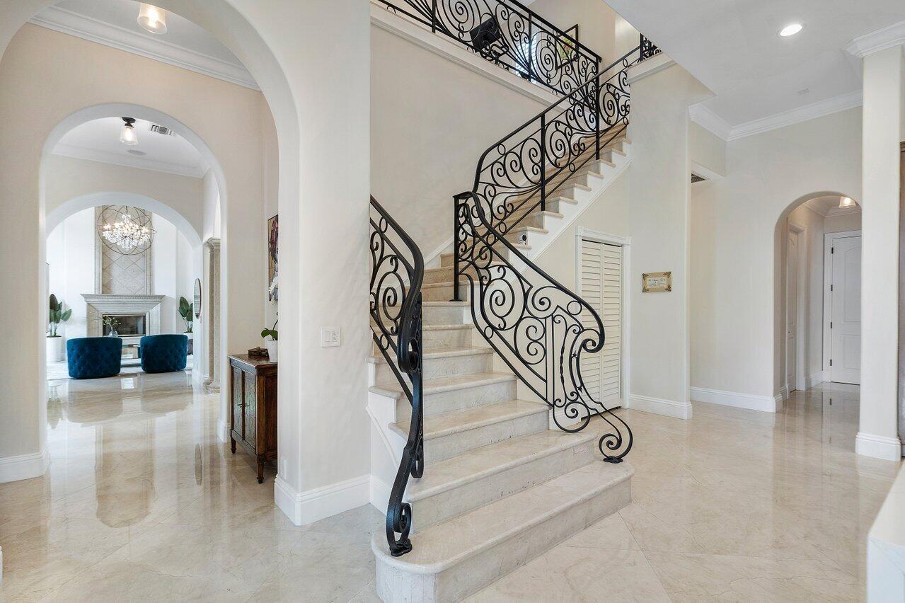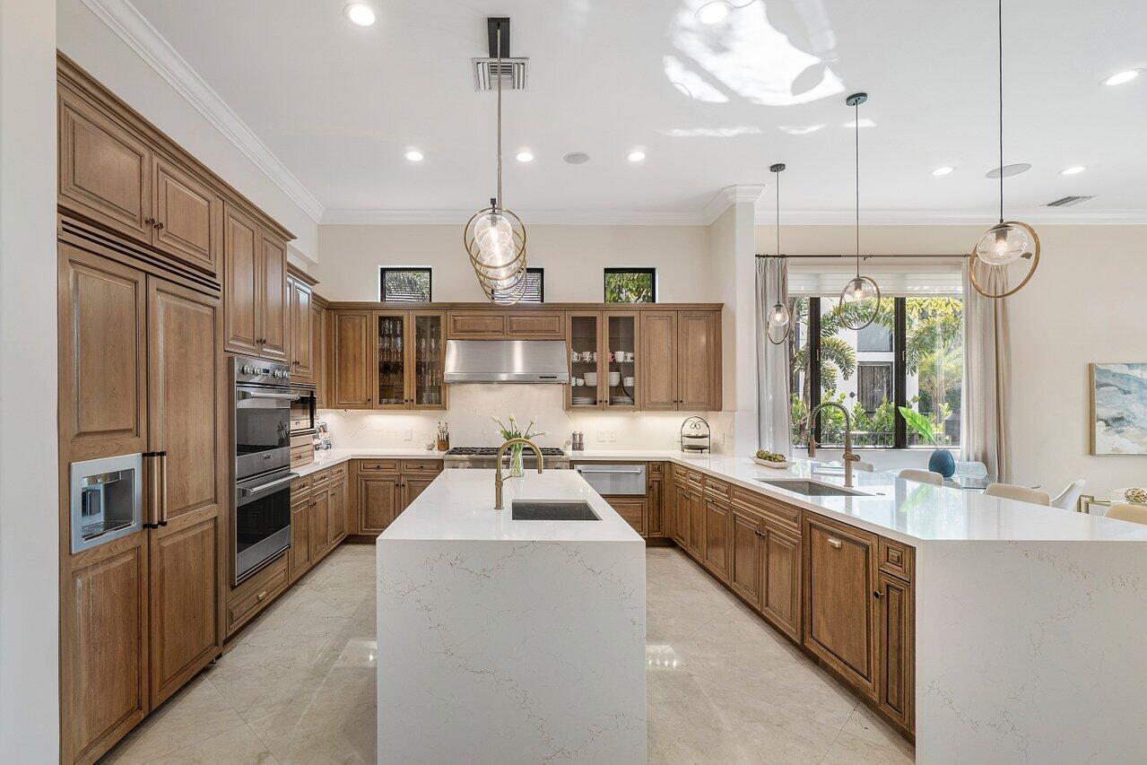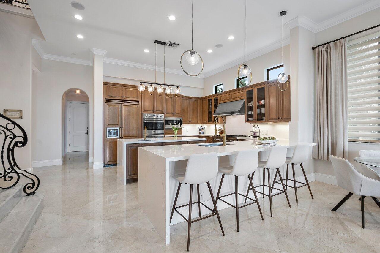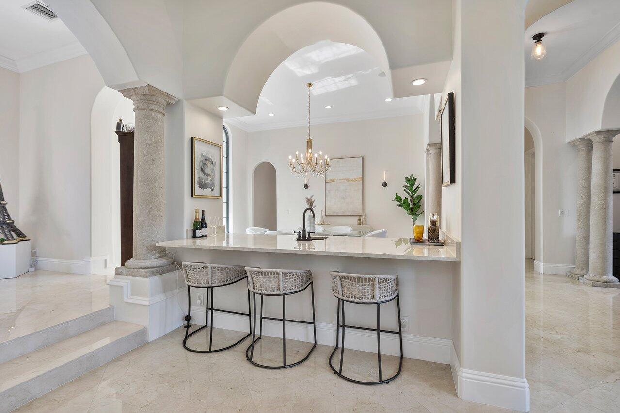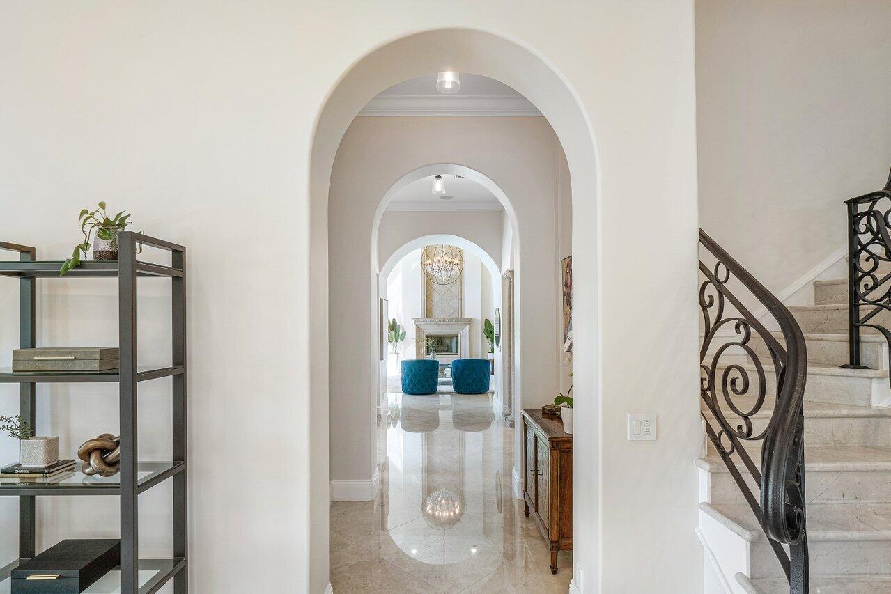 A superb blend of understated elegance and incredible craftsmanship can be found in this exquisite custom home. An arched wrought iron and glass door welcomes you into the elegant foyer which reveals the spacious and light filled living room. With 20 foot high ceilings, a gas fireplace flanked by arched windows, 2 additional arched windows and glass double doors leading to the patio, this tranquil and spectacular room invites gatherings to flow to the open two sided wet bar and generous dining room with a floor to ceiling wine refrigerator. The office has handsome classic details including wide plank flooring and french doors opening to the patio. A newly remodeled gourmet chef's kitchen is sleek and sensational. Stunning quartz countertops and backsplash, waterfall edging, top of the lin