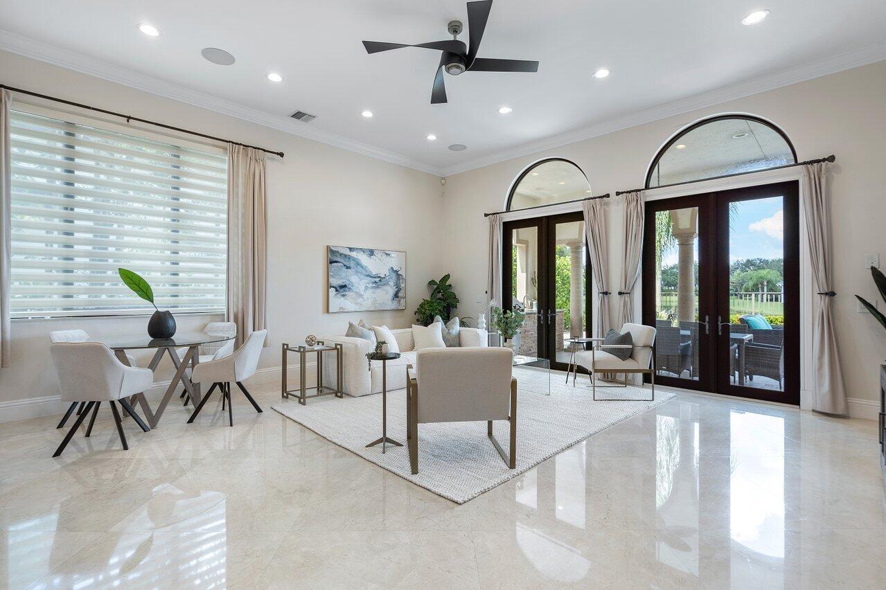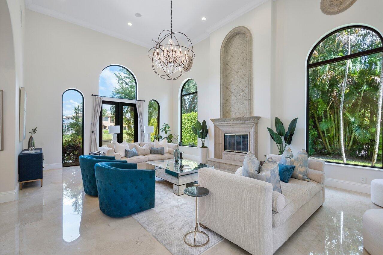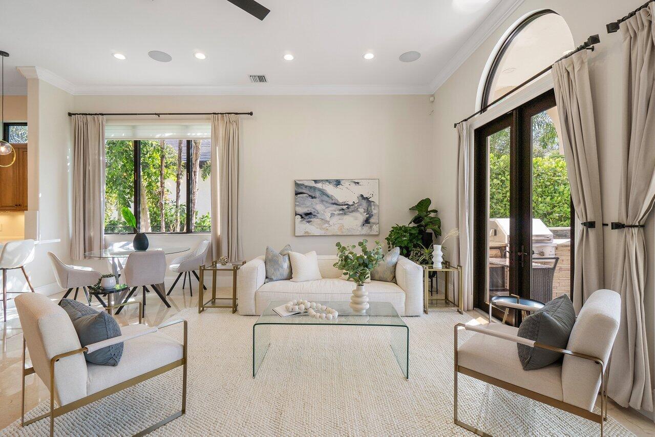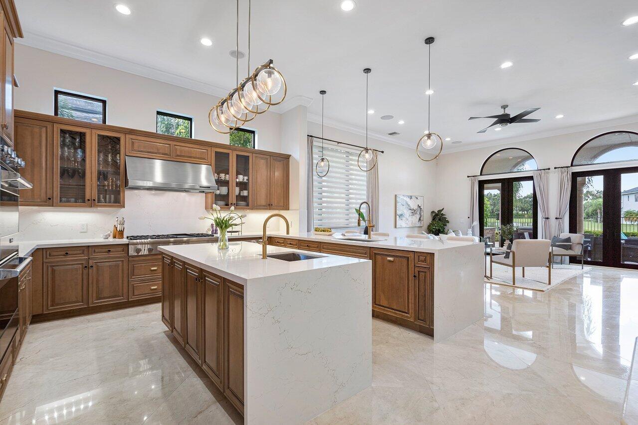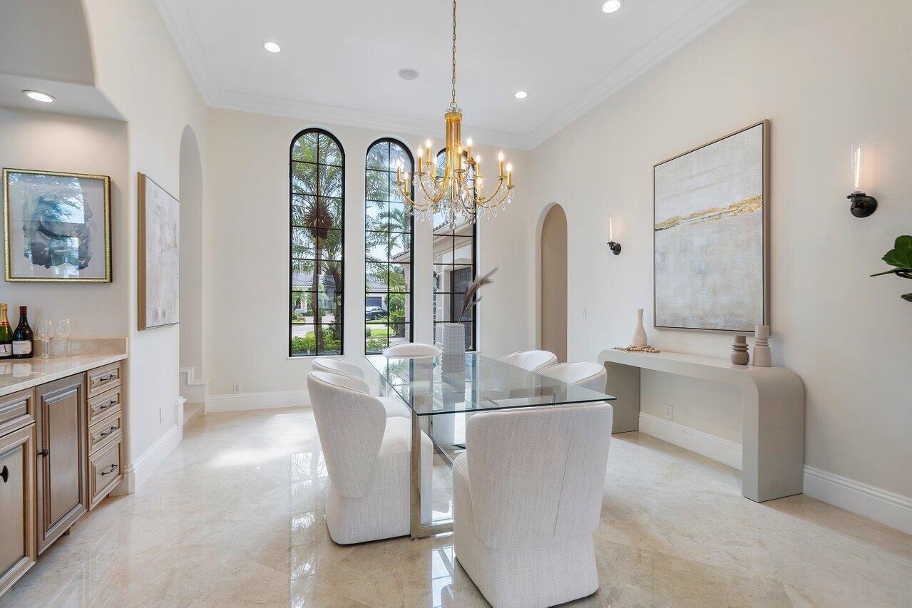 A superb blend of understated elegance and incredible craftsmanship can be found in this exquisite custom home. An arched wrought iron and glass door welcomes you into the elegant foyer which reveals the spacious and light filled living room. With 20 foot high ceilings, a gas fireplace flanked by arched windows, 2 additional arched windows and glass double doors leading to the patio, this tranquil and spectacular room invites gatherings to flow to the open two sided wet bar and generous dining room with a floor to ceiling wine refrigerator. The office has handsome classic details including wide plank flooring and french doors opening to the patio. A newly remodeled gourmet chef's kitchen is sleek and sensational. Stunning quartz countertops and backsplash, waterfall edging, top of the lin