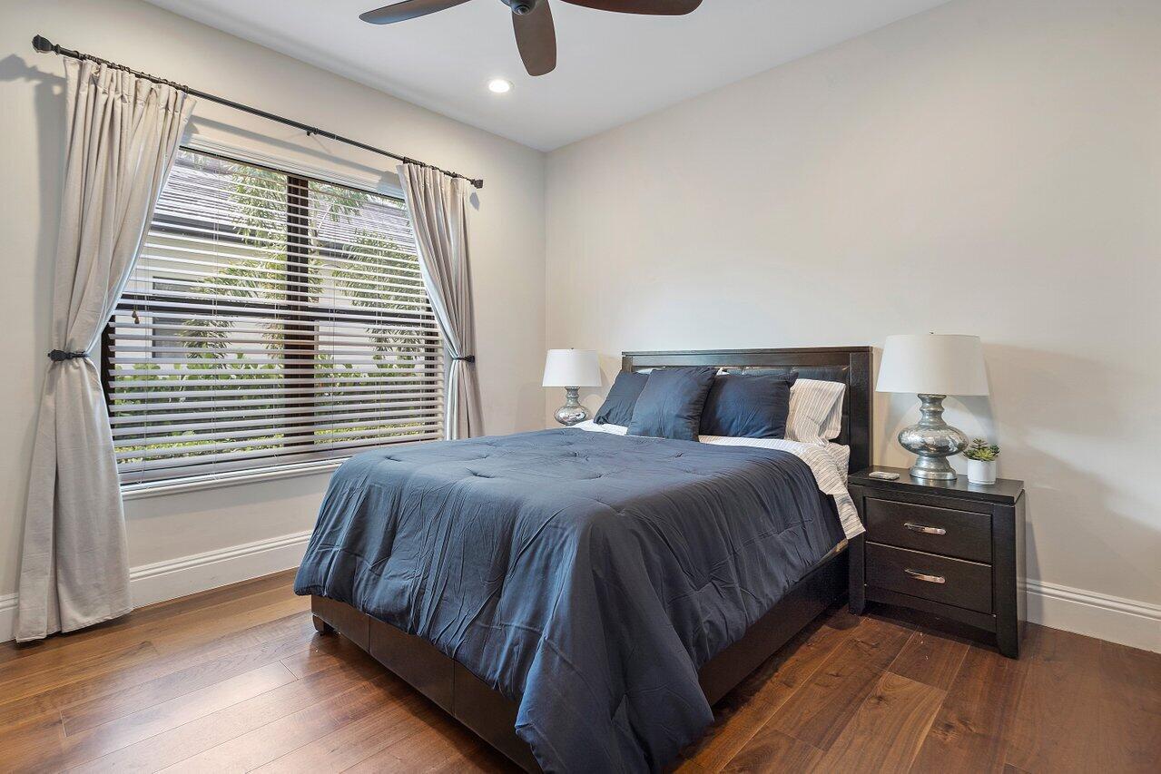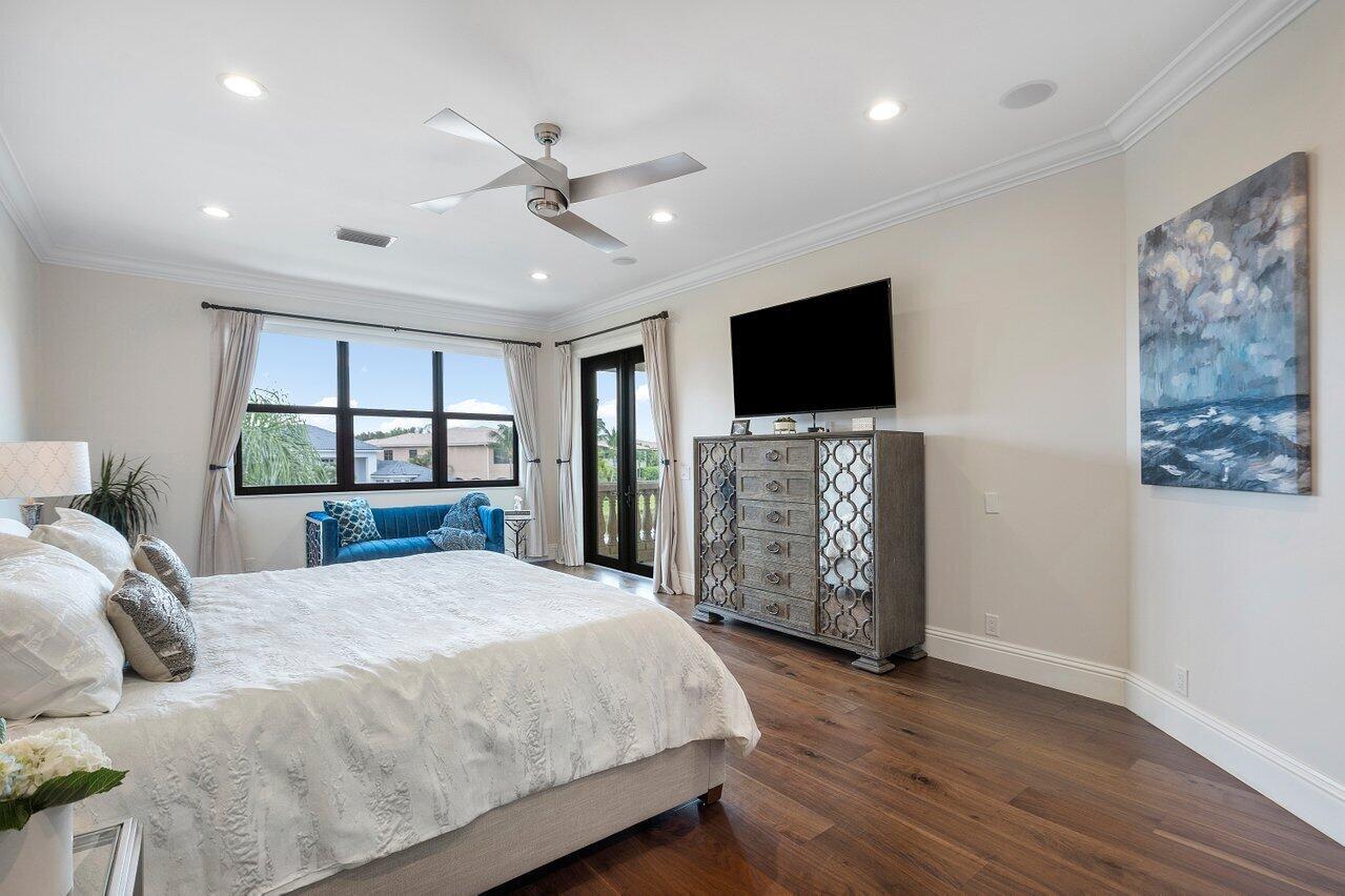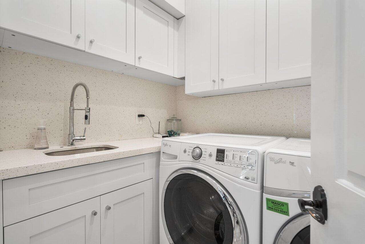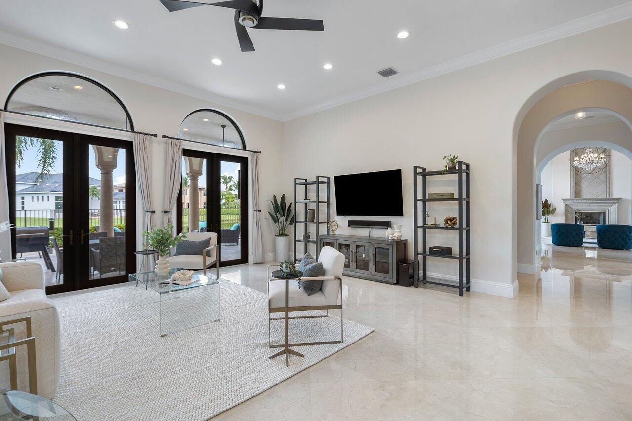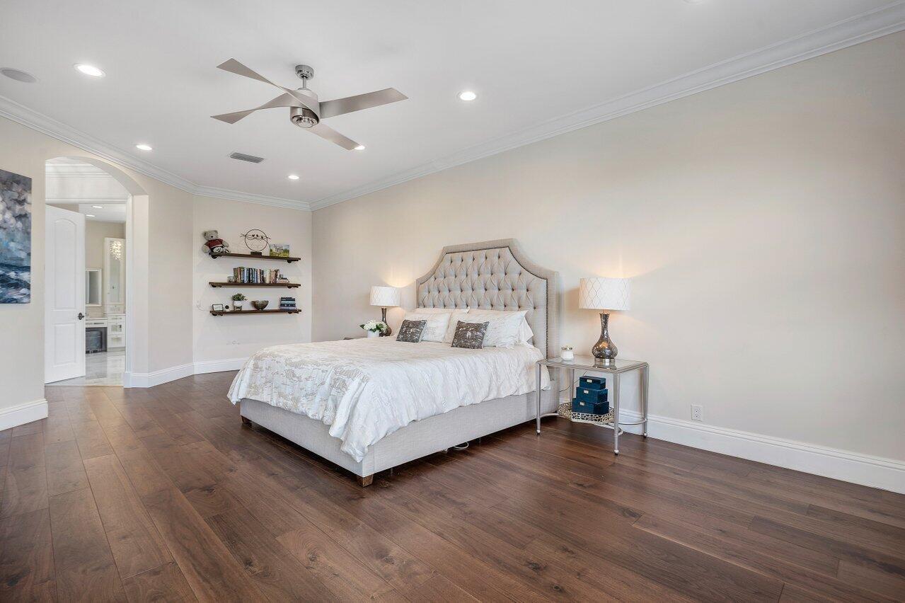 A superb blend of understated elegance and incredible craftsmanship can be found in this exquisite custom home. An arched wrought iron and glass door welcomes you into the elegant foyer which reveals the spacious and light filled living room. With 20 foot high ceilings, a gas fireplace flanked by arched windows, 2 additional arched windows and glass double doors leading to the patio, this tranquil and spectacular room invites gatherings to flow to the open two sided wet bar and generous dining room with a floor to ceiling wine refrigerator. The office has handsome classic details including wide plank flooring and french doors opening to the patio. A newly remodeled gourmet chef's kitchen is sleek and sensational. Stunning quartz countertops and backsplash, waterfall edging, top of the lin