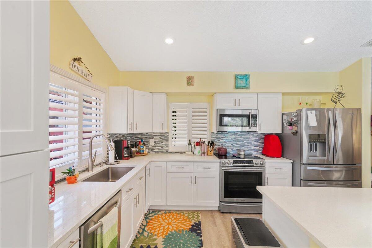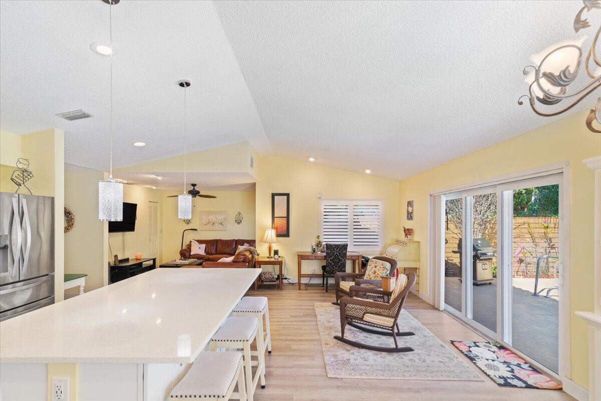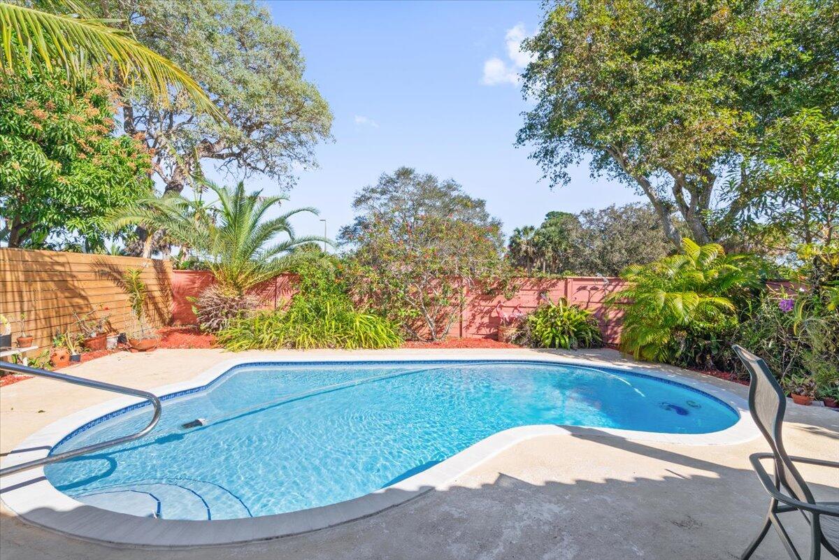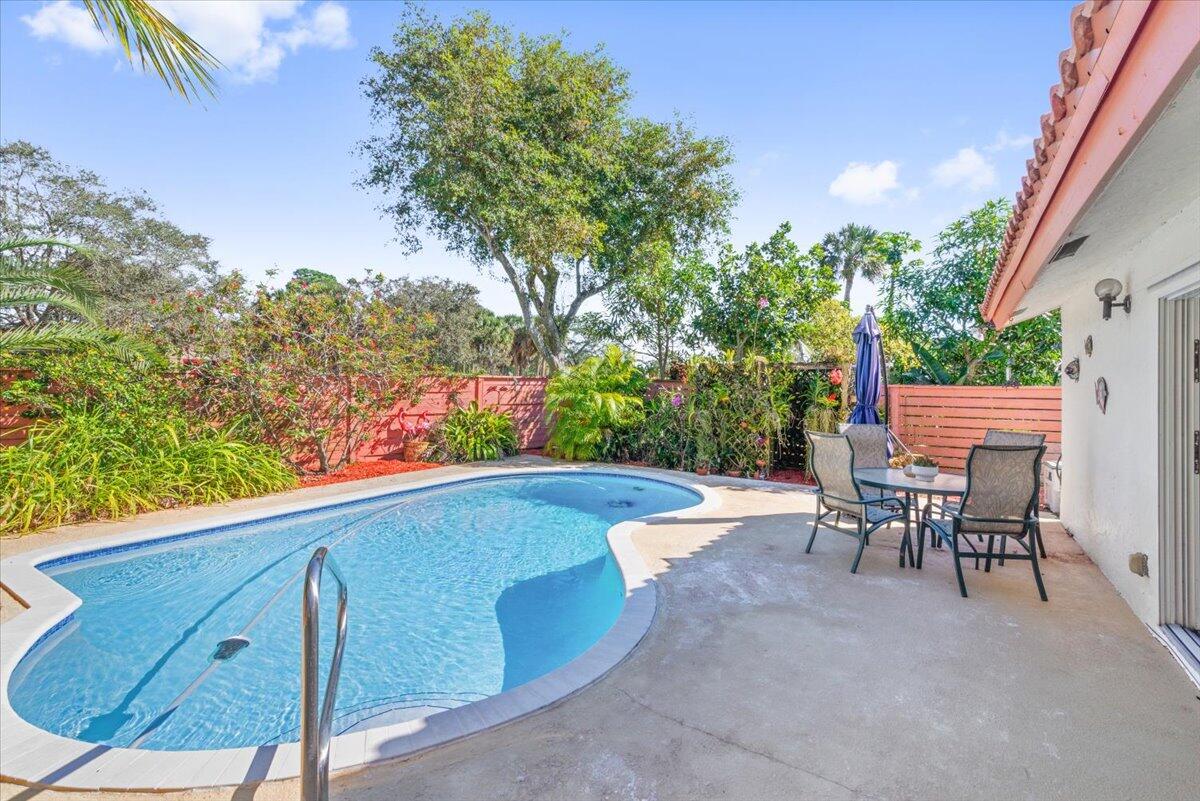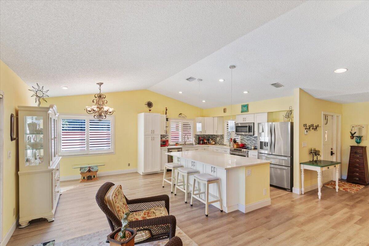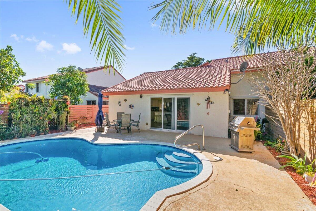 Come see this charming 2 bed/2 bath 1,479 sqft single-story townhouse w/ a pool, hurricane/impact windows/doors, recently updated kitchen w/ stainless steel appliances & sink, quartz countertops, a large island for entertaining, all new white cabinets & pantry w/ plenty of storage. The open concept makes entertaining easy & gives views of the pool from the kitchen, dining, & living area. A third bedroom can be added by enclosing part of the living area or converting the garage. The pool is 23 ft long x 16 ft wide x 6 ft deep. Resurfaced pool in March 2022. New electrical panel installed in 2020, new impact windows/doors installed in 2019, and the roof is from 2013.This home is conveniently located making it a highly desirable. 3 grocery stores (Winn-Dixie/The Grove Kosher Market/Publix),
