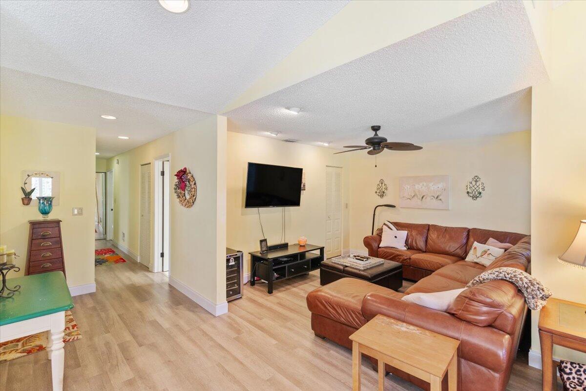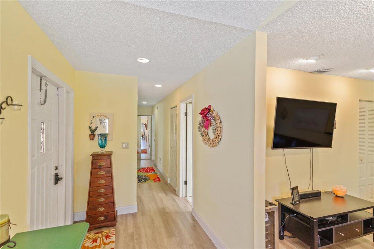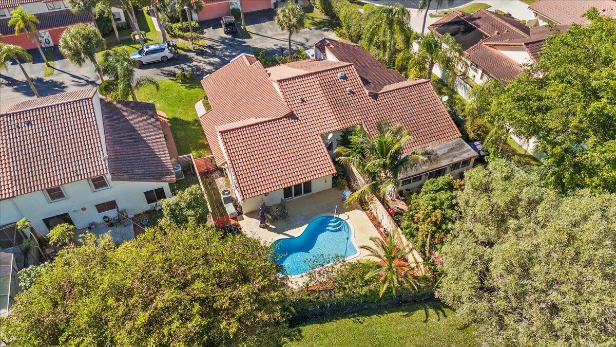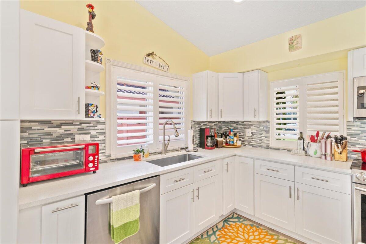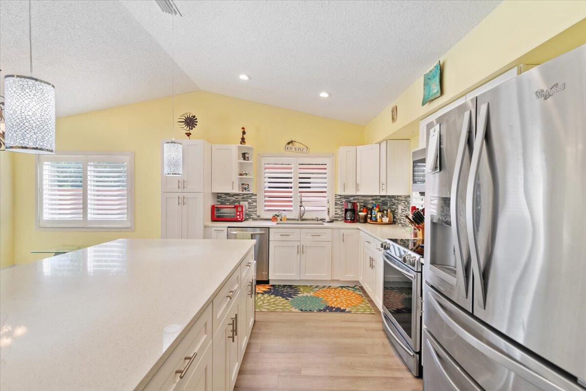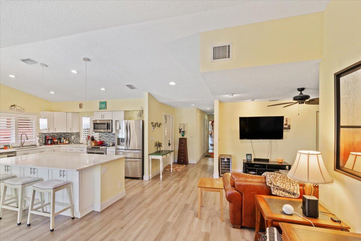 Come see this charming 2 bed/2 bath 1,479 sqft single-story townhouse w/ a pool, hurricane/impact windows/doors, recently updated kitchen w/ stainless steel appliances & sink, quartz countertops, a large island for entertaining, all new white cabinets & pantry w/ plenty of storage. The open concept makes entertaining easy & gives views of the pool from the kitchen, dining, & living area. A third bedroom can be added by enclosing part of the living area or converting the garage. The pool is 23 ft long x 16 ft wide x 6 ft deep. Resurfaced pool in March 2022. New electrical panel installed in 2020, new impact windows/doors installed in 2019, and the roof is from 2013.This home is conveniently located making it a highly desirable. 3 grocery stores (Winn-Dixie/The Grove Kosher Market/Publix),