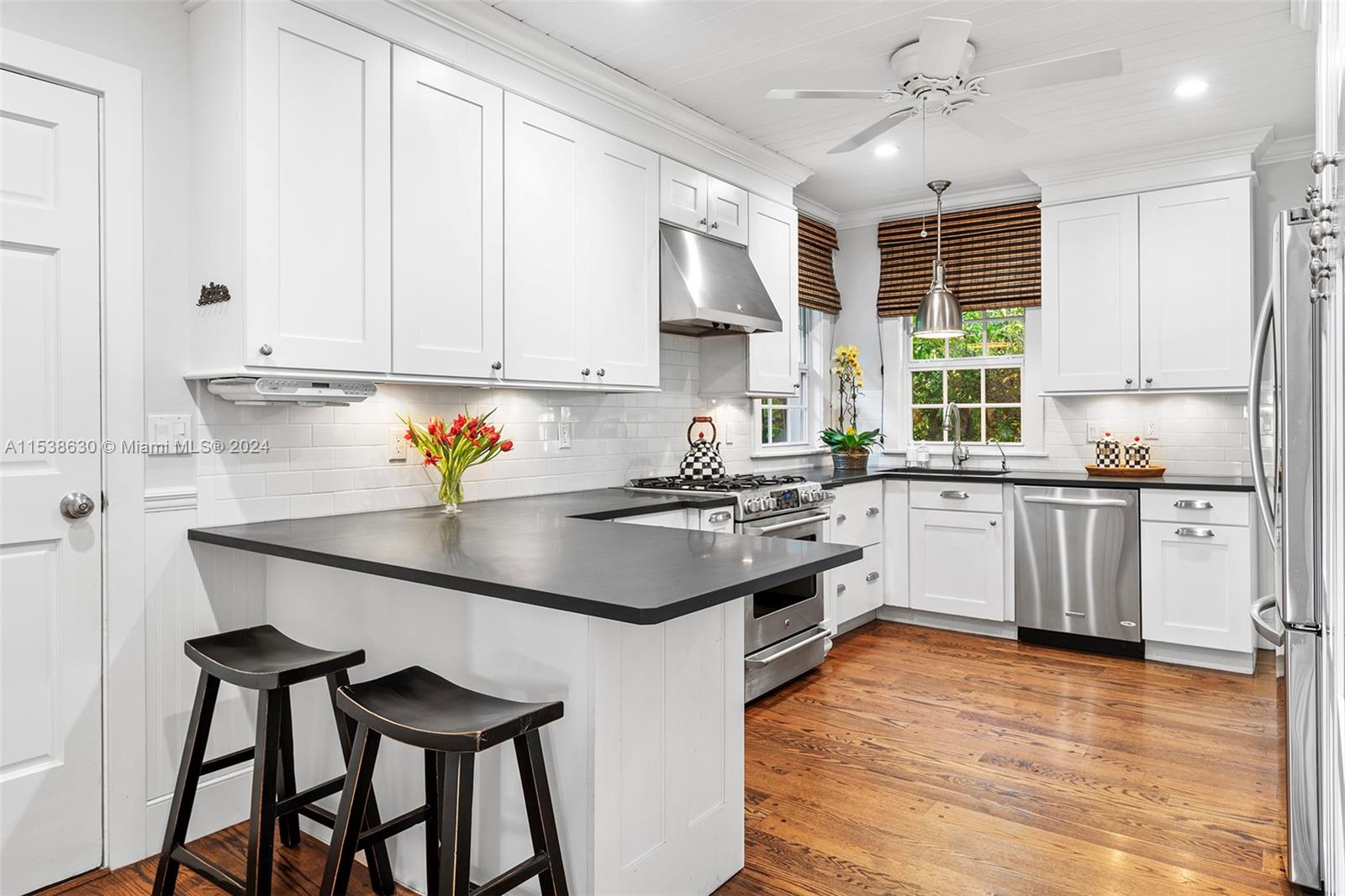 Absolutely beautiful & perfectly located in the Golden Triangle, this 5 BR, 3 BA 3,069 SF home features timeless design coupled w/ modern updates! Enter the grand formal living room w/ working fireplace & beautiful built-ins that flows seamlessly into the sun-drenched dining rm. The updated kitchen hits all the right notes w/ white cabinets, sleek counters & stainless steel appliances including gas range, & it opens to the comfortable family room – the perfect hangout spot! Ultra-serene, the primary suite includes 2 closets & a BA w/ dual vanities, sep tub & shower. The 14,822 SF lot is lush & private w/ majestic oaks & wonderful spots for seating & dining. Inside find 4 add’l BRs, 2 more renovated BAs, laundry, garage, oak flrs, impact windows & more. This is the Gables at its finest!