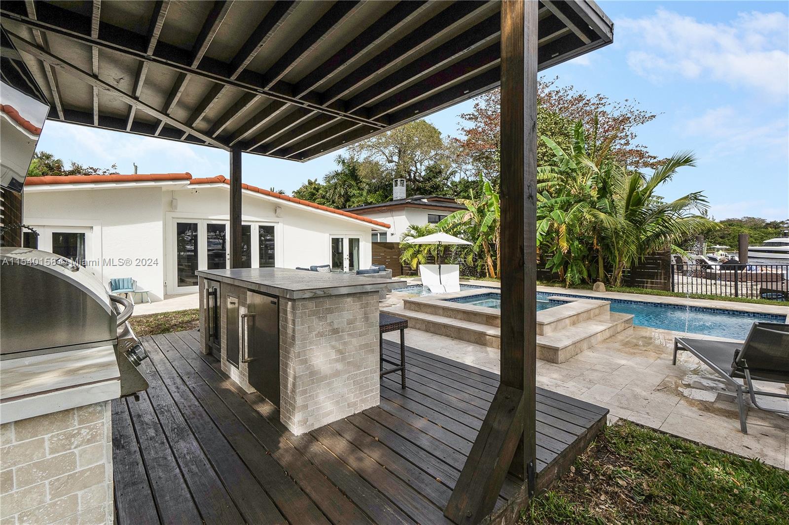 Welcome to your waterfront paradise. This meticulously renovated home offers a luxurious retreat with a 60-foot deepwater dock, perfect for boating enthusiasts. The outdoor space is an entertainer's dream, featuring an outdoor kitchen, JetSki lift, solid wood privacy fence heated saltwater pool surrounded by travertine tile, hot tub and a full Sonos surround sound system. The property boasts an array of modern amenities including impact windows, new AC, a $70,000 kitchen renovation w/brand new appliances, porcelain wood-look tile, recessed lighting, vaulted ceilings, renovated bathrooms and bedrooms... all adding to the allure of this stunning home. This property offers the perfect blend of luxury and functionality. Don't miss the opportunity to call this remarkable residence your own.