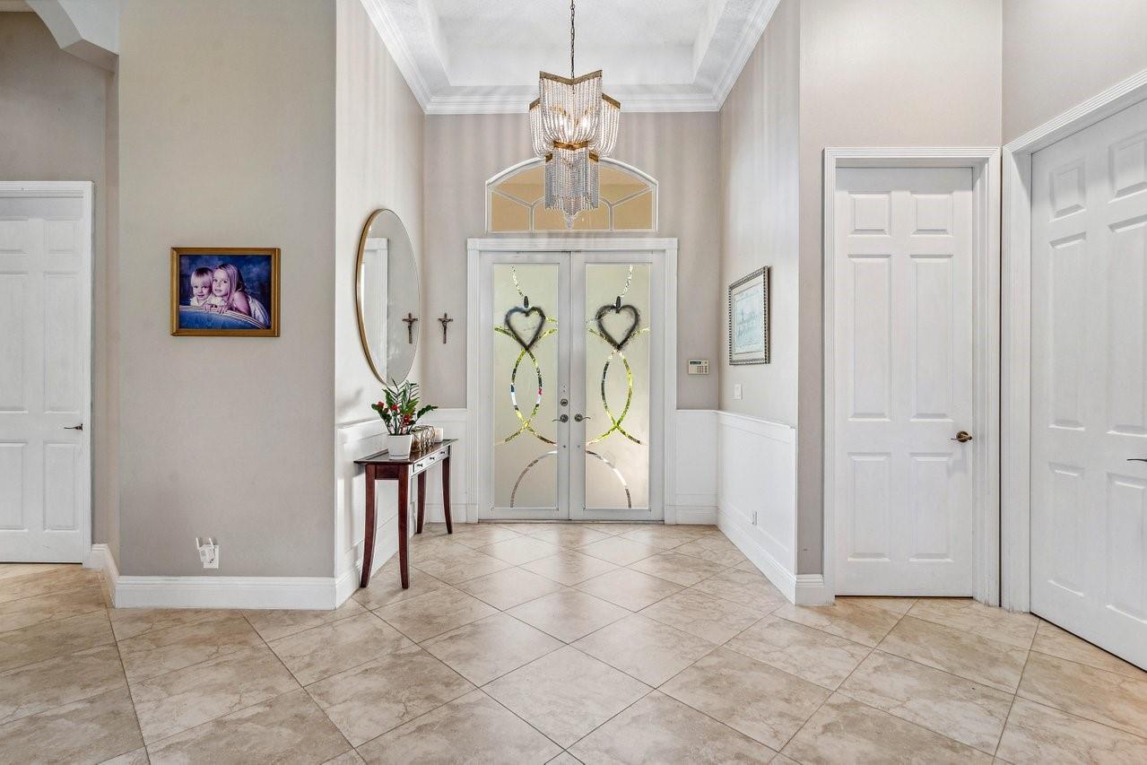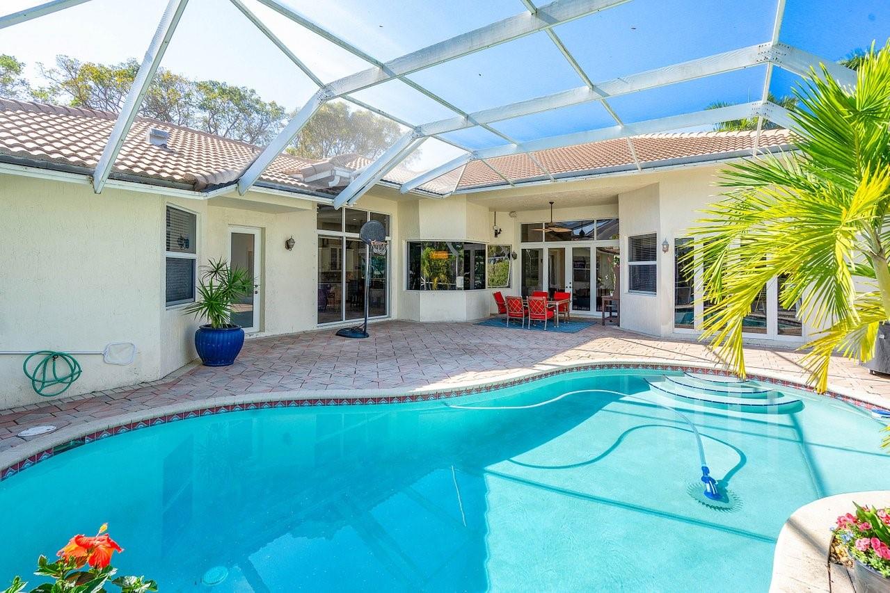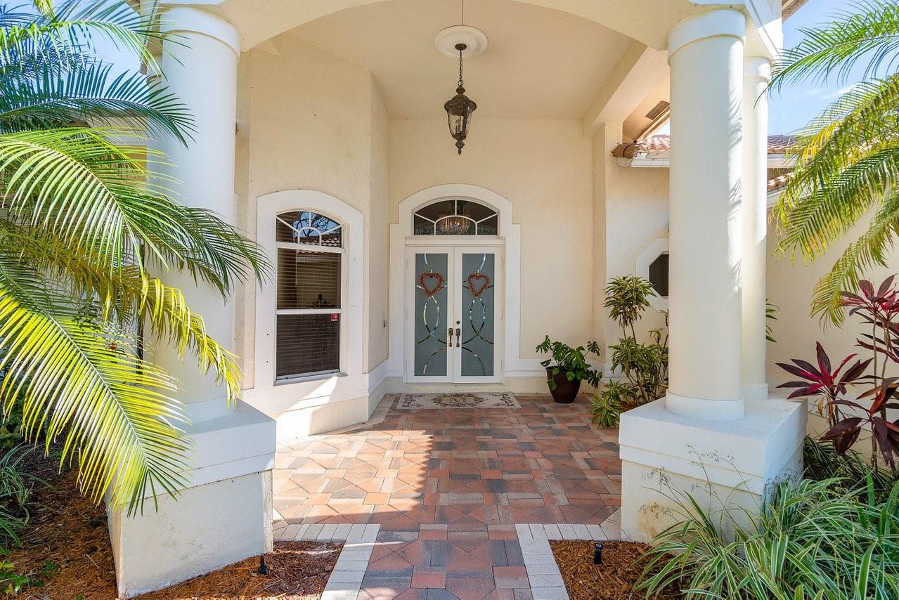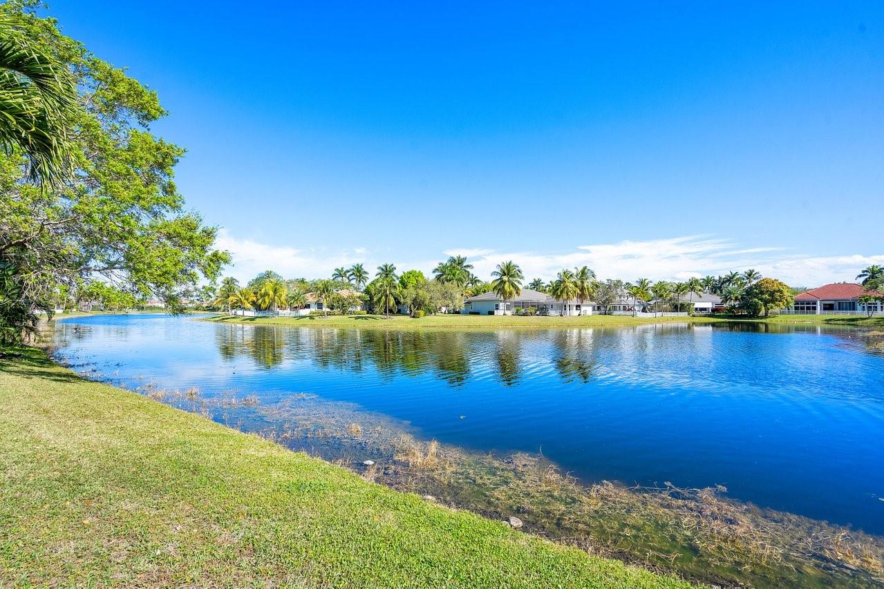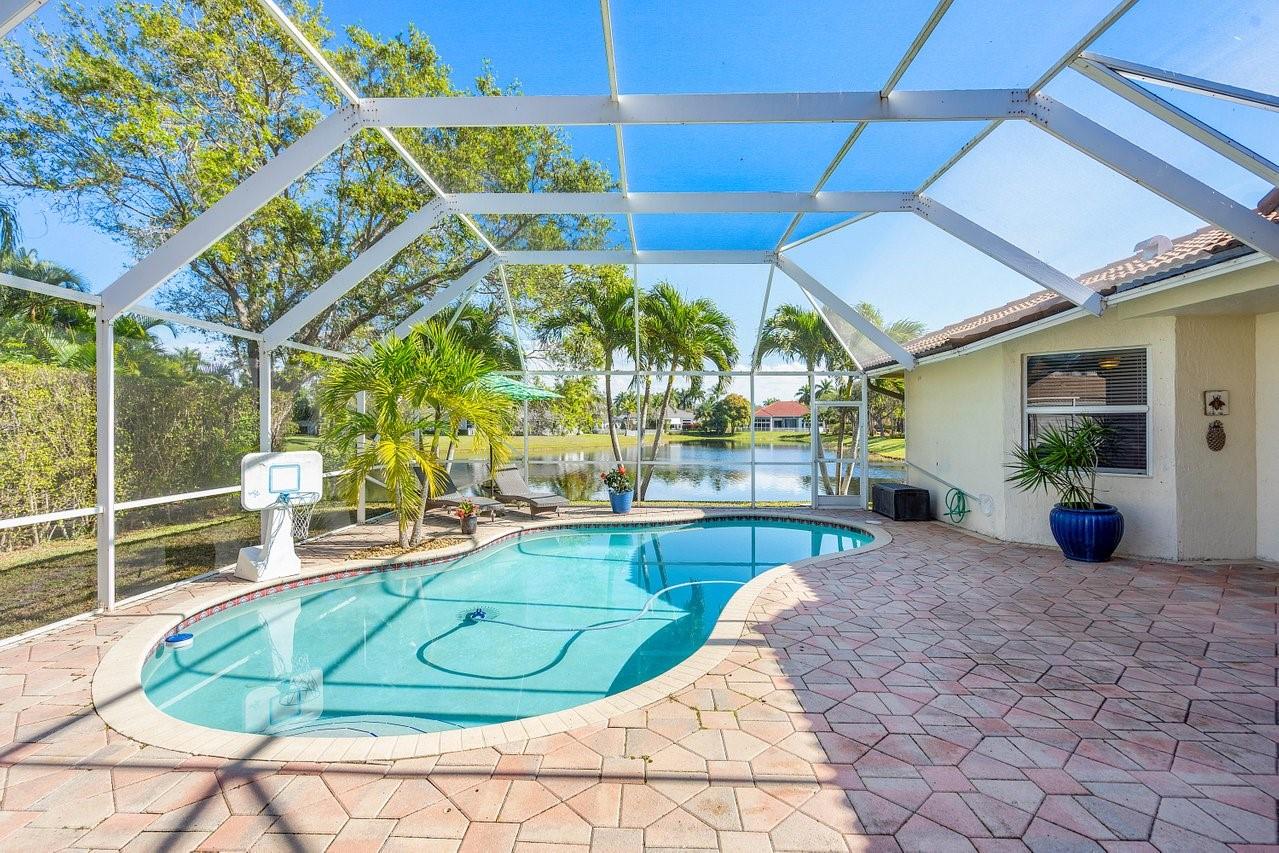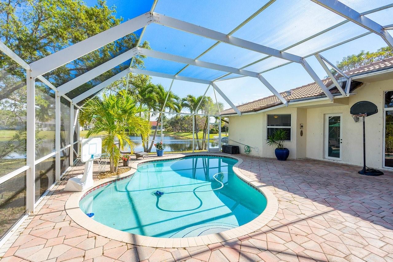 Stunning panoramic lake views take centerstage throughout this beautiful estate home with a 2019 ROOF. Soaring ceilings, expansive windows/glass doors, spacious open living areas, a light & airy interior, huge lanai with saltwater pool & tropical outdoor areas resulted in a quintessential Florida water front home! Perfect for indoor/outdoor living. Impressive curb appeal with a sprawling oversize corner lot, portico entry & double glass doors. Large granite island kitchen overlooks a sizeable family room with SS appliances and eat in breakfast area. Primary suite with spa bath. Beautiful millwork & plantation shutters add to its splendor. Fox Ridge offers a 24-hour manned guard gate, tennis courts, volleyball court & playground w/low HOA fees. Walking distance to all A-rated schools