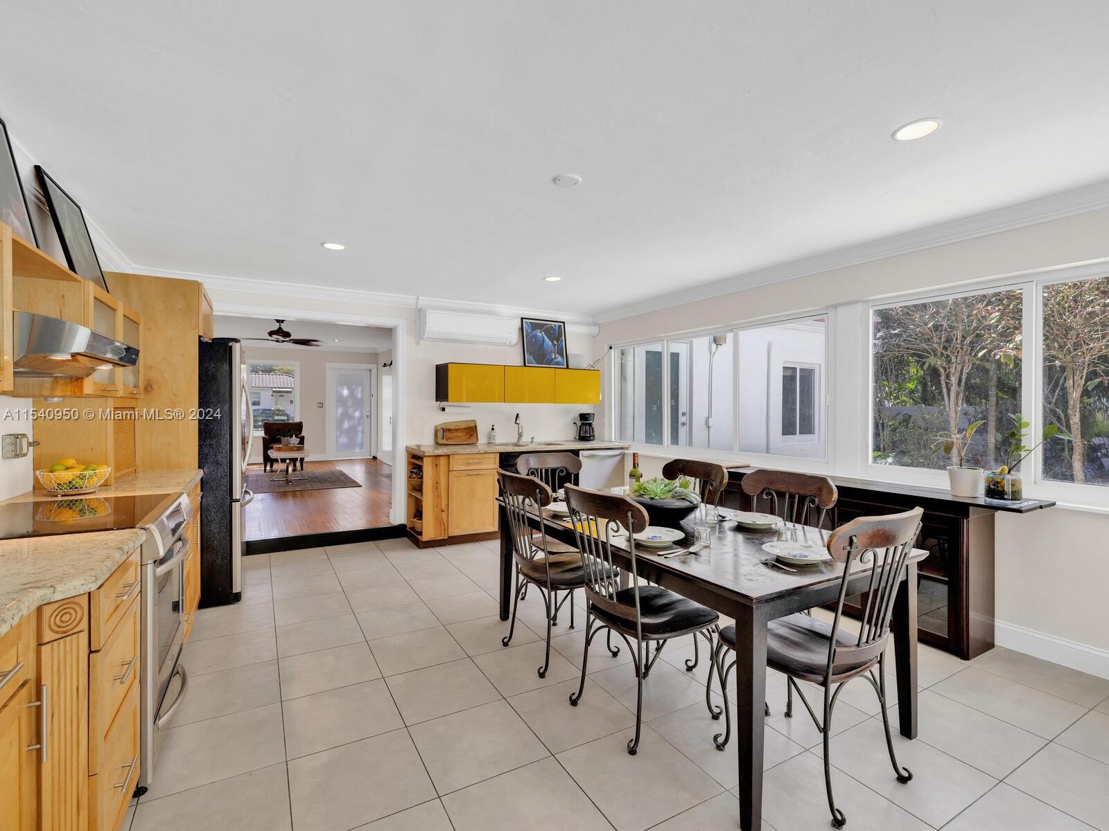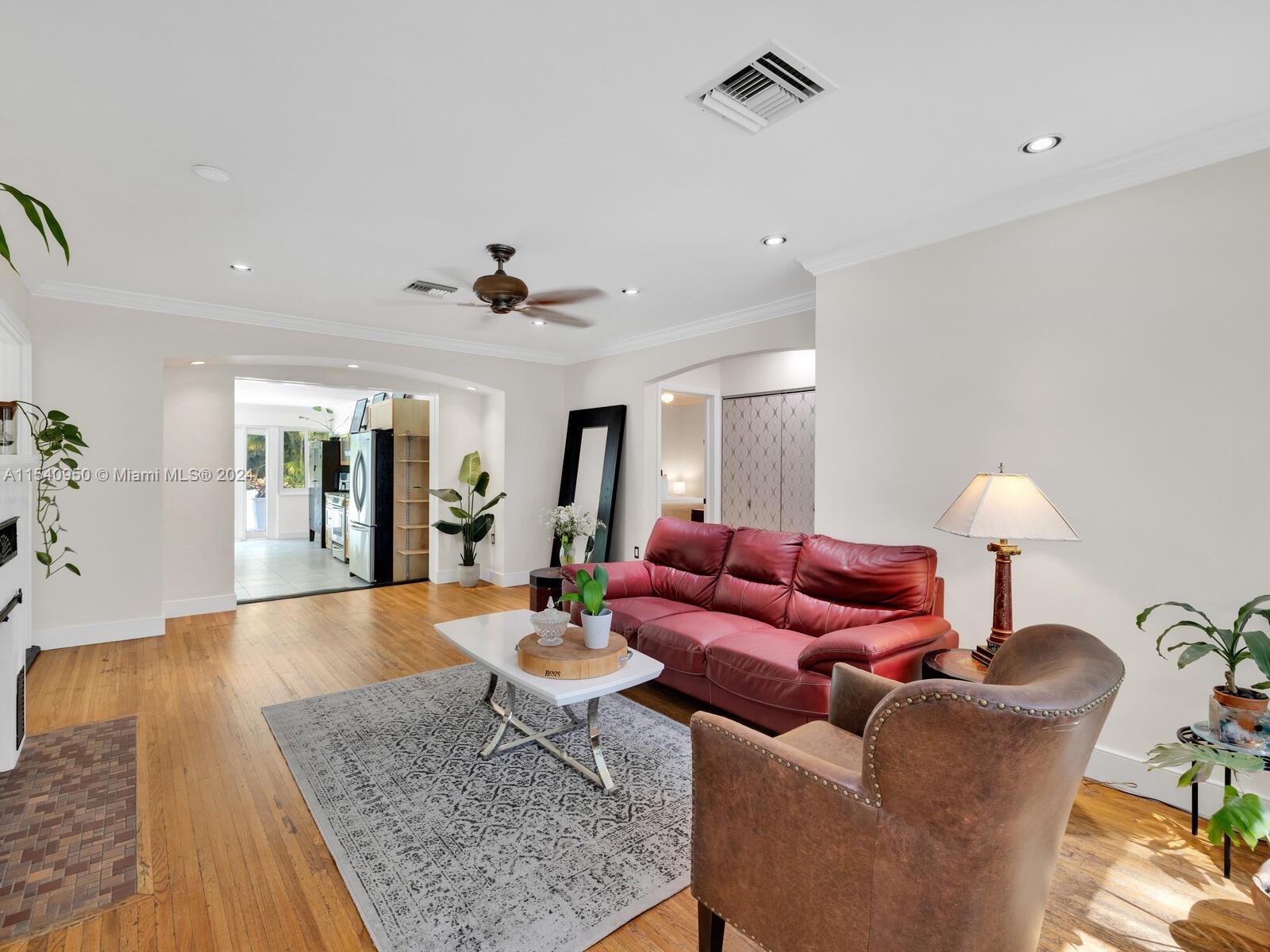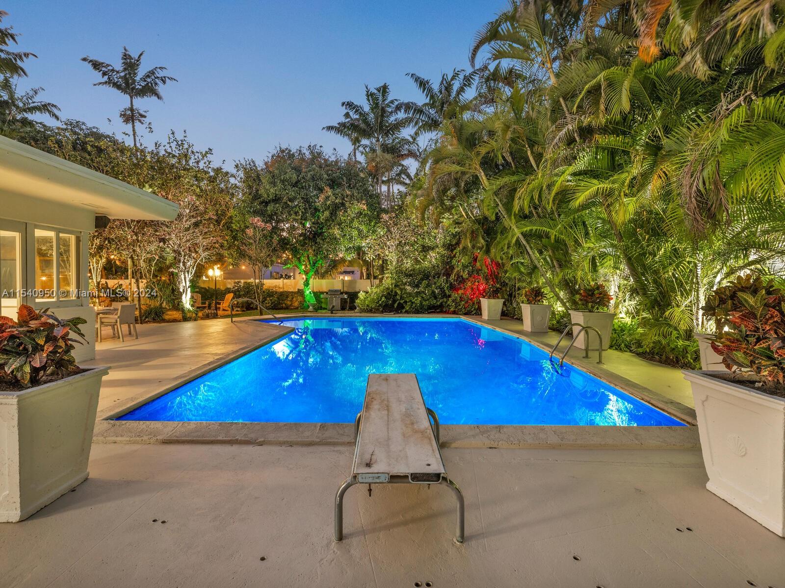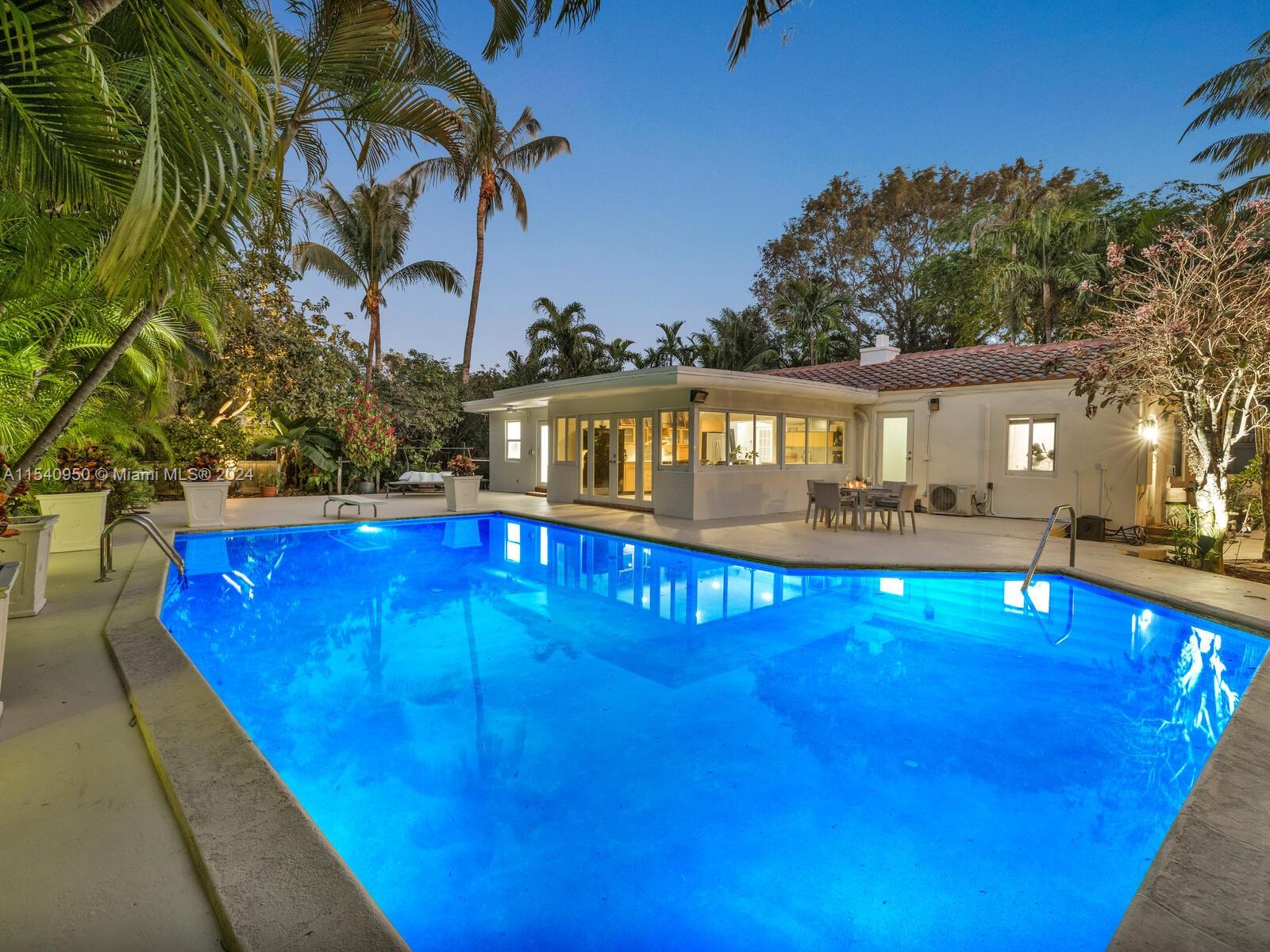 Welcome to Shores Casa Serena! Enter through a dreamy front porch into grand open living with fireplace, hardwood floors and large bright dining kitchen with wraparound windows overlooking the sparkling pool. Three beds with three full baths, including the principal ensuite retreat with large cabana bath and walk-in shower, plus a bonus office den. Venture outside to the expansive 11,500 SF lot, with lush gardens, an oversized trapezoidal pool, sprawling pool deck and your very own “fruit tree forest” with mango, avocado, sapodilla, guava and banana trees! Great features: authentic mid-century modern character; impact windows-doors; new barrel tile roof. All with unlimited upside in a fantastic non-flood zone location on a quiet, tree-lined street, just two blocks to downtown Miami Shores.