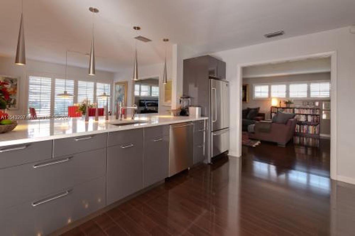 Hard to find, immaculate and completely updated family home on a quiet street. Modern kitchen with high-end appliances, modern bathrooms, open floor plan, gleaming wood floors throughout and plantation shutters on windows. Beautifully landscaped yard on a serene canal. Inviting and spacious pool and patio with complete privacy. Superb location in best school district. New roof, new AC ducts and sleeved pipes. Per Appraiser Living Area = 2,493 and Adjusted = 3,003 *** See Broker Remarks for Showing Instructions ***