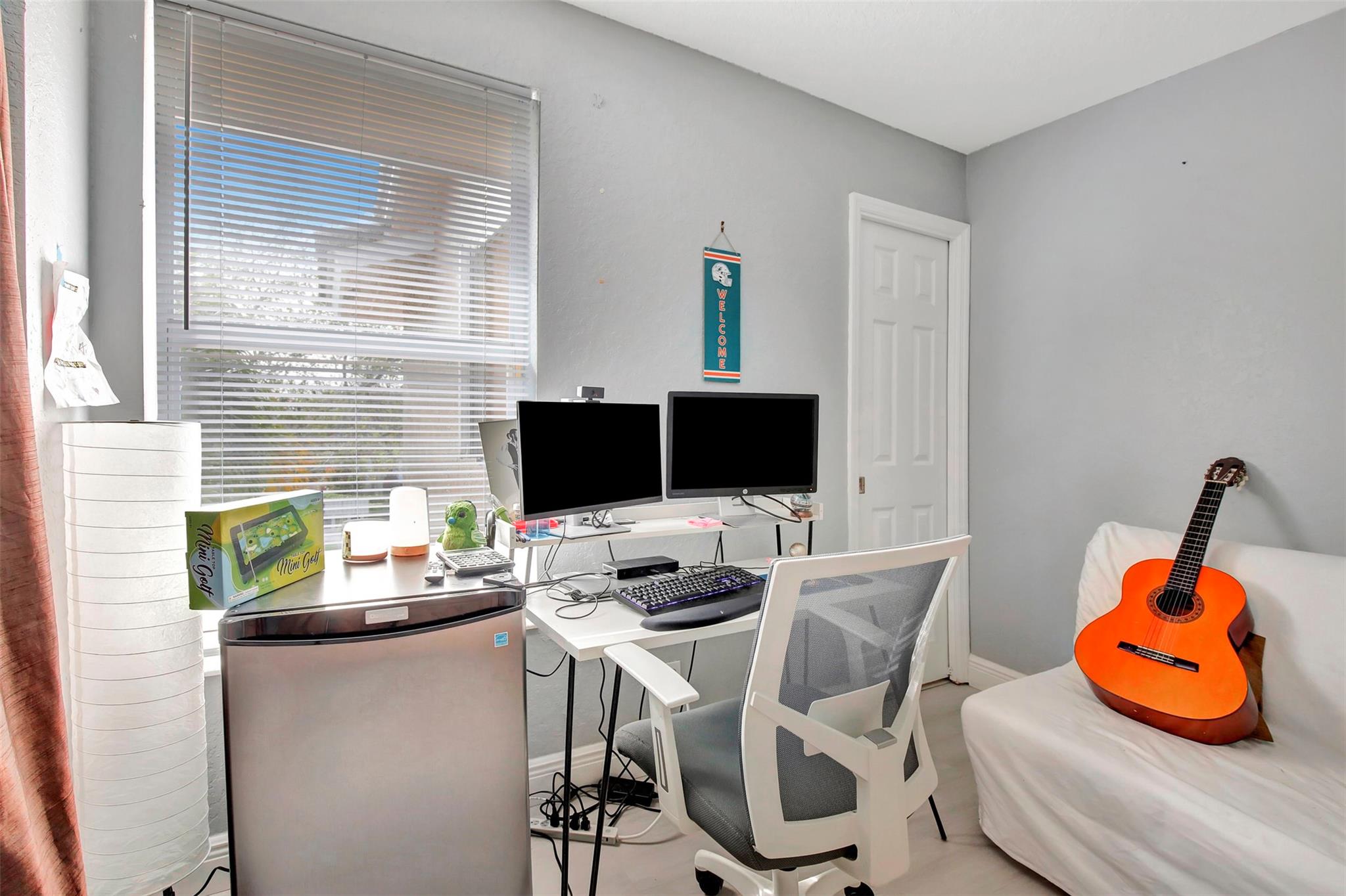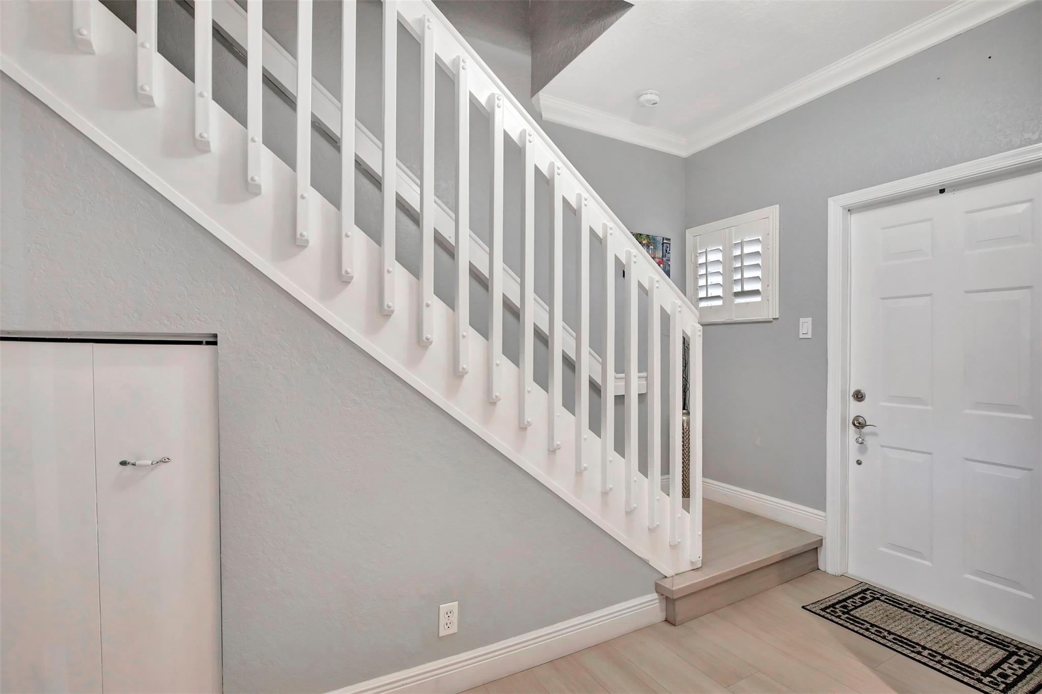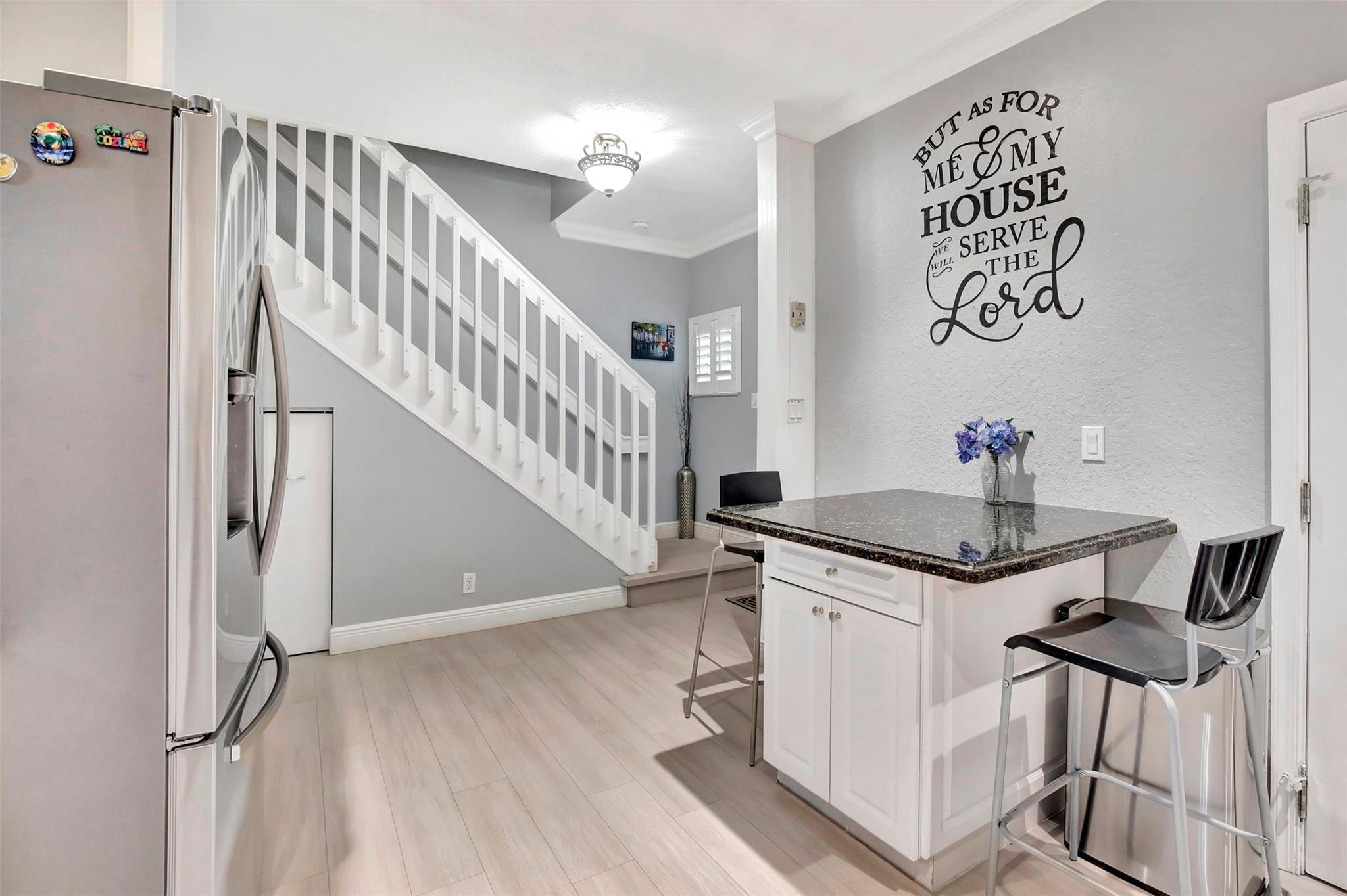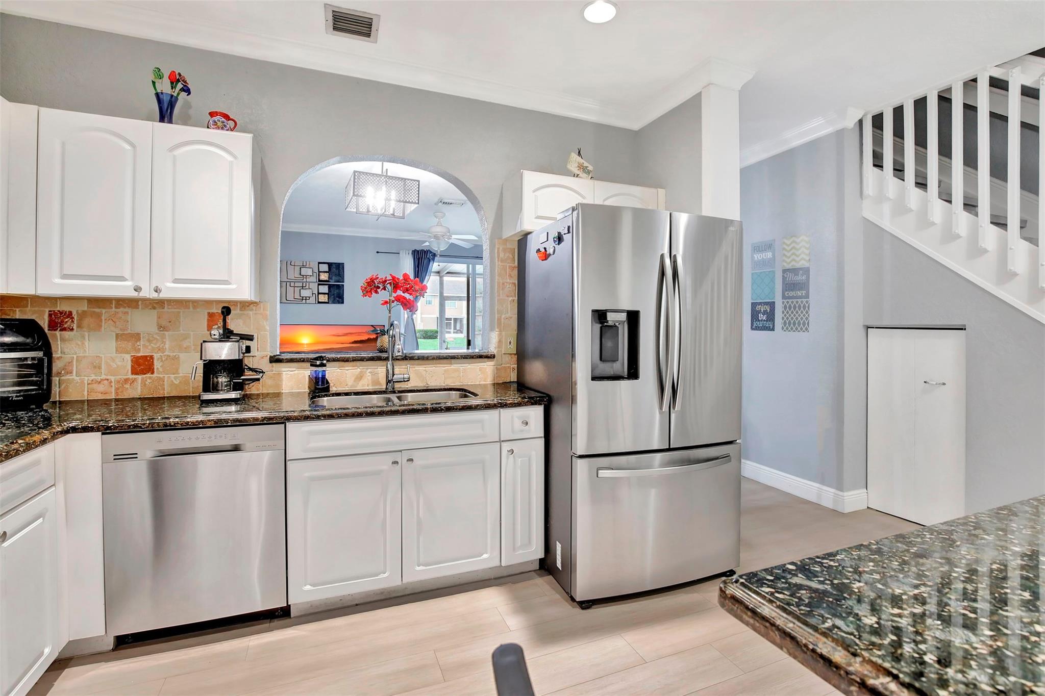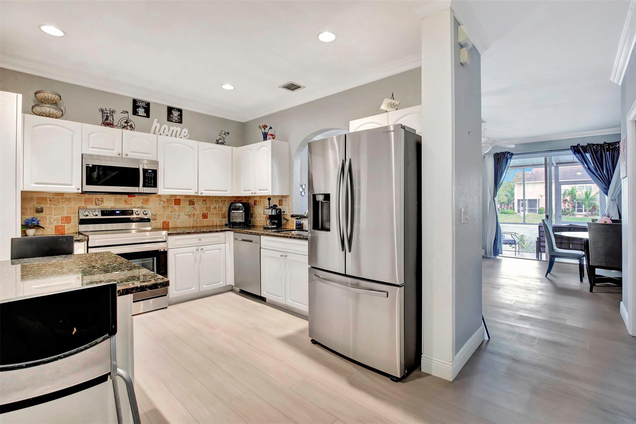 Welcome to this beautifully updated townhome nestled within Sunrise's Palm Bay, a gated community. This inviting unit showcases vaulted ceilings and luxurious vinyl floors, creating an ambiance of modern elegance. The modern kitchen features newer stainless steel appliances, perfect for culinary enthusiasts and entertaining guests. A master suite featuring a coffered ceiling and a convenient walk-in closet offers a comfortable retreat for homeowners. A Jack and Jill bathroom connects the guest bedrooms, providing added convenience and privacy. Take in serene lake views from the enclosed porch, ideal for relaxation and outdoor gatherings. Safety is prioritized with accordion shutters and a hurricane-proof garage door, an AC unit in 2019 & 2021 WH. One-car garage and a two-car driveway