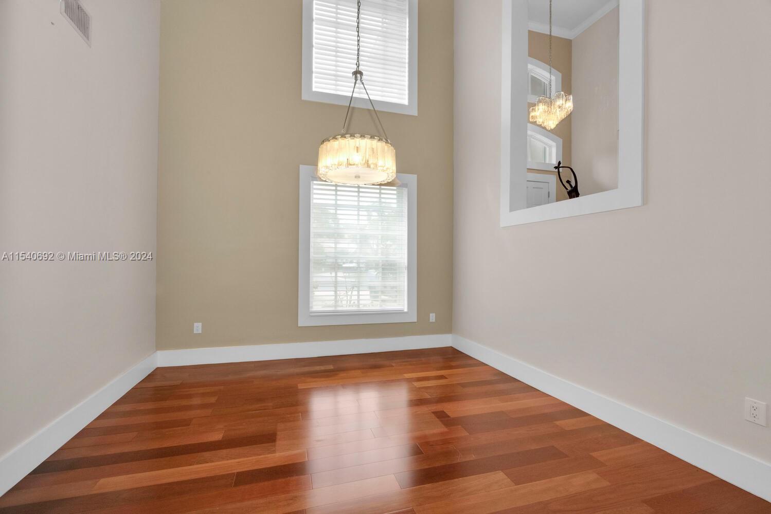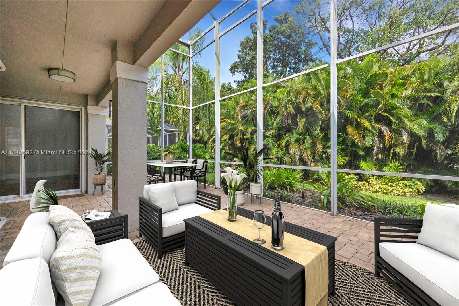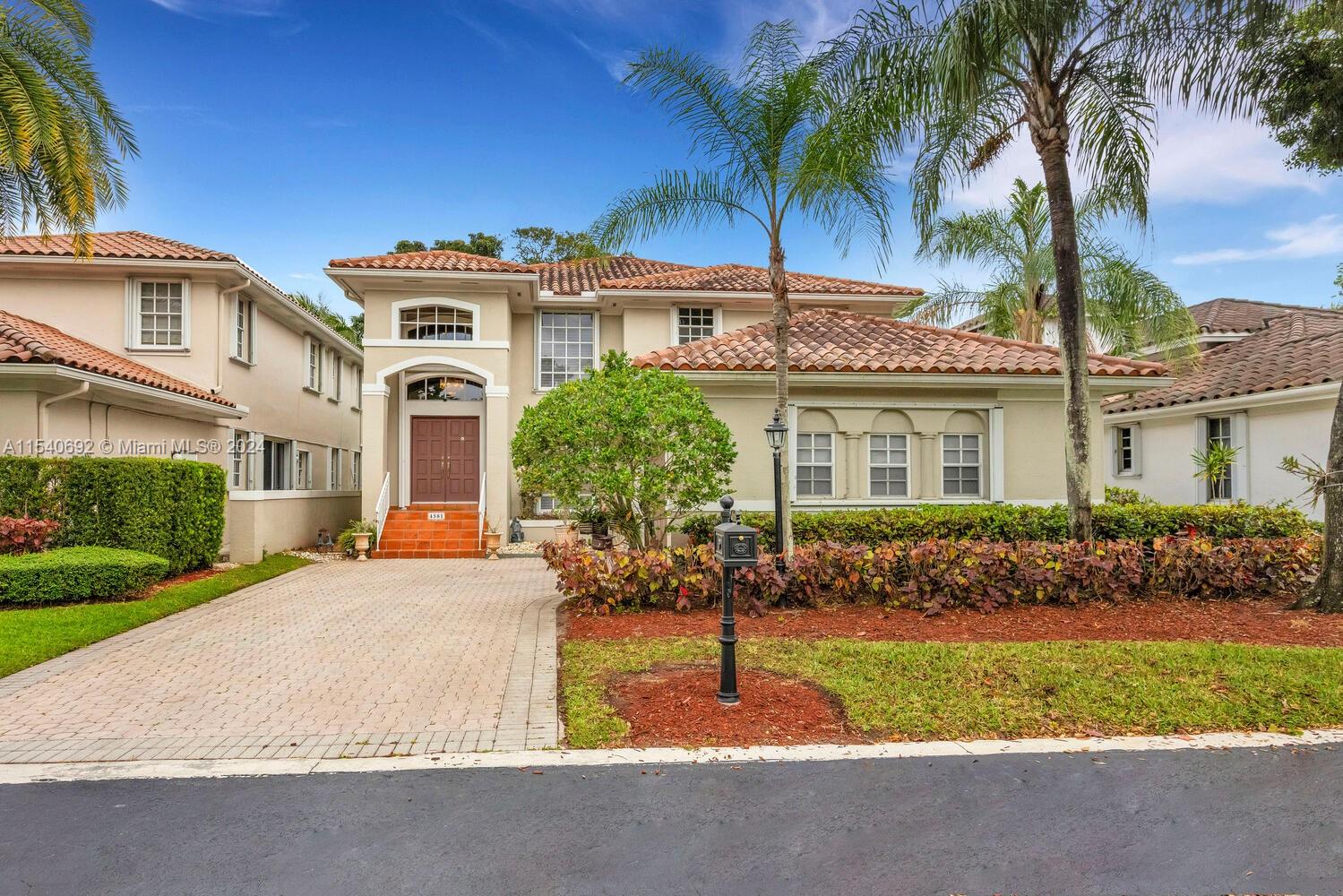Discover the elegance of a 3-bedroom, 3-bathroom villa located in the prestigious Fairways area of Doral Estates Villas. This exquisite home welcomes you with a grand formal living room, accentuated by soaring 18-foot ceilings, luxurious Brazilian cherry wood floors, & sleek marble tile in the kitchen. The layout includes a convenient downstairs bedroom & bathroom, an indoor laundry room adjacent to the expansive two-car garage, & an outdoor screened terrace. Upstairs, find two ensuite bedrooms, featuring a spacious primary suite with a large walk-in closet, double vanity, Jacuzzi tub, & shower. The home is equipped with partial impact windows & accordion shutters. Residents enjoy access to Trump National Doral Golf & Spa Resort, 24 hour security with a gated entrance, & a community pool.