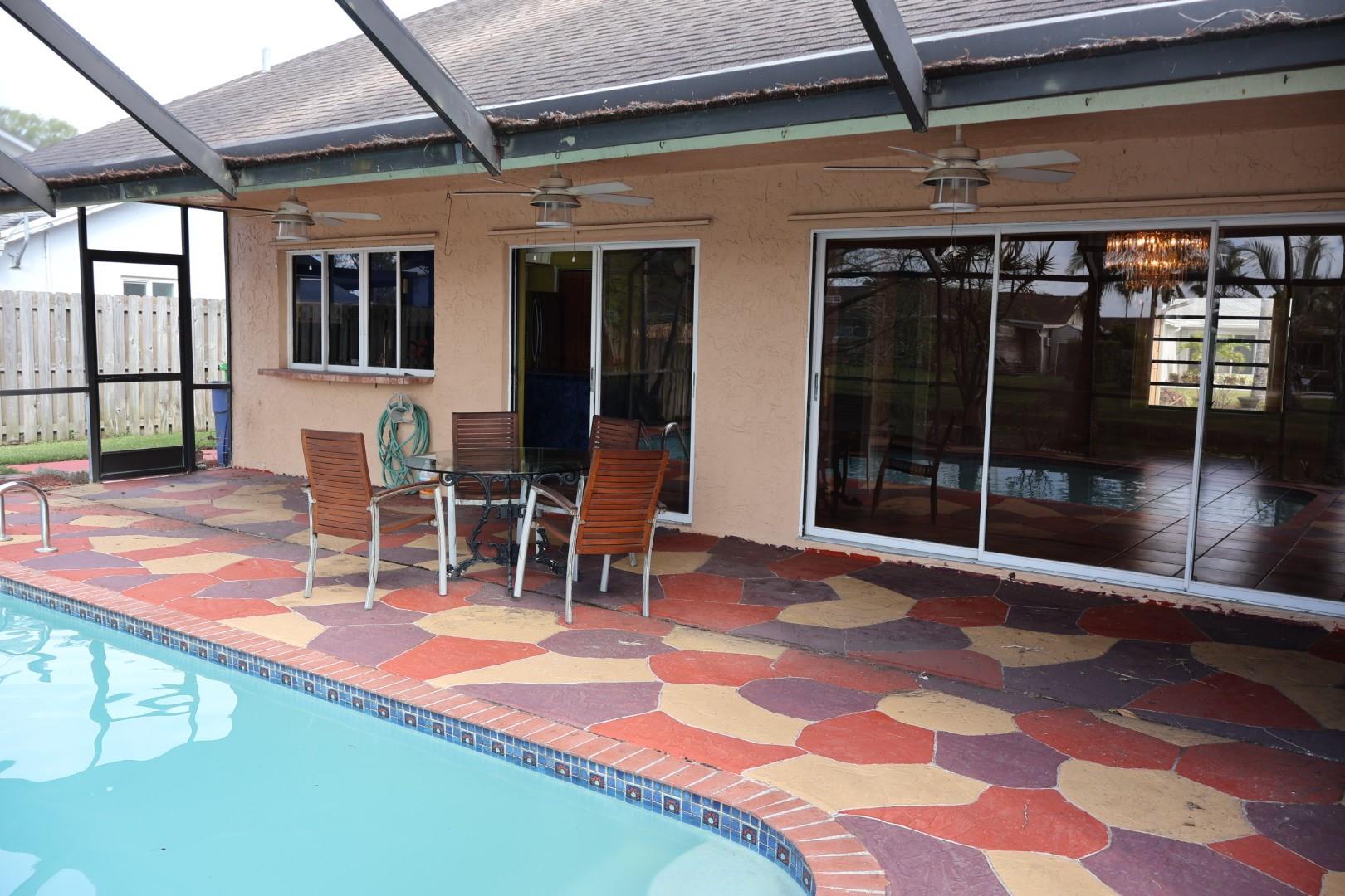 Great Location! Near Welleby Park and Sunrise/Athletic Complex. This is a popular, well-built DCA home with spacious rooms, tile floors, stainless steel appliances, a center island, flagstone patio decking, cathedral ceilings, a family room off the kitchen, a master bath bidet, and a walk-in closet in the master suite. Enjoy poolside gatherings in your screened pool and patio area overlooking a wide waterway, lush tropical landscaping with mature palms surround this spacious 1685 sq ft home. Whether you're seeking a peaceful retreat or entertaining guests, this home has the potential to deliver it all. A portable generator is included (as is) House needs cosmetics but has great bones. Owner wants offers
