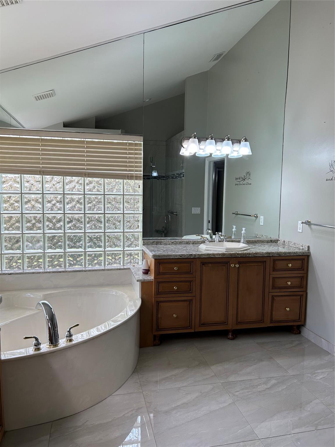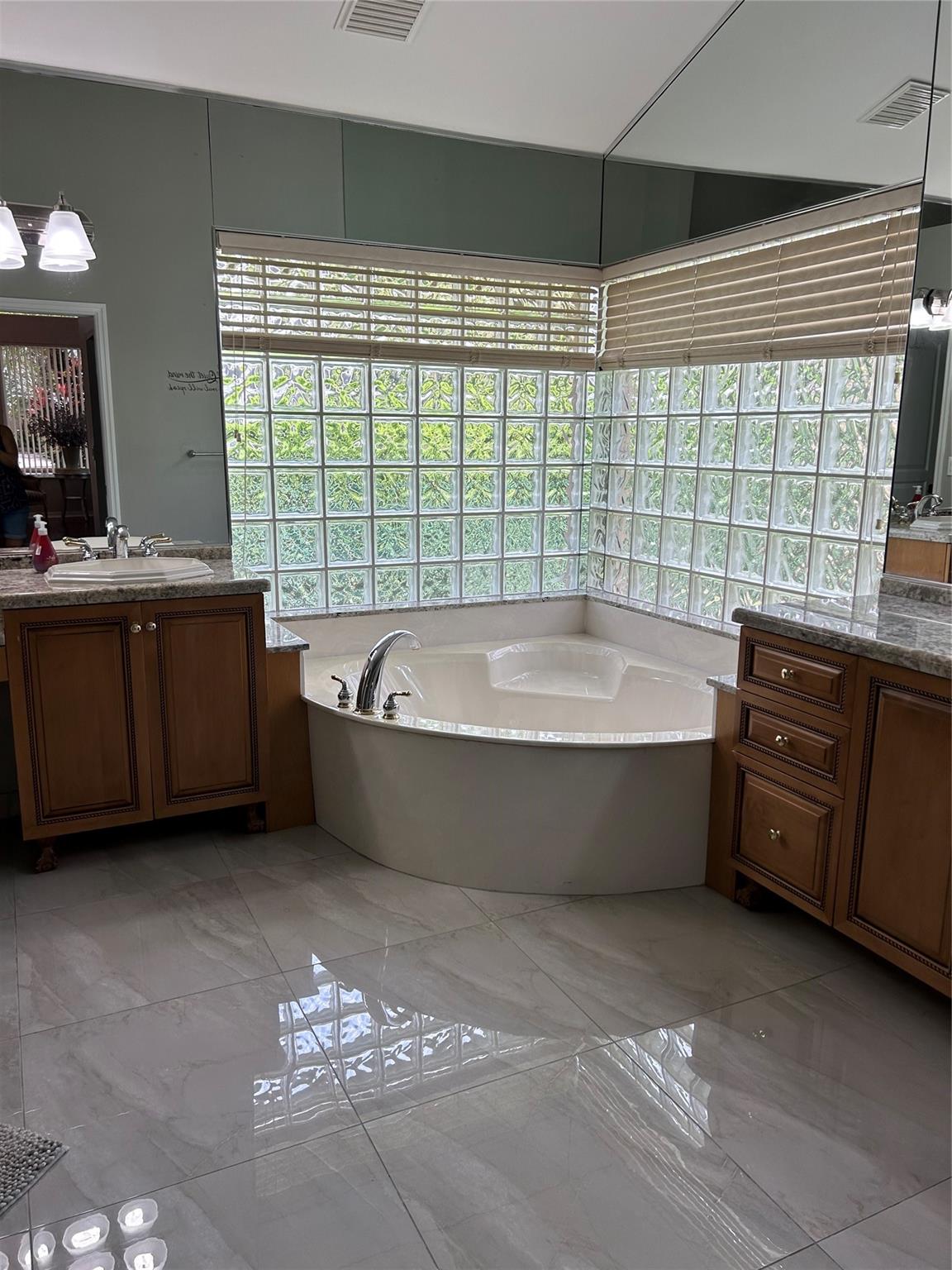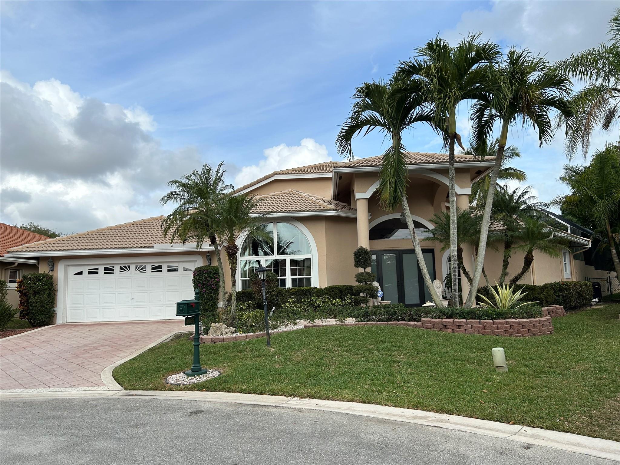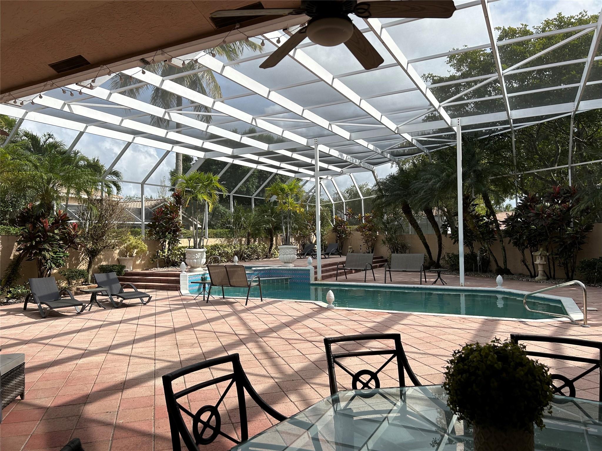 Rare listing in Kensington Gardens! Gorgeous 5/3.5 courtyard residence nestled in the culdesac of model row. Expansive multi-level paver patio with enclosed pool deck and spa. Adjacent to pool area guests can enjoy their own personal quarters with a private bedroom and bathroom. Main house has perfect blend of comfort and luxury with 4 bdrms, formal living and dining room, and more. Recently updated, the kitchen boasts a stunning waterfall quartz countertop with plenty of storage, SS appliances, double wall oven and microwave drawer. Extra features include touch faucet in oversized sink and pull out drawers in cabinets. Kitchen open to the bright family room with sliders to access patio. LOW HOA and walking distance to local schools. Come make this house your tropical paradise!