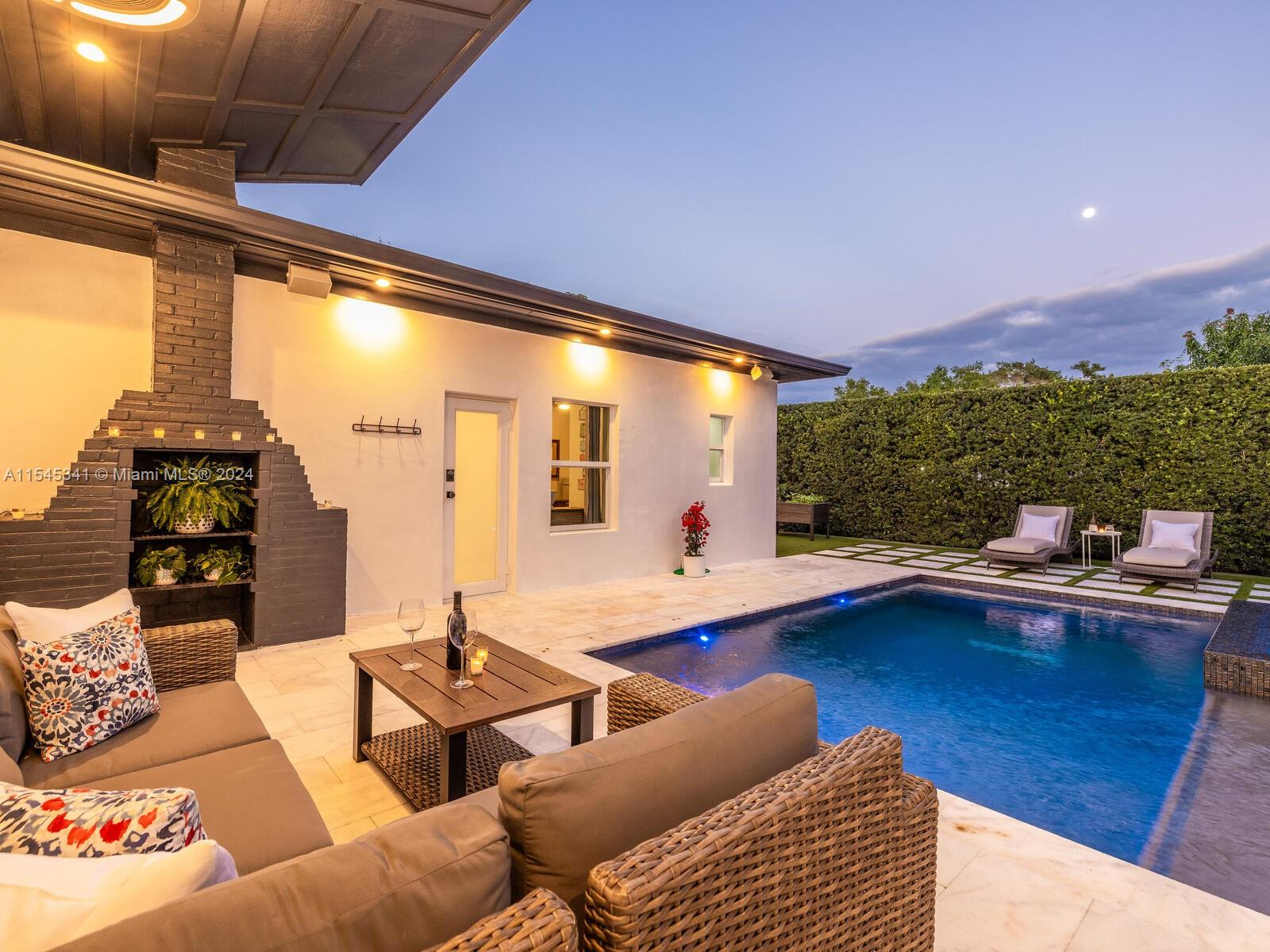 Welcome to The Cypress House! A geometric cluster of manicured Italian cypress trees welcomes you at this unique, striking, elegantly updated, Palm Springs style “usonian” mid-century modern pool home. Enter into spacious, open, interconnected living wings with expansive and vaulted living-dining-lounge areas, and a huge designer eat-in island chef’s kitchen with wine bar and breakfast nook. Sleep easy with four beds and four baths, including a dreamy main suite retreat with walk-in closet and spa-like bath, plus two guest rooms and a fourth bedroom ensuite, great as in-law quarters, guest nest or office-den. Enjoy lush privacy landscaping around the sparkling pool and covered rear terrace—perfect for entertaining! All near Miami Shores Country Club on a large corner in a non-flood zone.