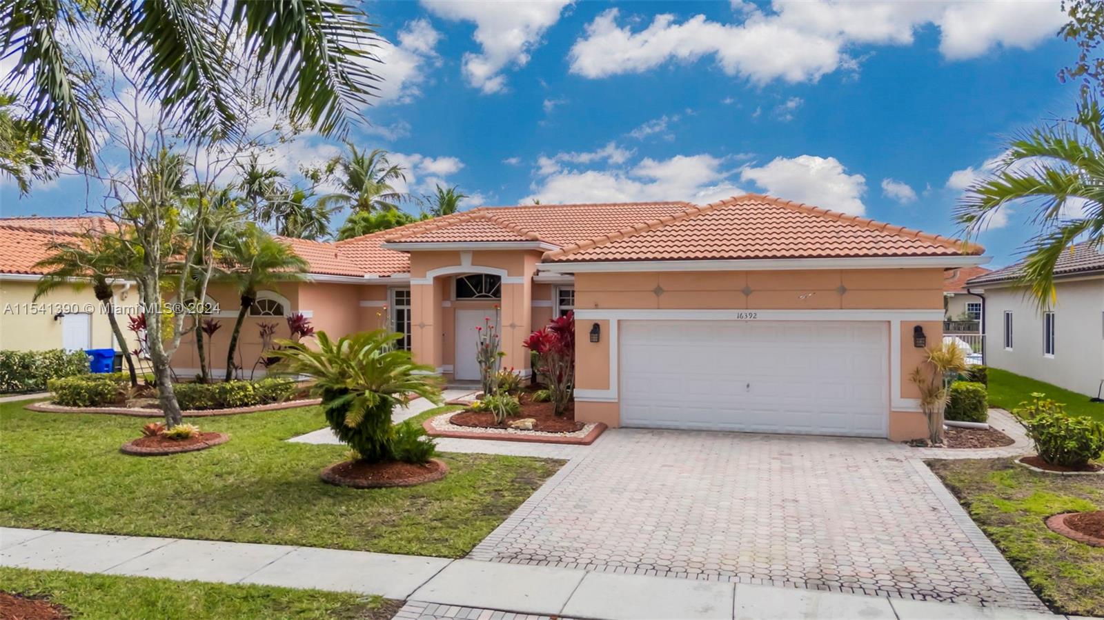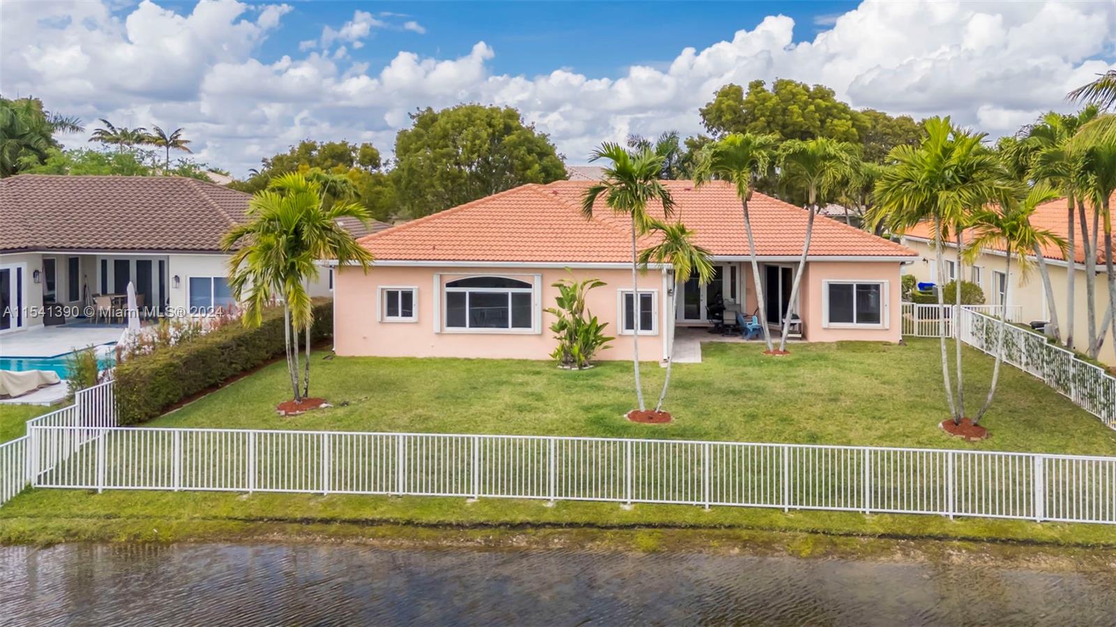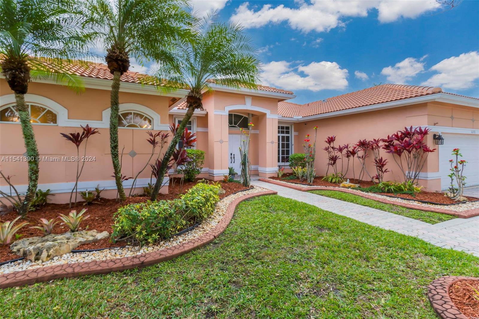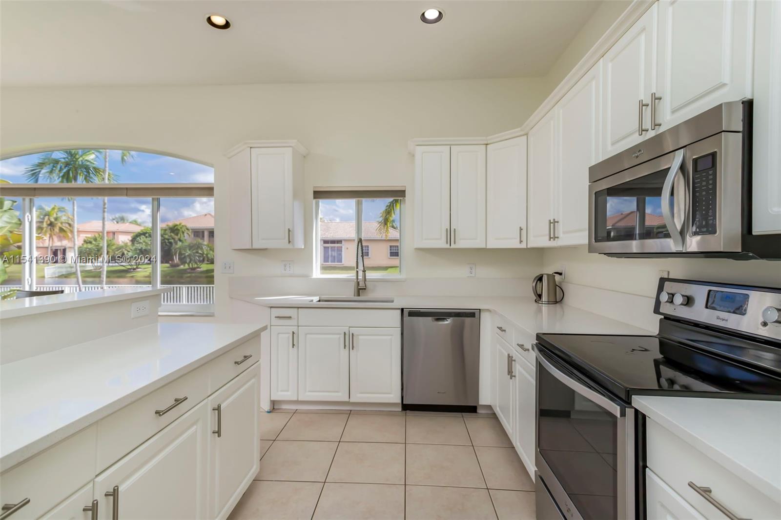 Welcome to this beautiful single-story lakeside paradise nestled amidst lush landscaping. Lots of natural lighting that streams through the hurricane impact windows. Recessed lighting & freshly painted warm neutral colors add a touch of modern sophistication. The heart of the home is the open-concept kitchen & family room, where breathtaking lake views provide a stunning backdrop for daily life. Kitchen is complete w beautiful quartz countertops, pristine white shaker cabinets, & SS appliances. A large pantry ensures that all your storage needs are met. Retreat to the oversized primary bedroom, w custom closets & a spacious sitting area. Modern conveniences include a Tesla charger hookup & whole house generator hookup, ensuring that you're always prepared. Brand new AC