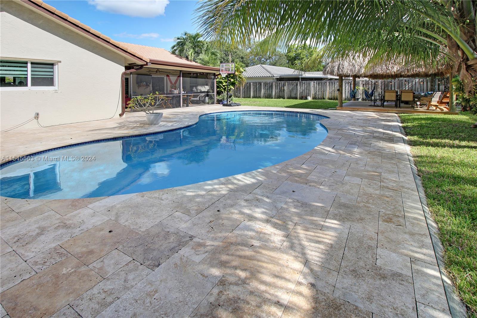 Wonderful 4 bedroom 2 bathroom Pool Home in highly desired Coral Springs!! Freshly painted throughout! Impact windows and doors! All insurance credits! Brand new travertine pool patio and circular drive! Large, recently resurfaced pool comes with a safety fence! Just painted garage! Giant Kitchen with eat-at island, tons of storage, pantry with pull-out drawers, appliance hider, separate beverage fridge. The backyard features great Tiki Hut and swing set. Quaint neighborhood with No HOA. No Carpet. Beautifully upgraded baths! Zebra blinds in main living areas. House has ample closets, wonderful entertaining areas, high ceilings and tons of natural lighting. This home has it all! Young roof and AC! See video tour!