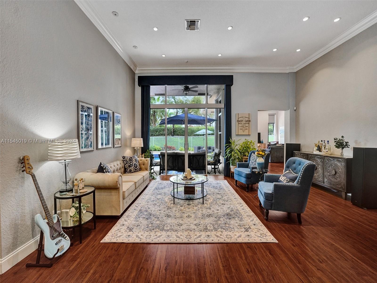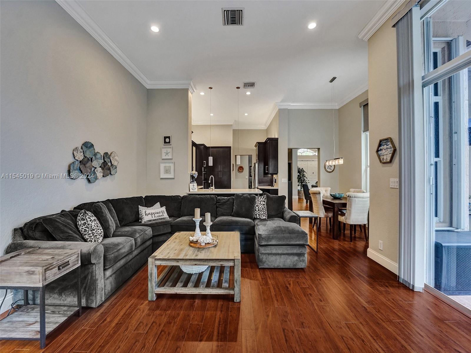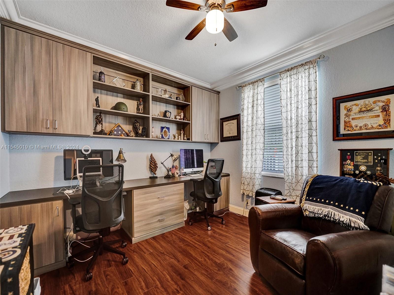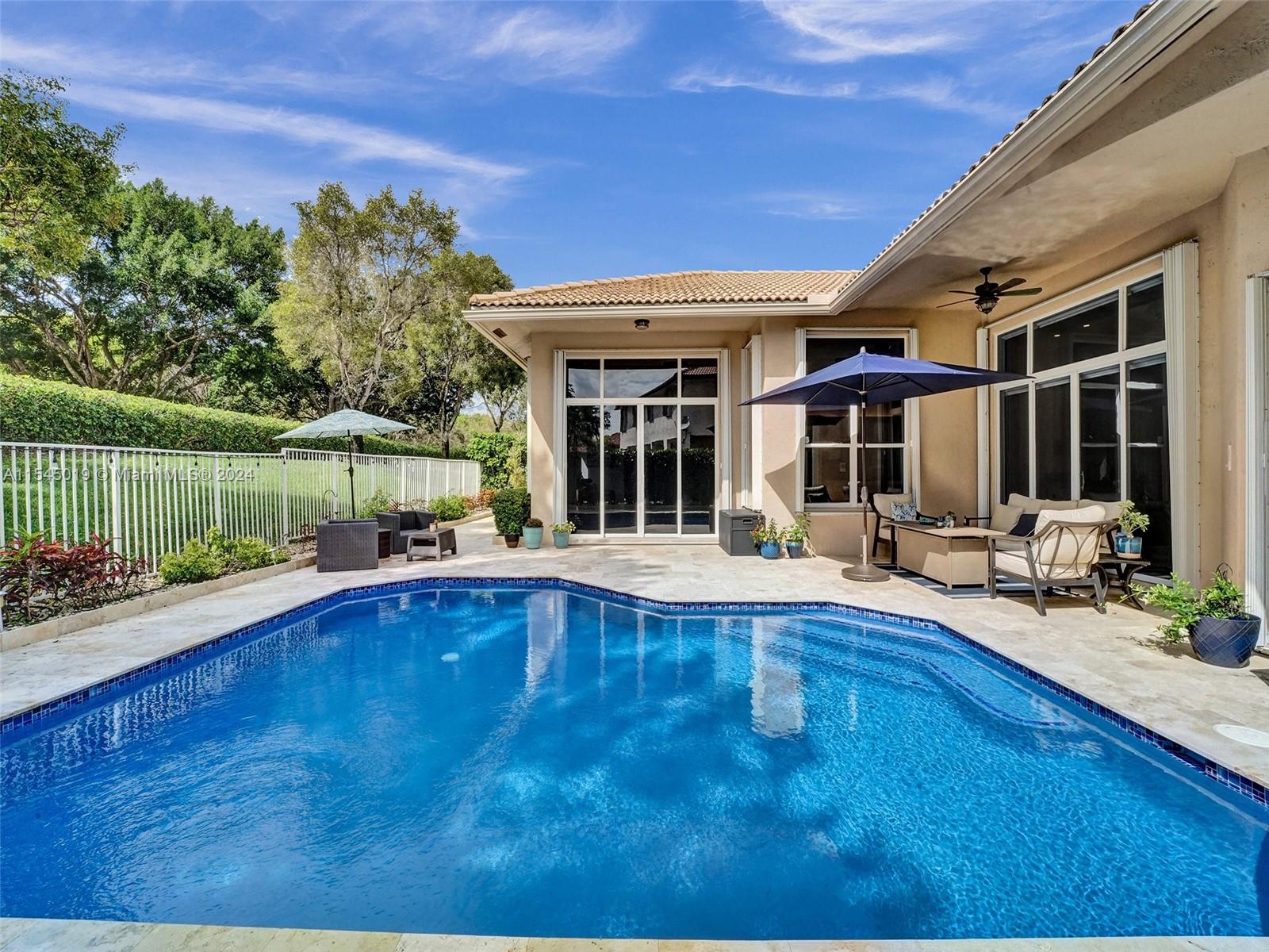 Unveil the charm of this residence in The Ridges with 4 bedrooms with custom closet cabinetry, and one bedroom is transformed into a well-designed custom office. This home includes 3 upgraded bathrooms and a primary suite bathroom with a Vessel tub and marble finishes. The contemporary kitchen has Silverstone countertops and stainless steel appliances. Lush tropical greenery that captivates curb appeal. Retreat to your private oasis in the backyard, where a travertine patio leads to a magnificently refinished Diamond Brite pool with heating and a saltwater system, all enclosed within a fully fenced yard for privacy. Situated within walking distance of the library and highly acclaimed "A" schools, this home is an exquisite find.