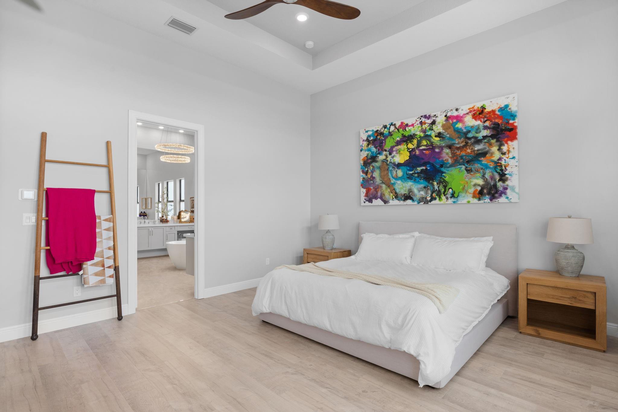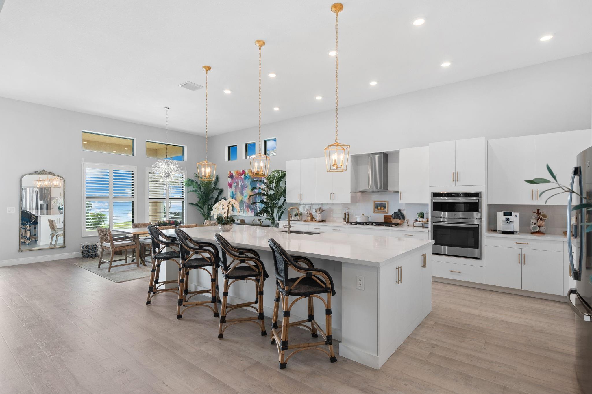 A meticulously designed 1-story home with a spectacular one mile long LAKE VIEW. This sleek home offers 4 bedrooms, 4 bathrooms, a great room, split 3-car garage, and 3,287 square feet of air-conditioned living space. Step through an impressive dedicated foyer with coffered ceilings and into the vast open great room, dining room, and kitchen, for a bright and inviting feel. Upgraded hardwood engineered floors throughout the house. Beautiful master suite with large walk-in closet, a spa-like master bath featuring separate his and her sinks, a free-standing tub and oversized glass-enclosed shower. Parkland Bay is a gated luxury community offering resort style amenities, including pool, fitness center, kids indoor playroom, playground, culinary kitchen, tennis courts, and basketball court.
