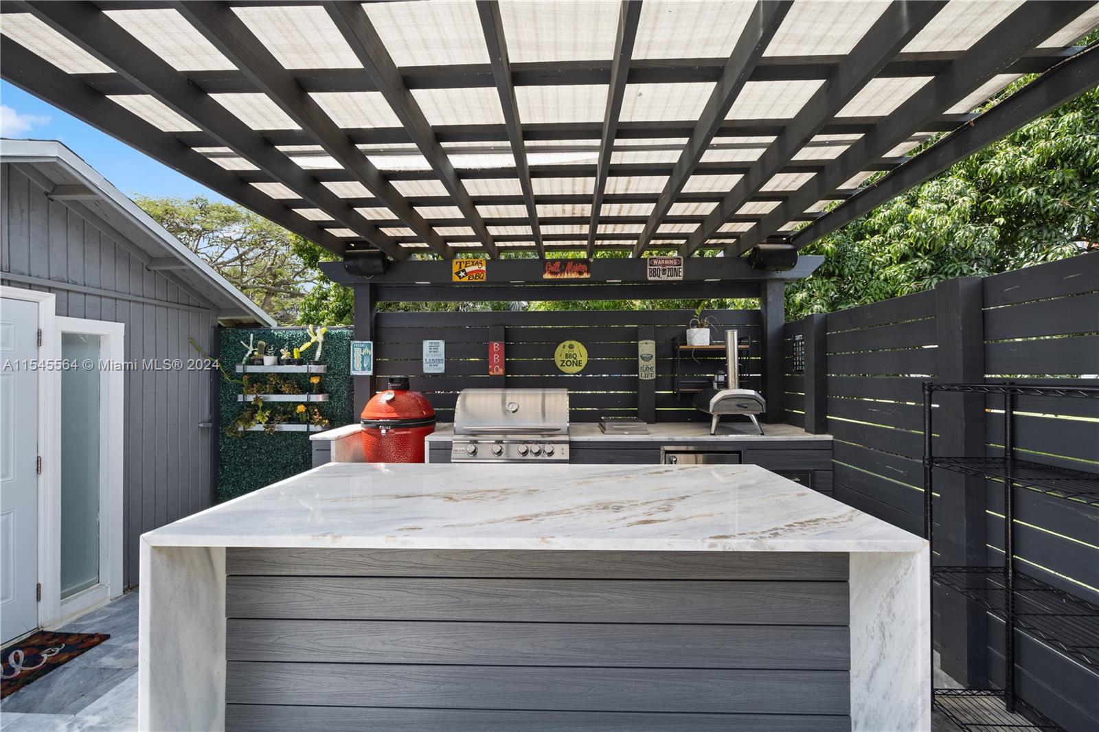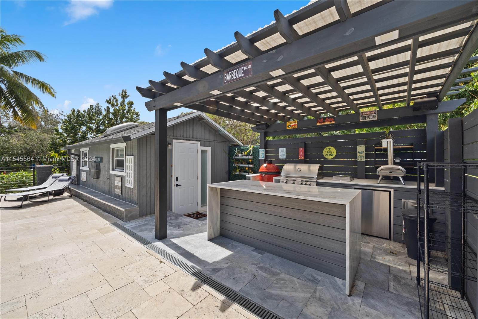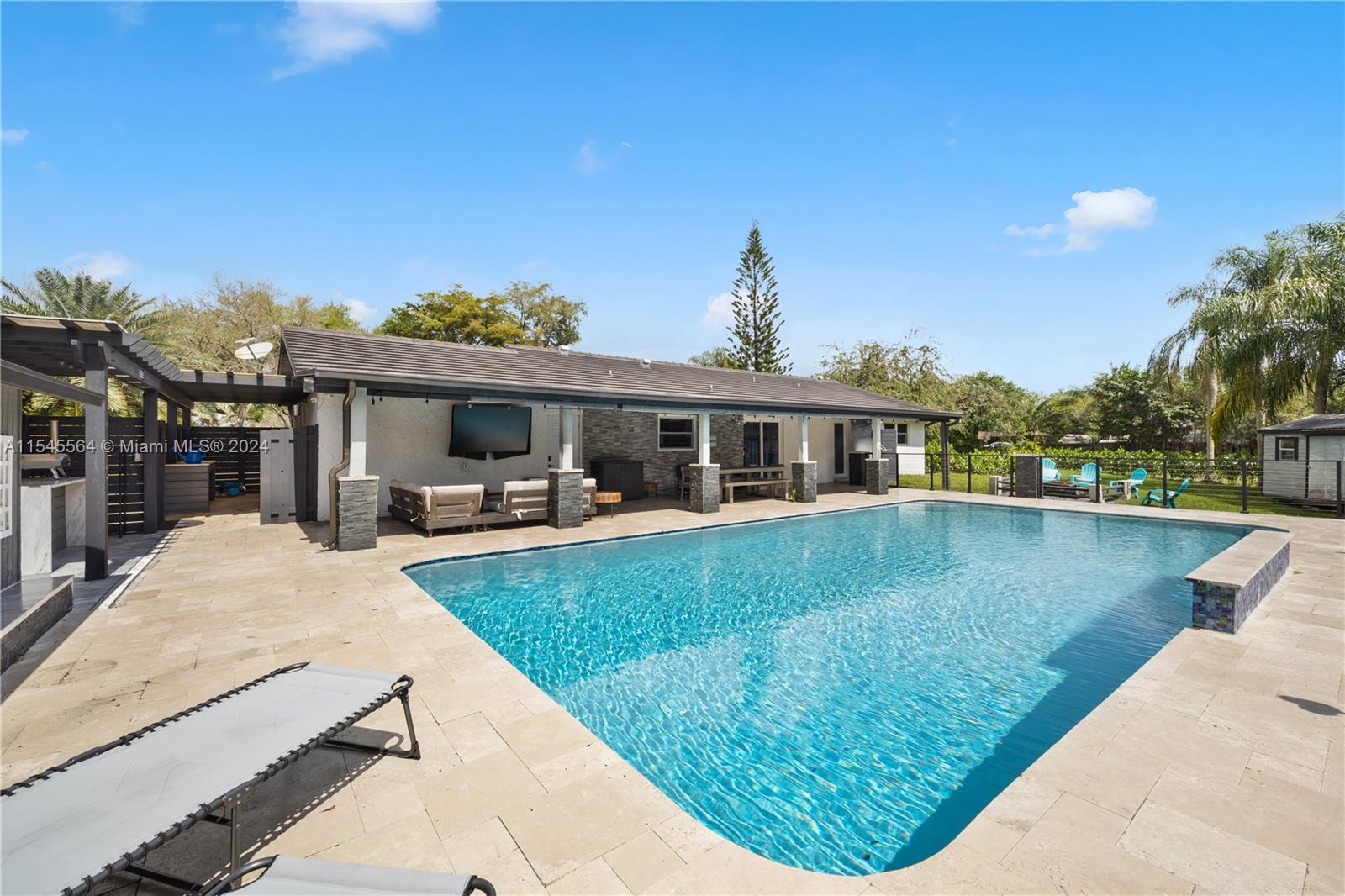 Welcome to your dream oasis! Beautifully remodeled 3/2 ranch-style home sits on an expansive, almost 30,000 sq ft lot! The kitchen features top-of-the-line Bosch appliances, ice maker and wine bar, perfect for entertaining. Plans are included to expand the master/living area for added space. All windows, doors, and garage are hurricane-rated. Home boasts a guest house with a bathroom/shower, complete with new tile floors. picturesque lakefront views and a 20 X 40 saltwater pool surrounded by travertine pool deck. The outdoor BBQ area features built-in appliances, including a KamadoJoe smoker, ideal for outdoor gatherings. Additional amenities include an outdoor shower, fire pit area, and shed. With updates like a 2018 roof, 2019 A/C, and a water heater from 2022.