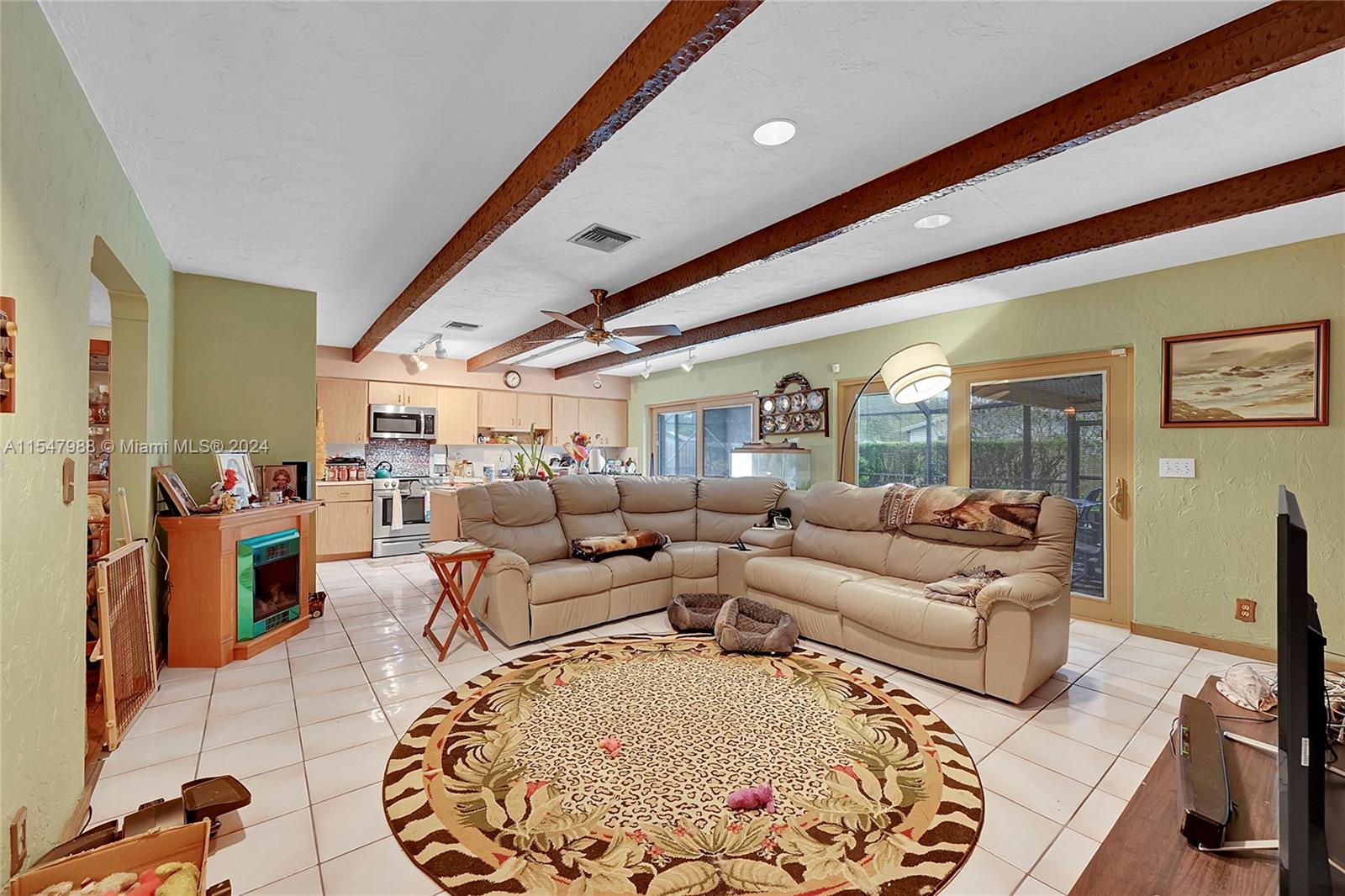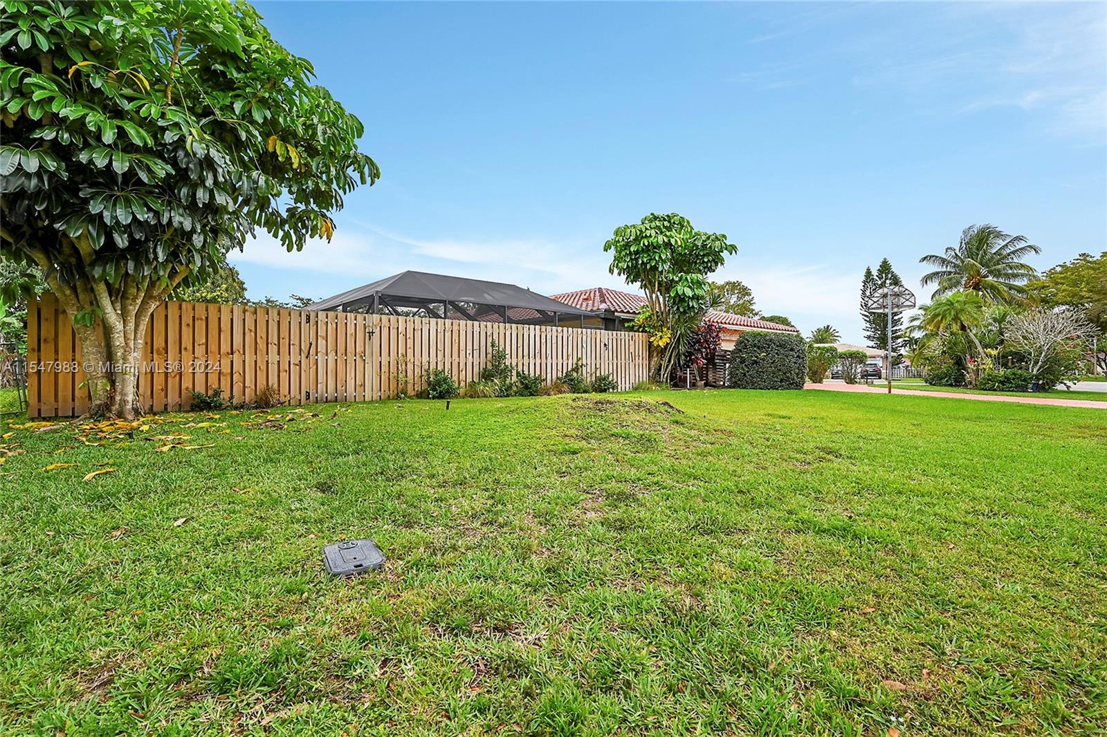 A very large corner lot beautifully landscaped on cul-de-sac. Spacious 4/3 split plan home. Accordion shutters on all windows and doors. The serene backyard offers a covered terrace with bar area, screened pool and lots of green areas with shade. Roof permitted.
