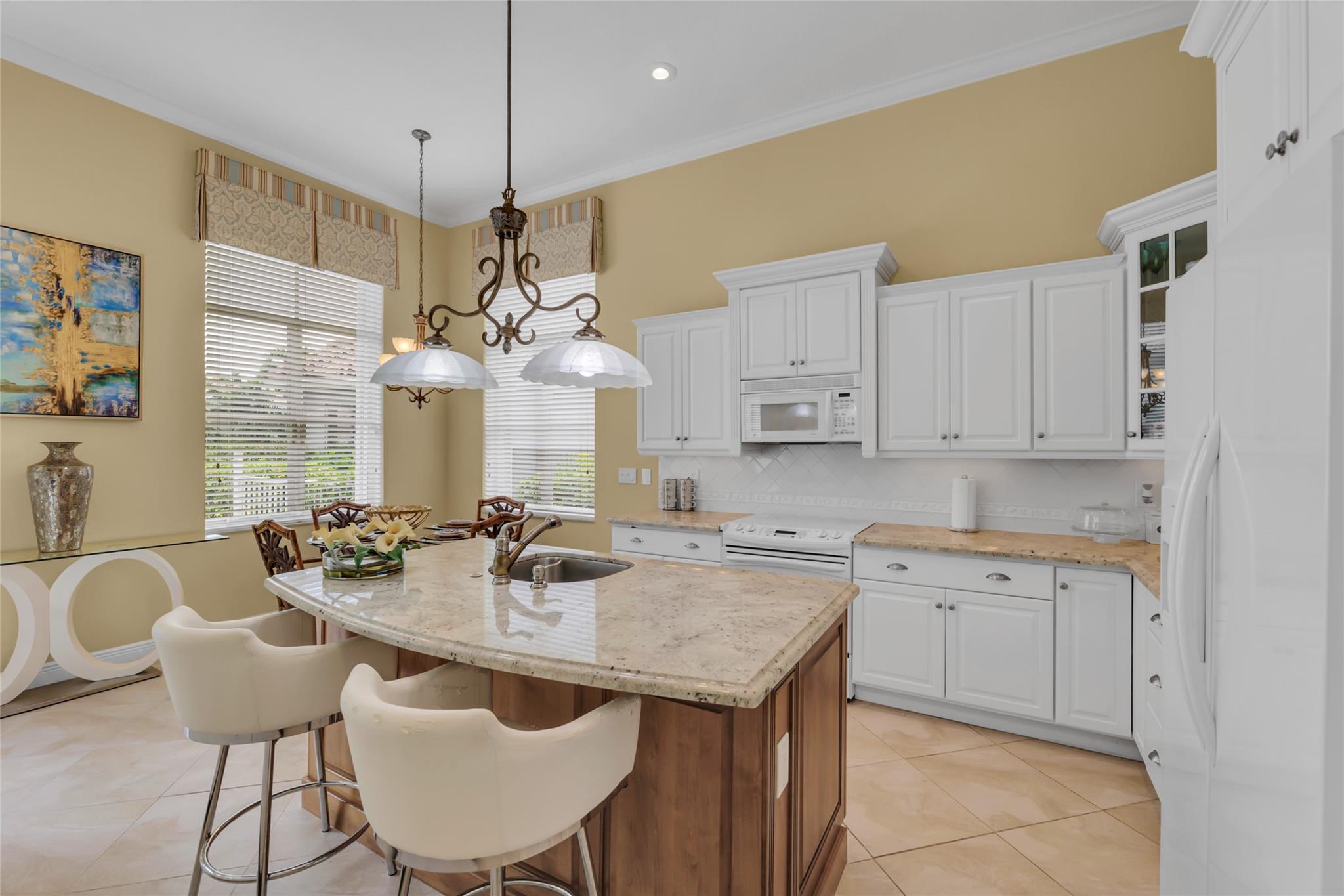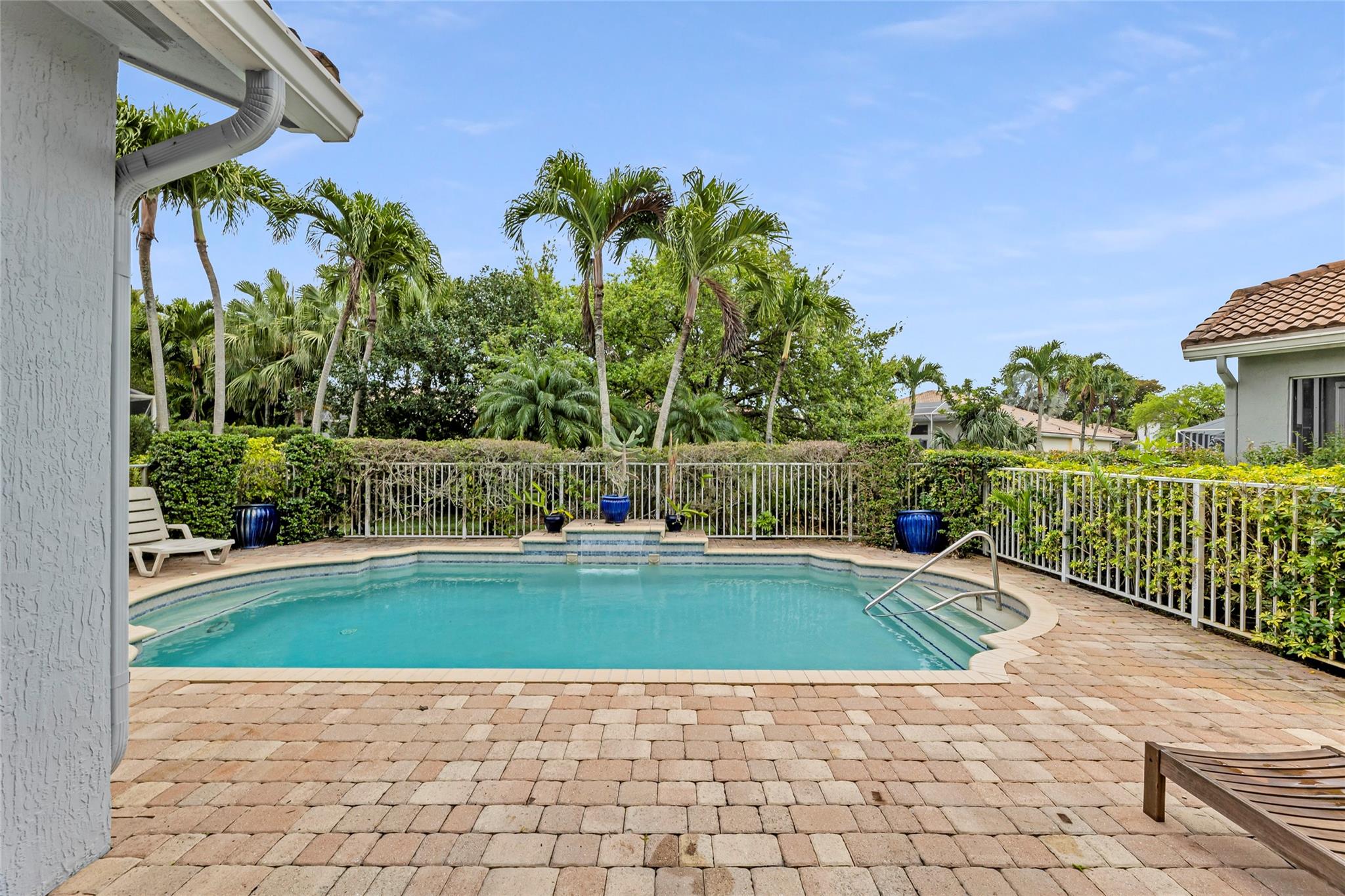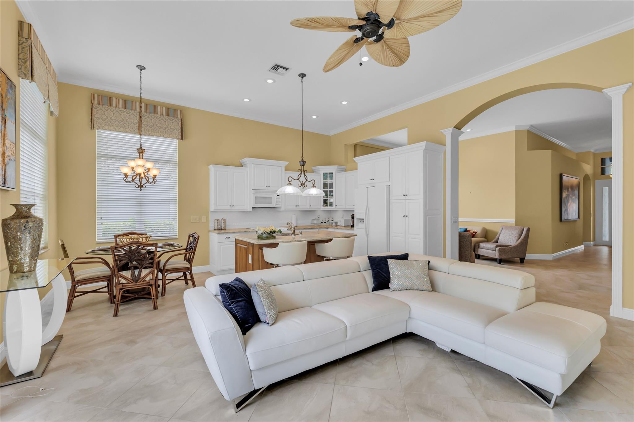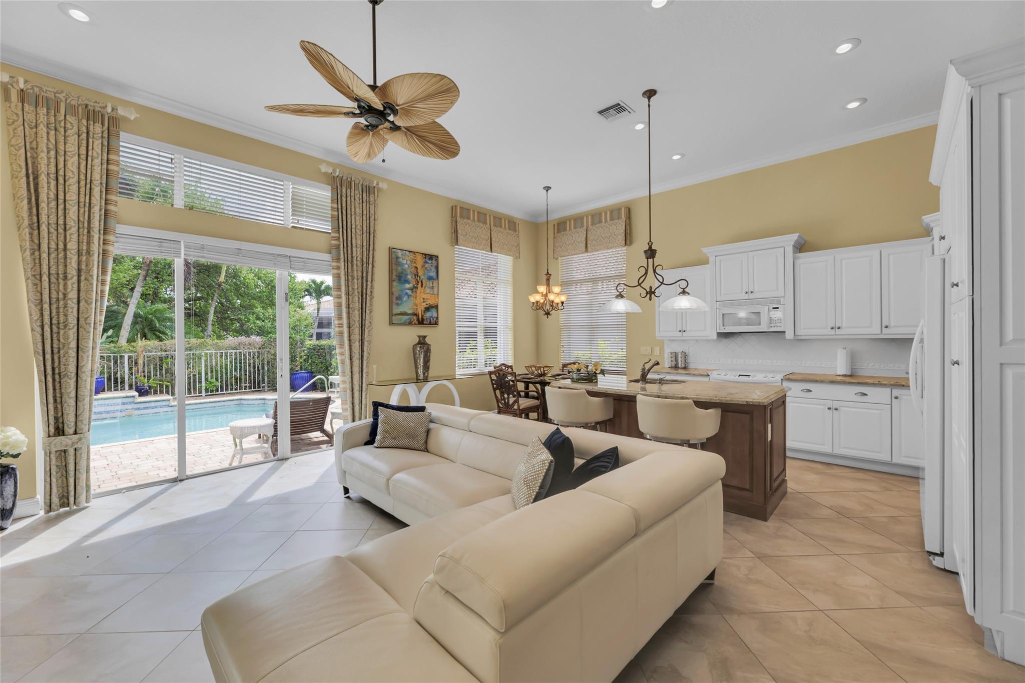 Beautiful 3 bedroom, 2 bathroom house in gated Eagle Trace golf community. Split floor plan includes: formal dining room, family room, and living room. High-vaulted ceilings and high-quality flooring throughout the home. All-white kitchen includes kitchen island, great for entertaining guests. Master bedroom has walk-in closet and spacious master bathroom. Screened patio has serene sitting area overlooking the pool. Fenced backyard is very private, surrounded by vegetation. The home features a 2-car garage with extra parking in the driveway and storm shutters for added safety. Amenities include: 24-hour security at gate entrance, basketball and tennis courts. This home is move-in ready!