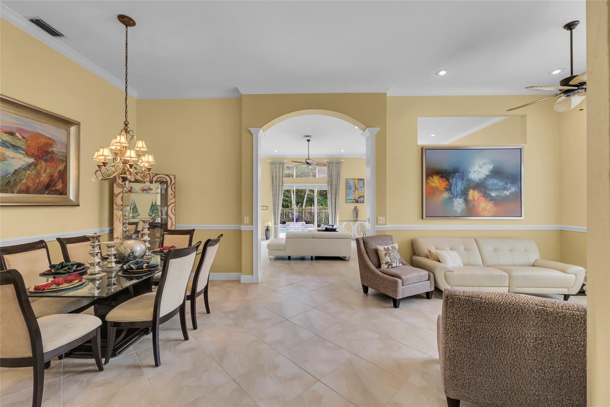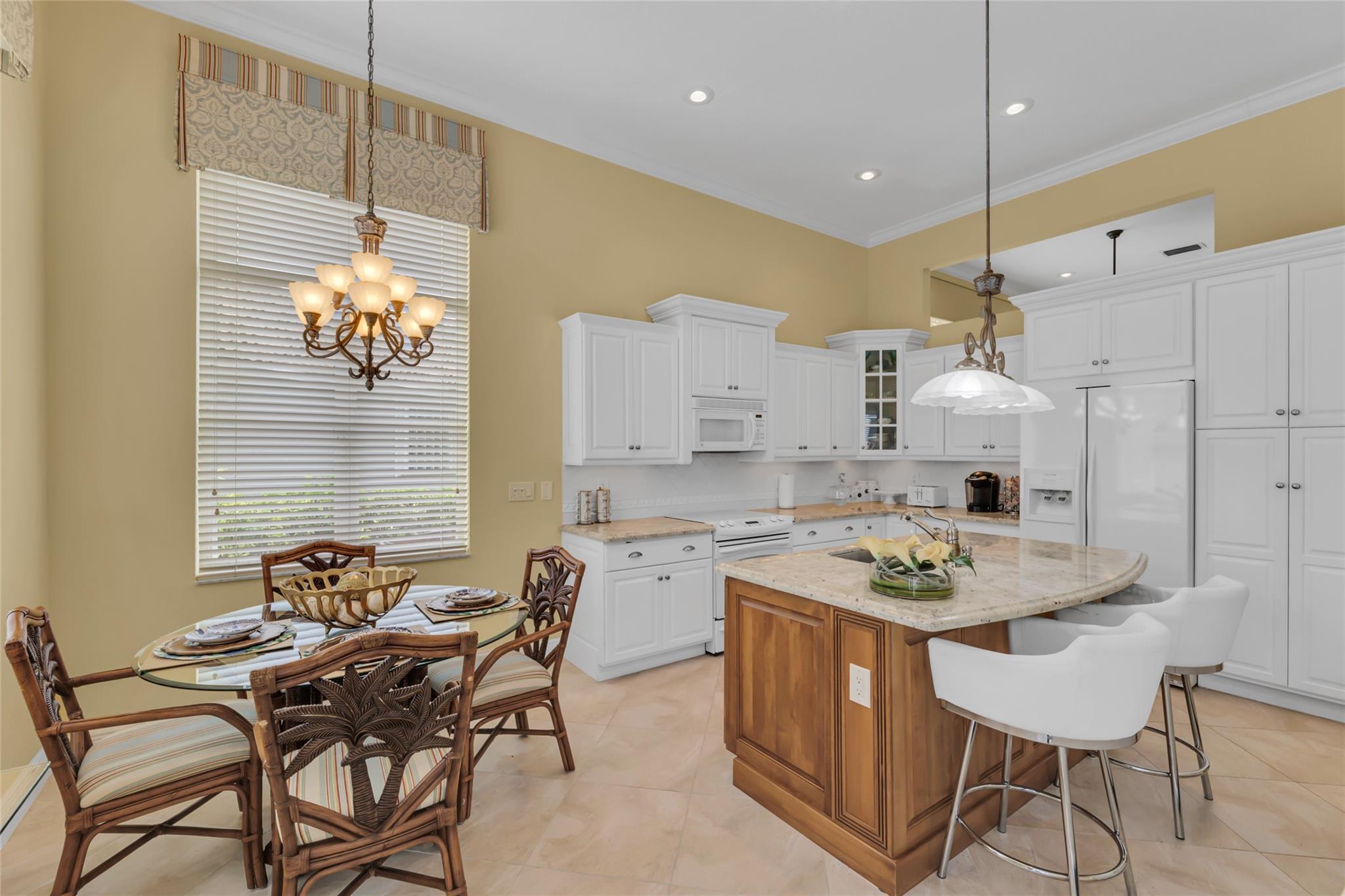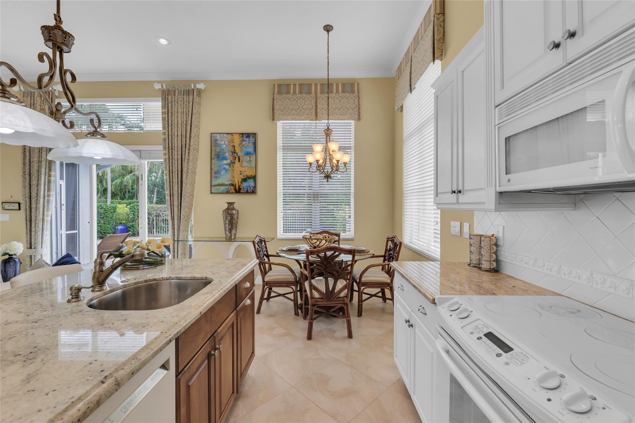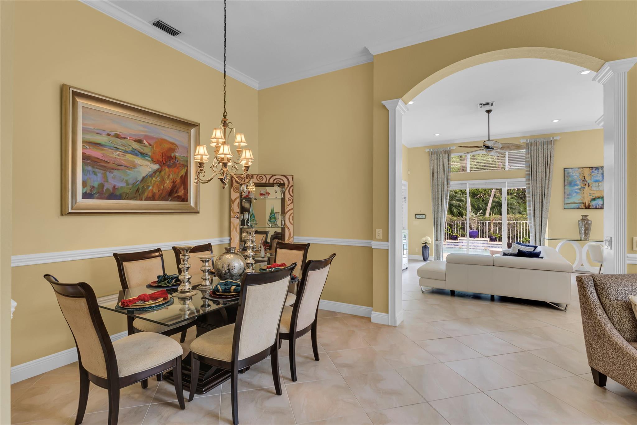 Beautiful 3 bedroom, 2 bathroom house in gated Eagle Trace golf community. Split floor plan includes: formal dining room, family room, and living room. High-vaulted ceilings and high-quality flooring throughout the home. All-white kitchen includes kitchen island, great for entertaining guests. Master bedroom has walk-in closet and spacious master bathroom. Screened patio has serene sitting area overlooking the pool. Fenced backyard is very private, surrounded by vegetation. The home features a 2-car garage with extra parking in the driveway and storm shutters for added safety. Amenities include: 24-hour security at gate entrance, basketball and tennis courts. This home is move-in ready!
