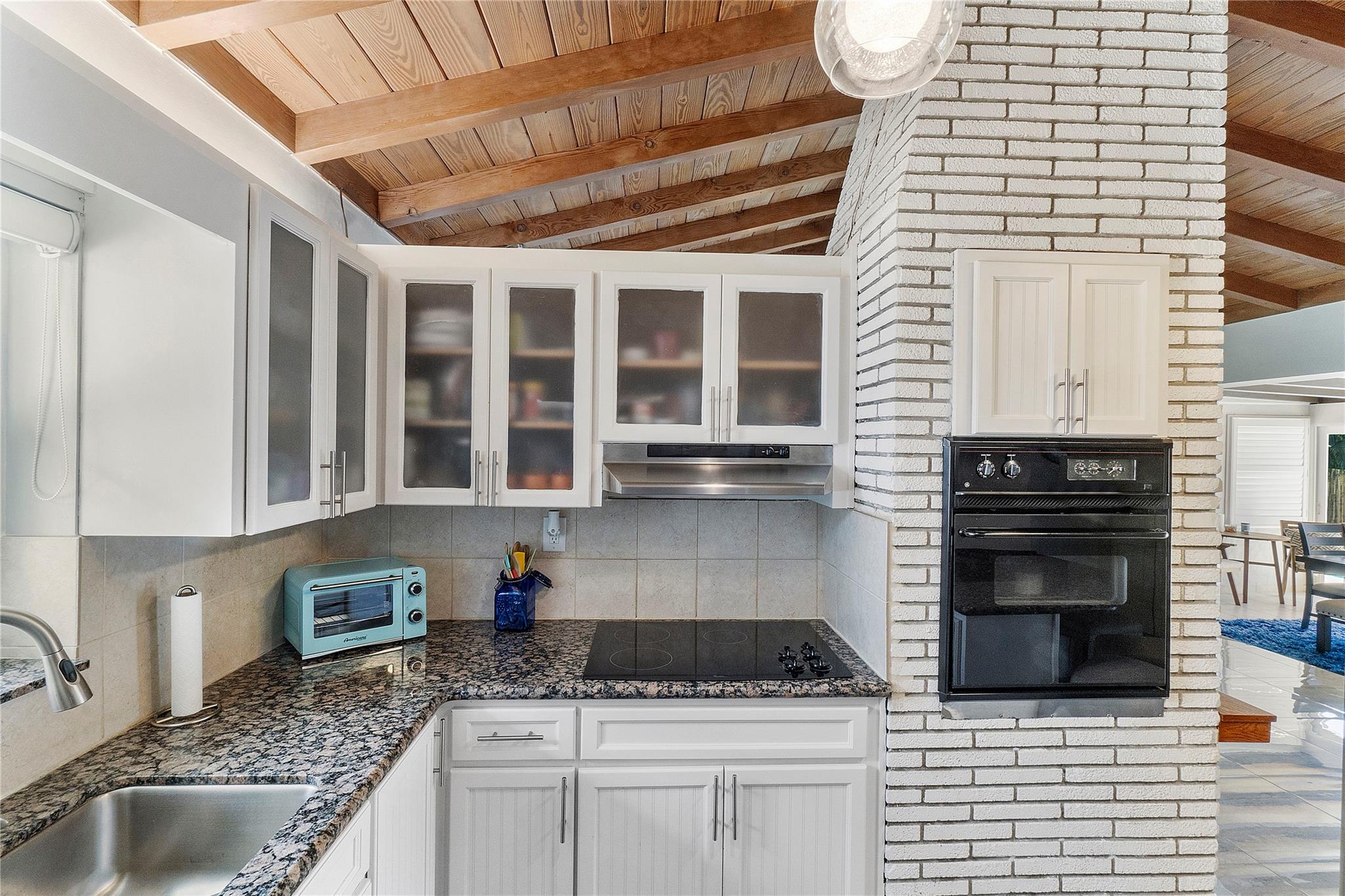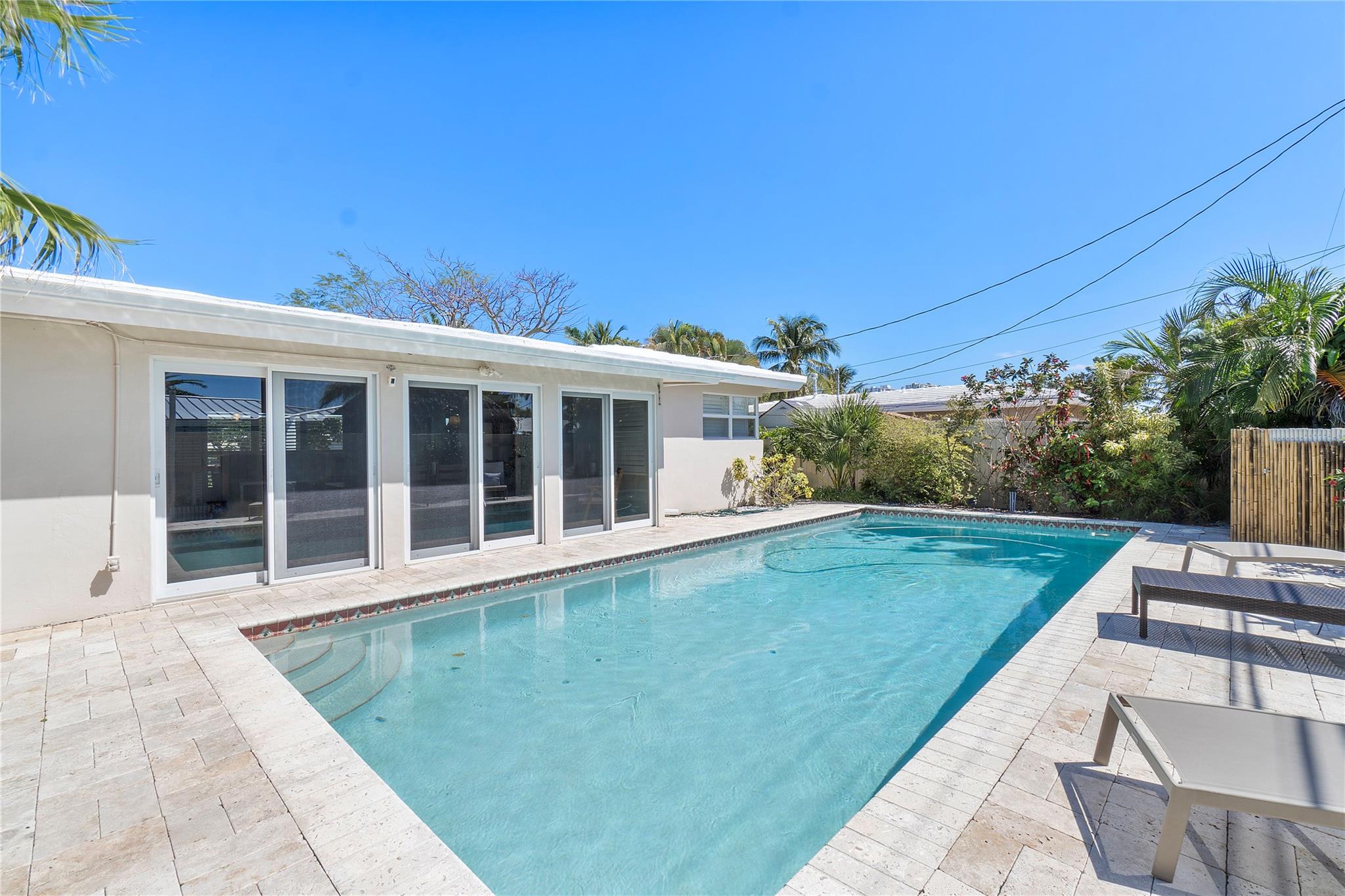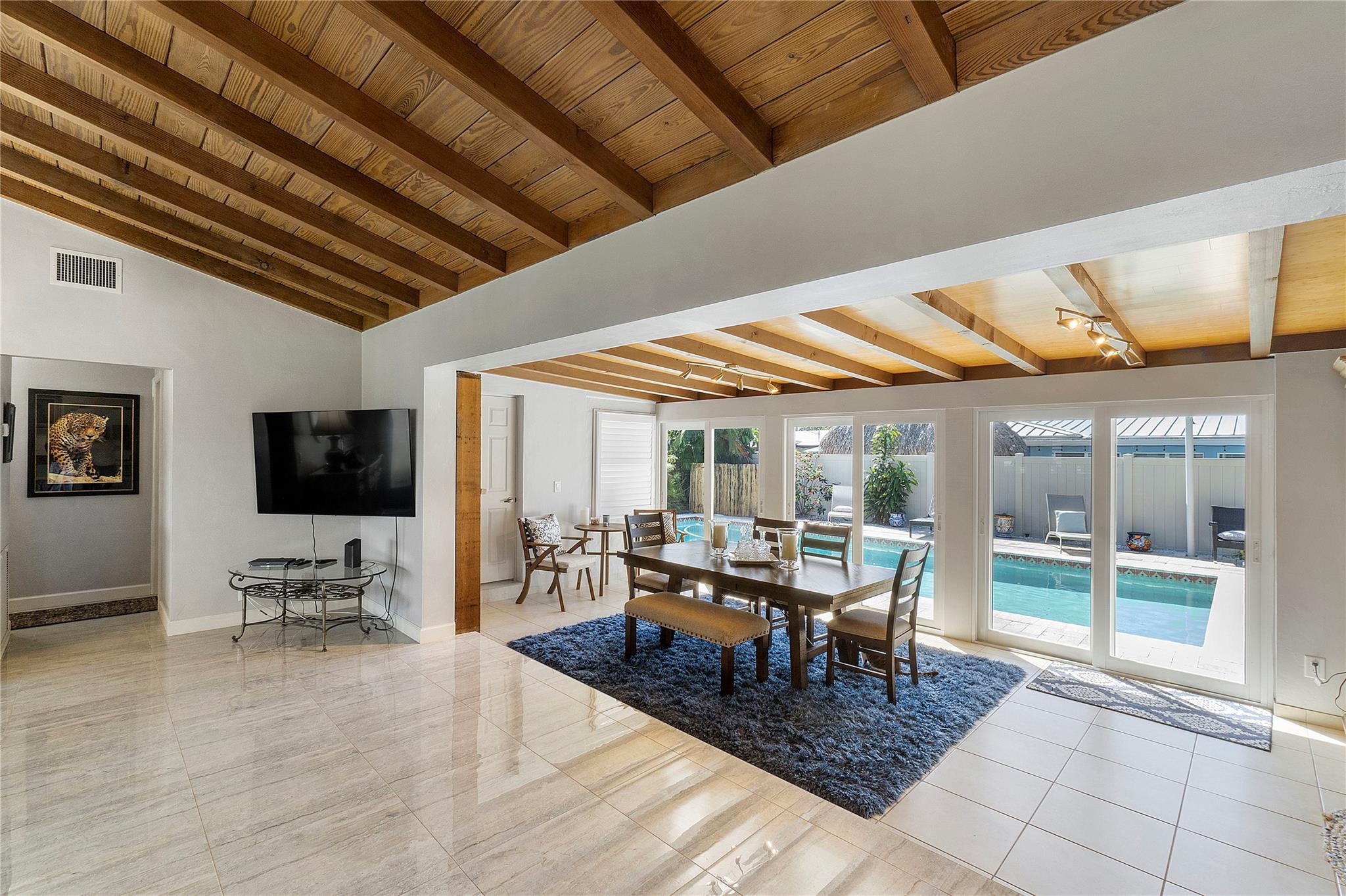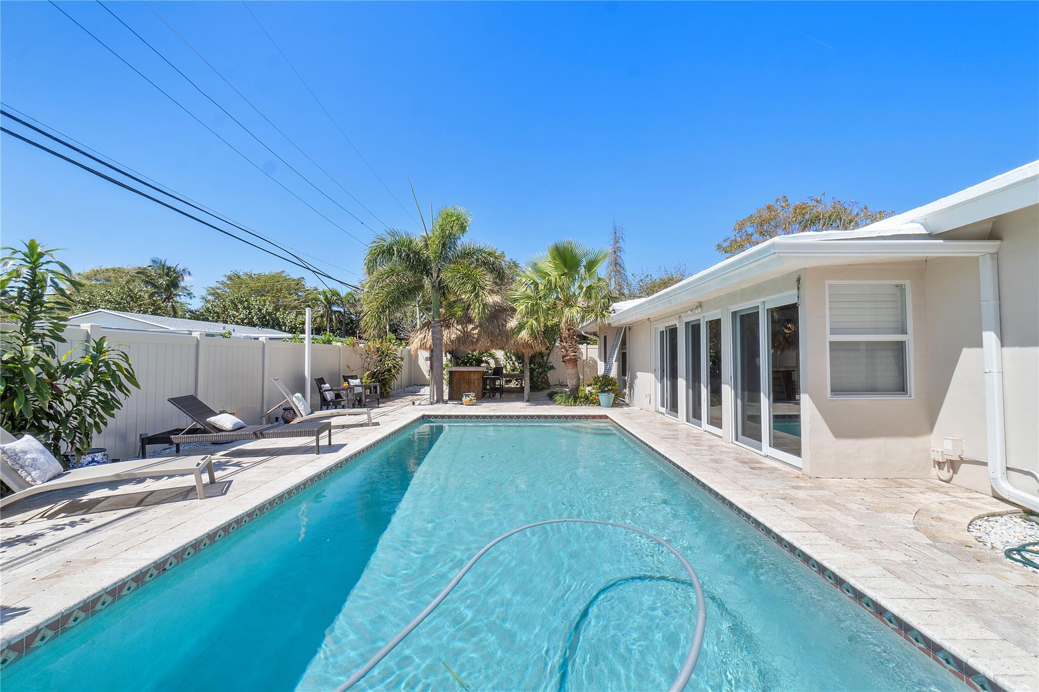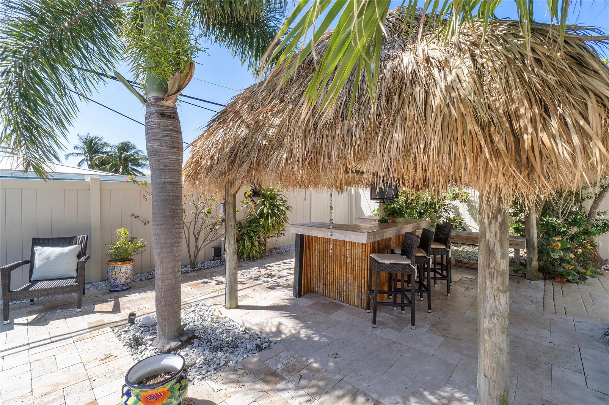 Immerse yourself in this charming 3BR/2BA split floor plan pool home in an East Side haven! Experience the warmth of vaulted ceilings, 24" tile floors, and abundant natural light. Enjoy the tropical oasis with a pool, freshly re-thatched Tiki hut & bar. Updated kitchen, impact windows, and more. The 2.5-car garage boasts a separate laundry/storage room and durable resin flooring. Additional features include A/C (2015), updated electrical panels, 3-zone sprinkler system, and a newer PVC fence. Nestled on a shaded street with a unique median street divider, it's your ideal retreat that's only a short bike or golf cart ride near restaurants, beach, and entertainment!