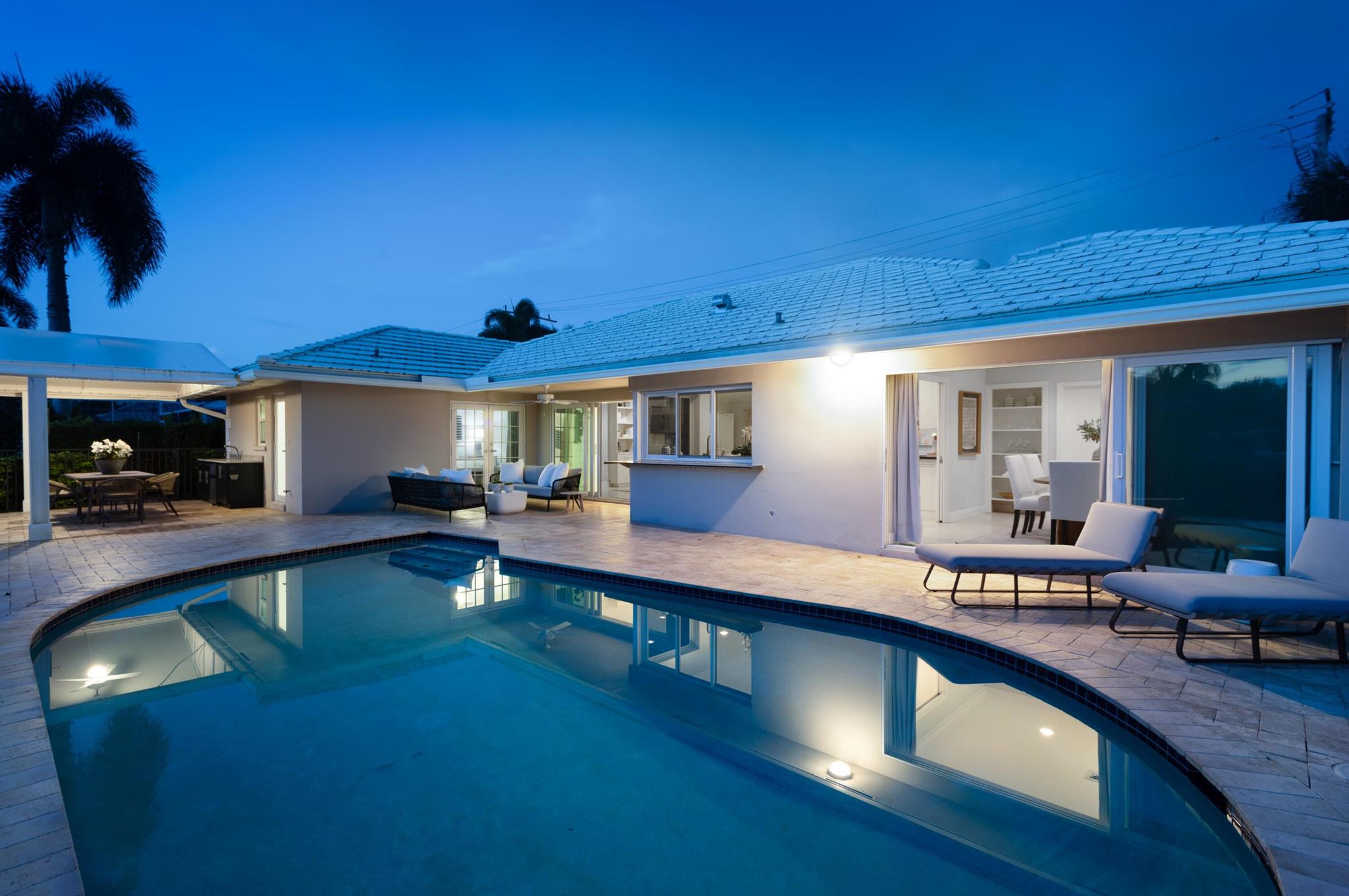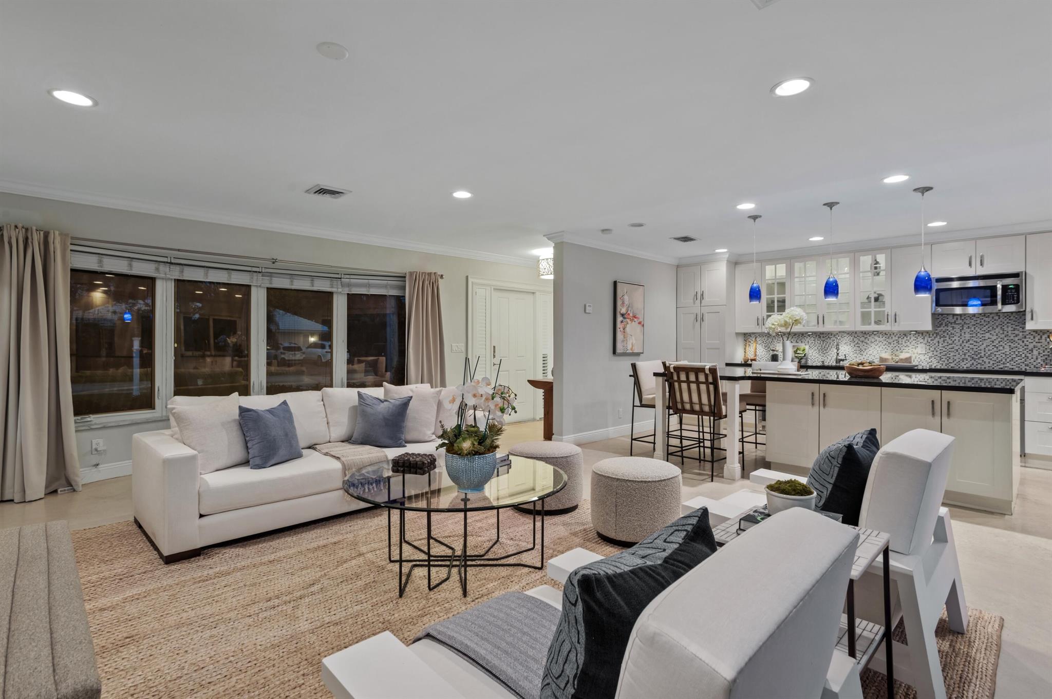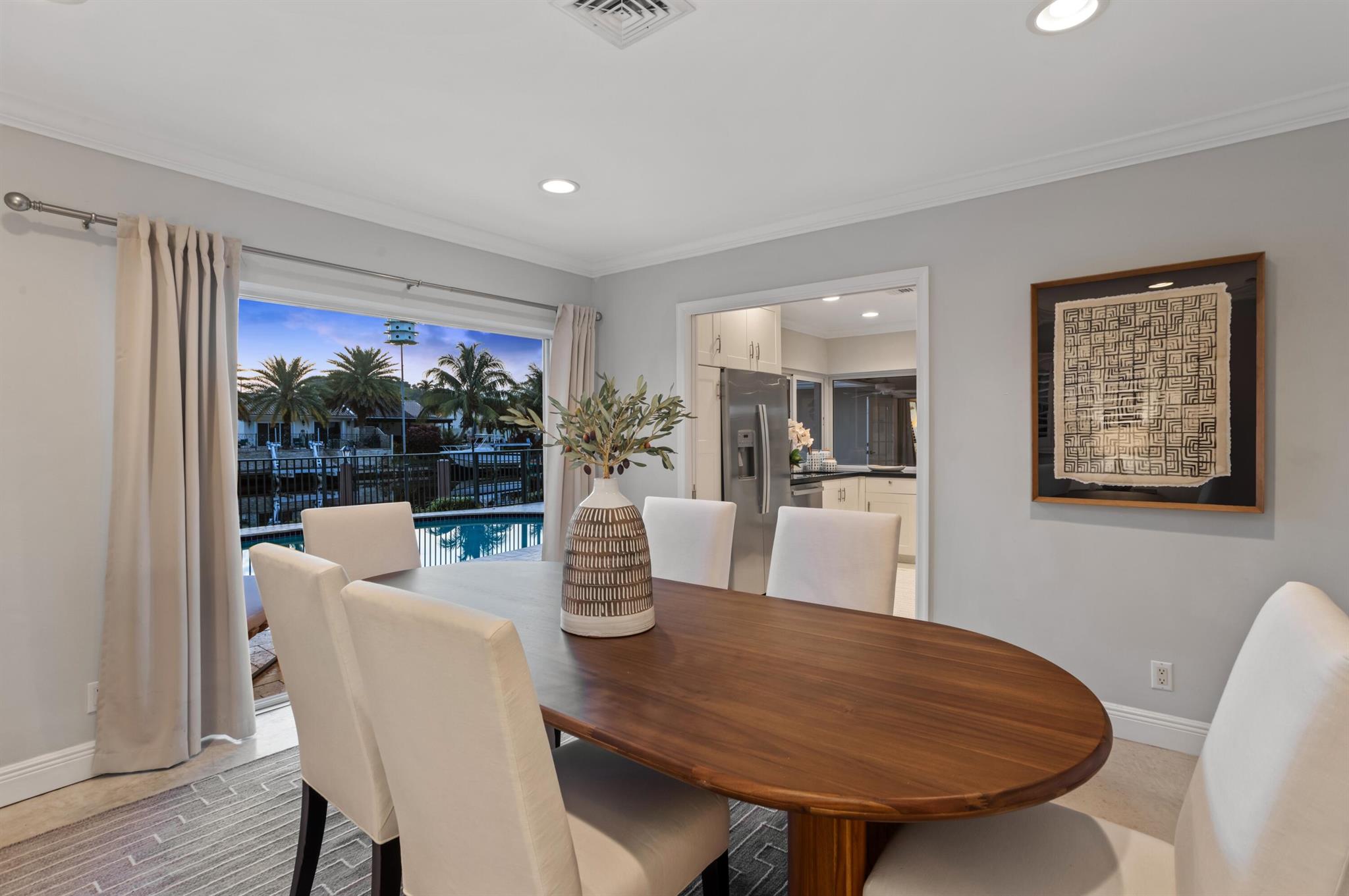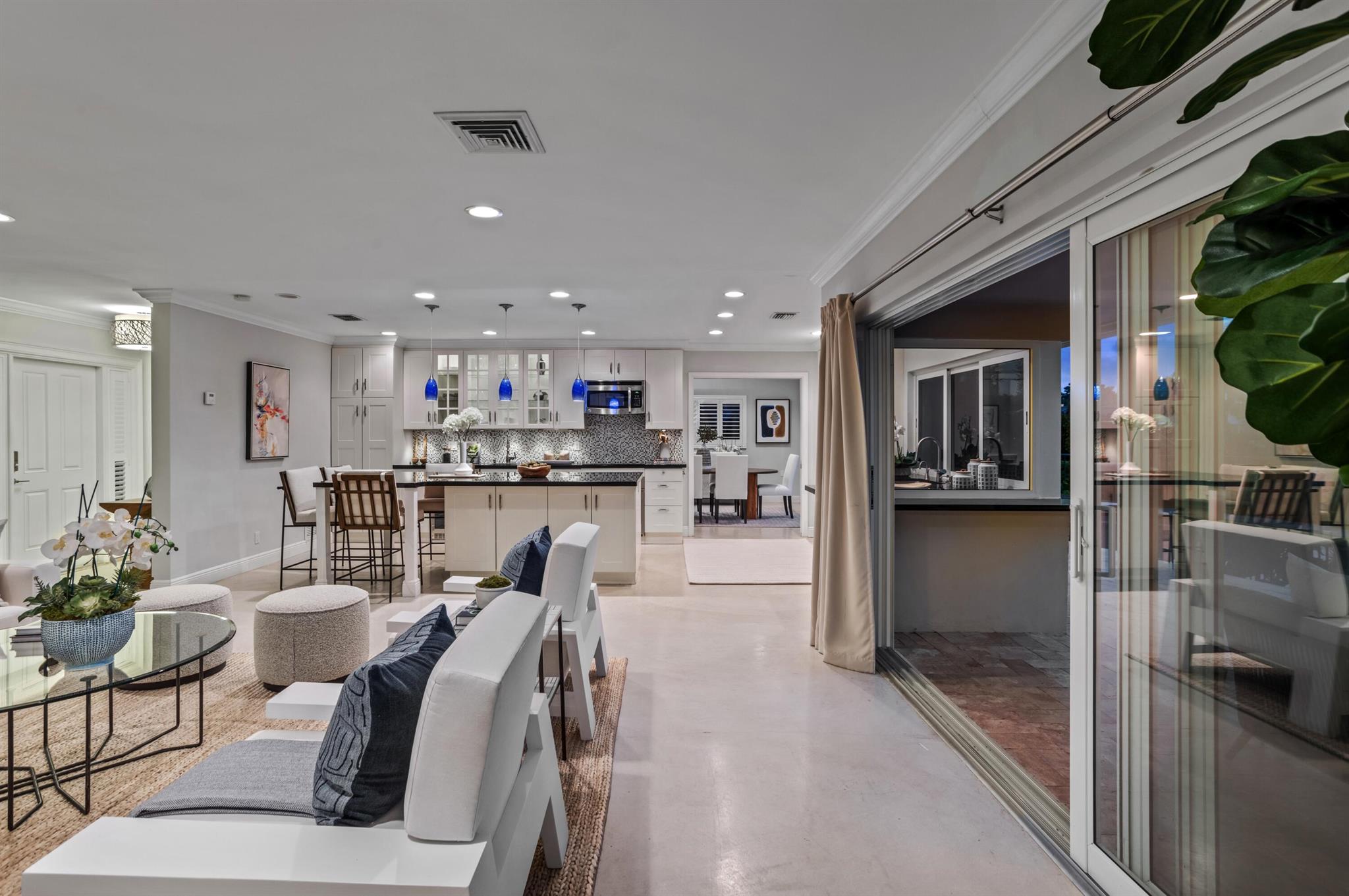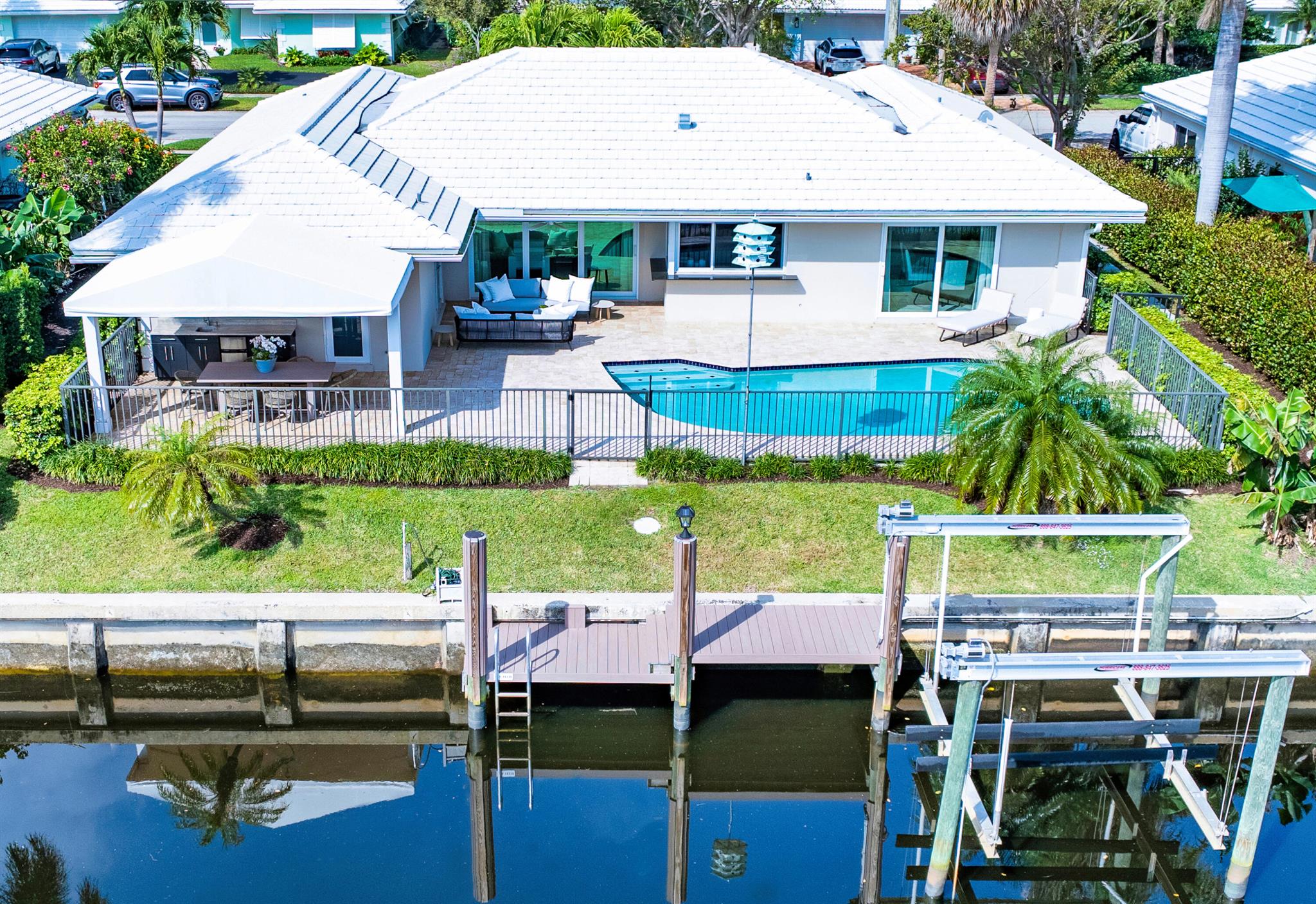 Classic Camino Gardens residence sited on 80 +/- feet of waterfrontage with a dock and lift. The open-concept design is accentuated by stunning polished concrete tile flooring and plantation shutters, exuding a combination of contemporary style and coastal charm. The gourmet kitchen includes an expansive chef's island with casual dining area, innovative appliances, and cabinet uplighting. The primary suite boasts crown molding, a walk-in closet, and striking views of the outdoor oasis through elegant French doors. The en suite bathroom showcases a floating vanity and a frameless glass-enclosed shower. Two guest bedrooms and a den with pocketing doors and en suite bathroom offering versatility. Resort-style pool with lanai and summer kitchen. Shown by appointment only.