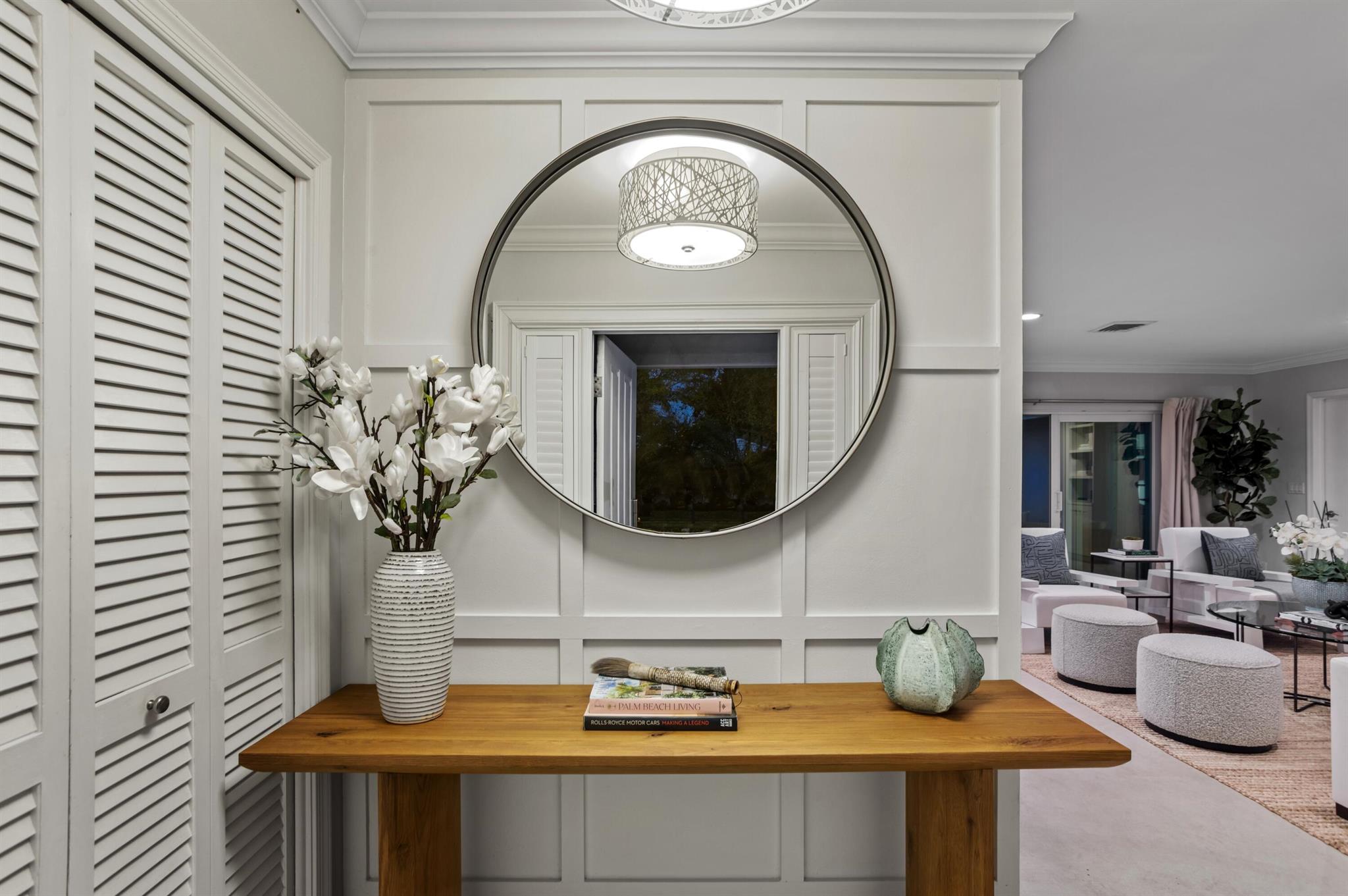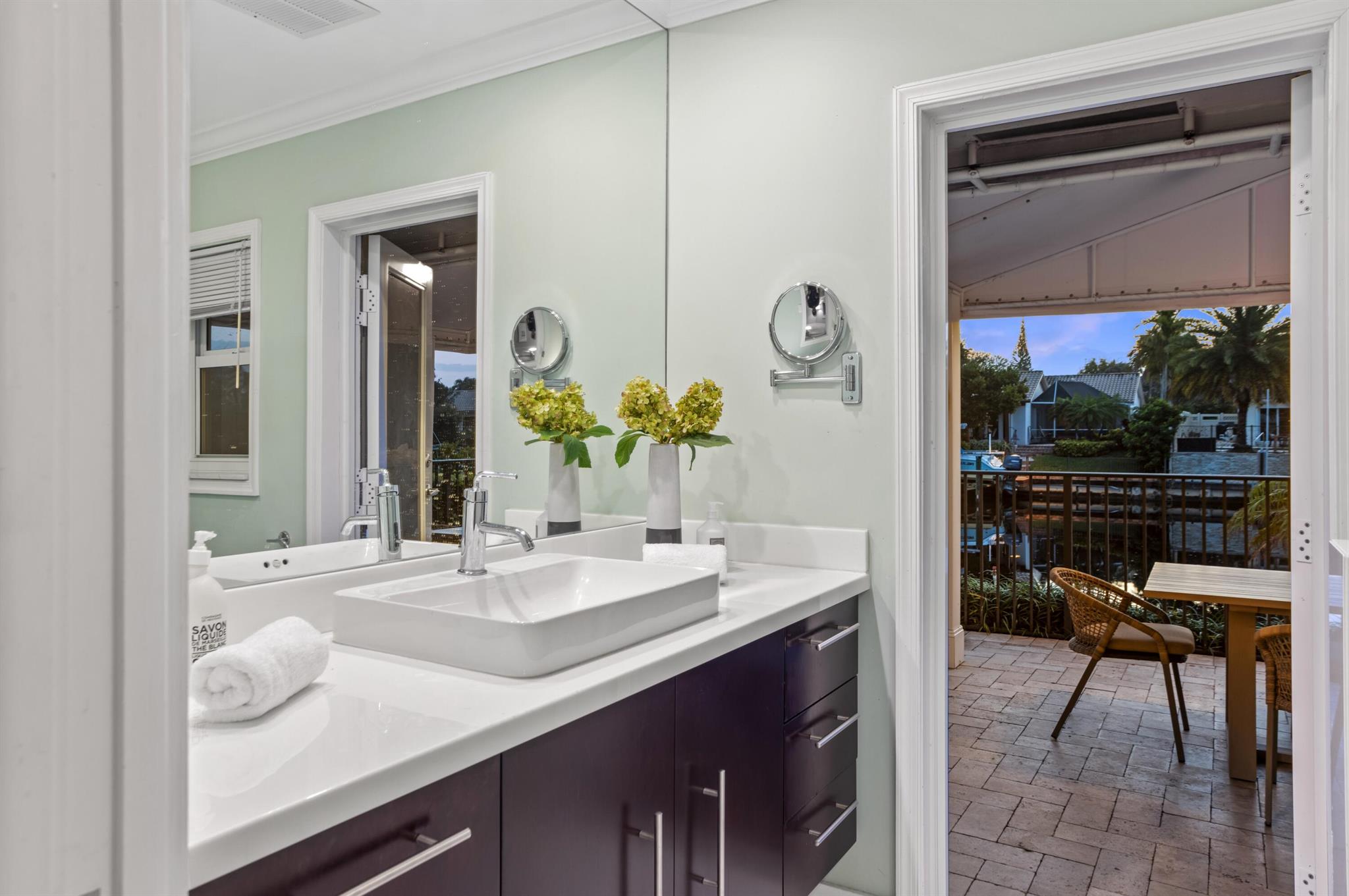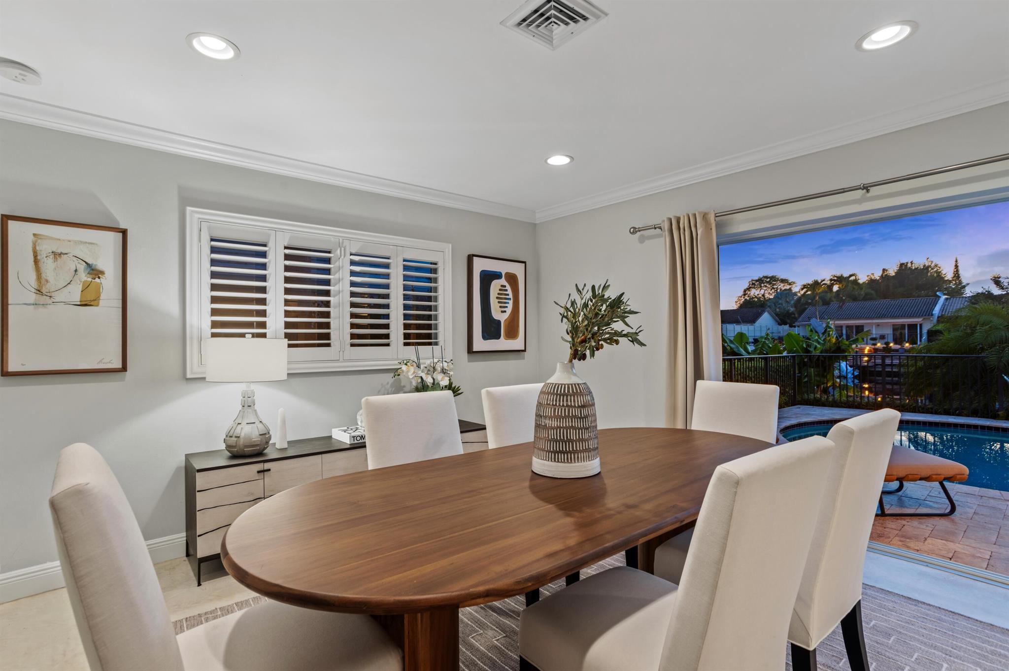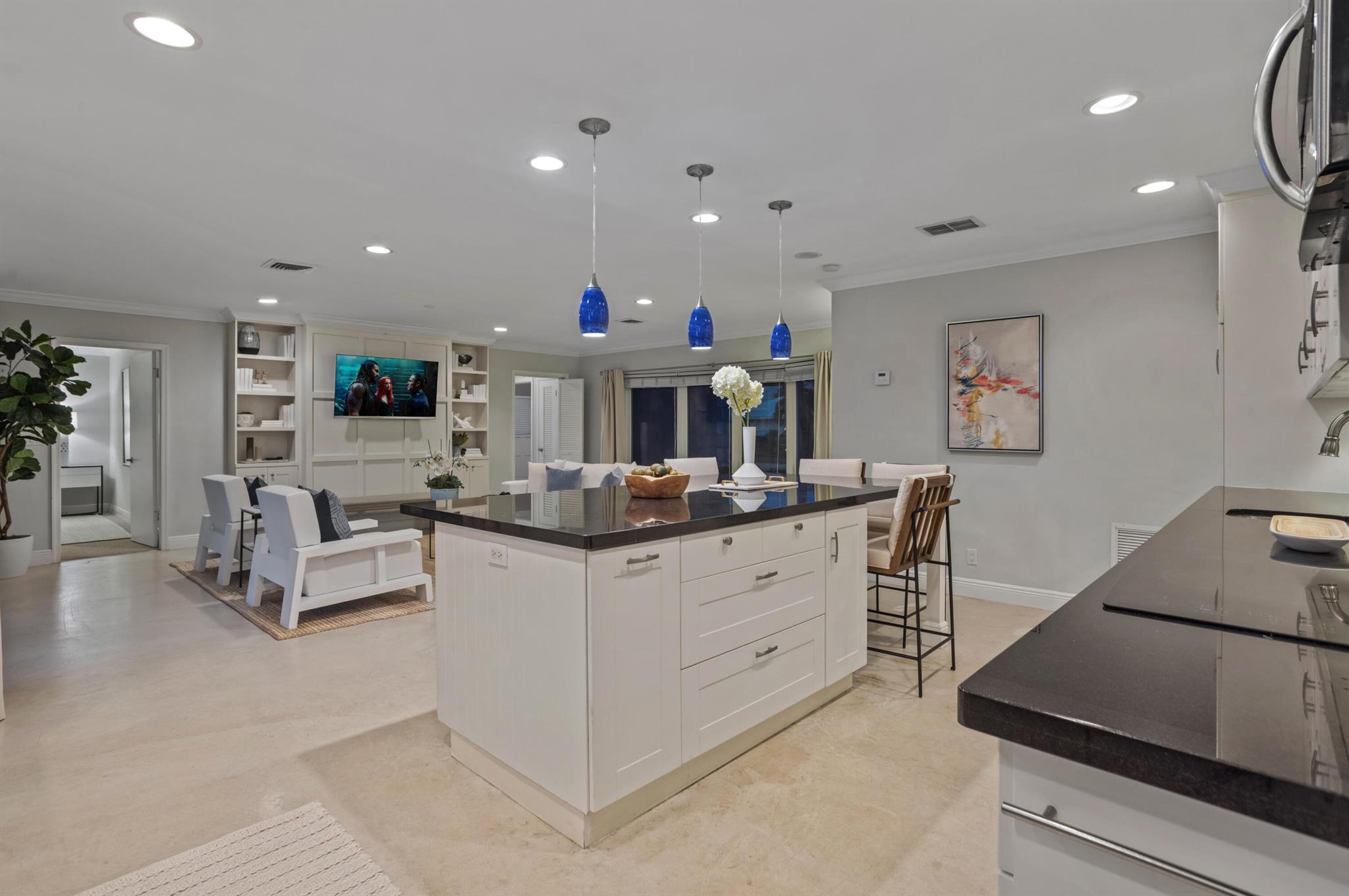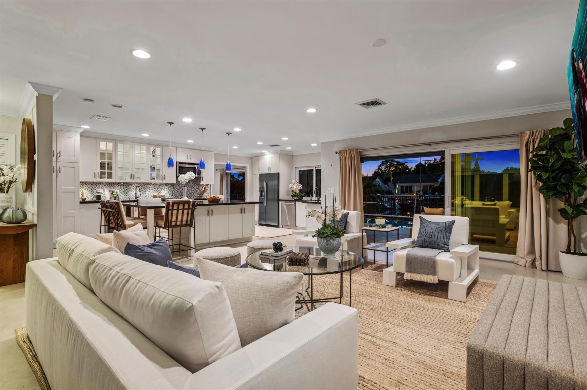 Classic Camino Gardens residence sited on 80 +/- feet of waterfrontage with a dock and lift. The open-concept design is accentuated by stunning polished concrete tile flooring and plantation shutters, exuding a combination of contemporary style and coastal charm. The gourmet kitchen includes an expansive chef's island with casual dining area, innovative appliances, and cabinet uplighting. The primary suite boasts crown molding, a walk-in closet, and striking views of the outdoor oasis through elegant French doors. The en suite bathroom showcases a floating vanity and a frameless glass-enclosed shower. Two guest bedrooms and a den with pocketing doors and en suite bathroom offering versatility. Resort-style pool with lanai and summer kitchen. Shown by appointment only.