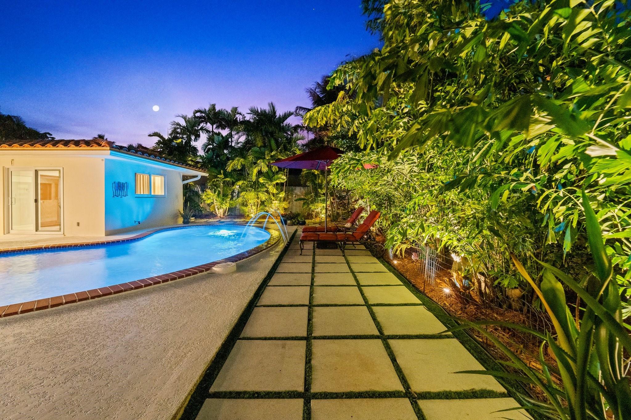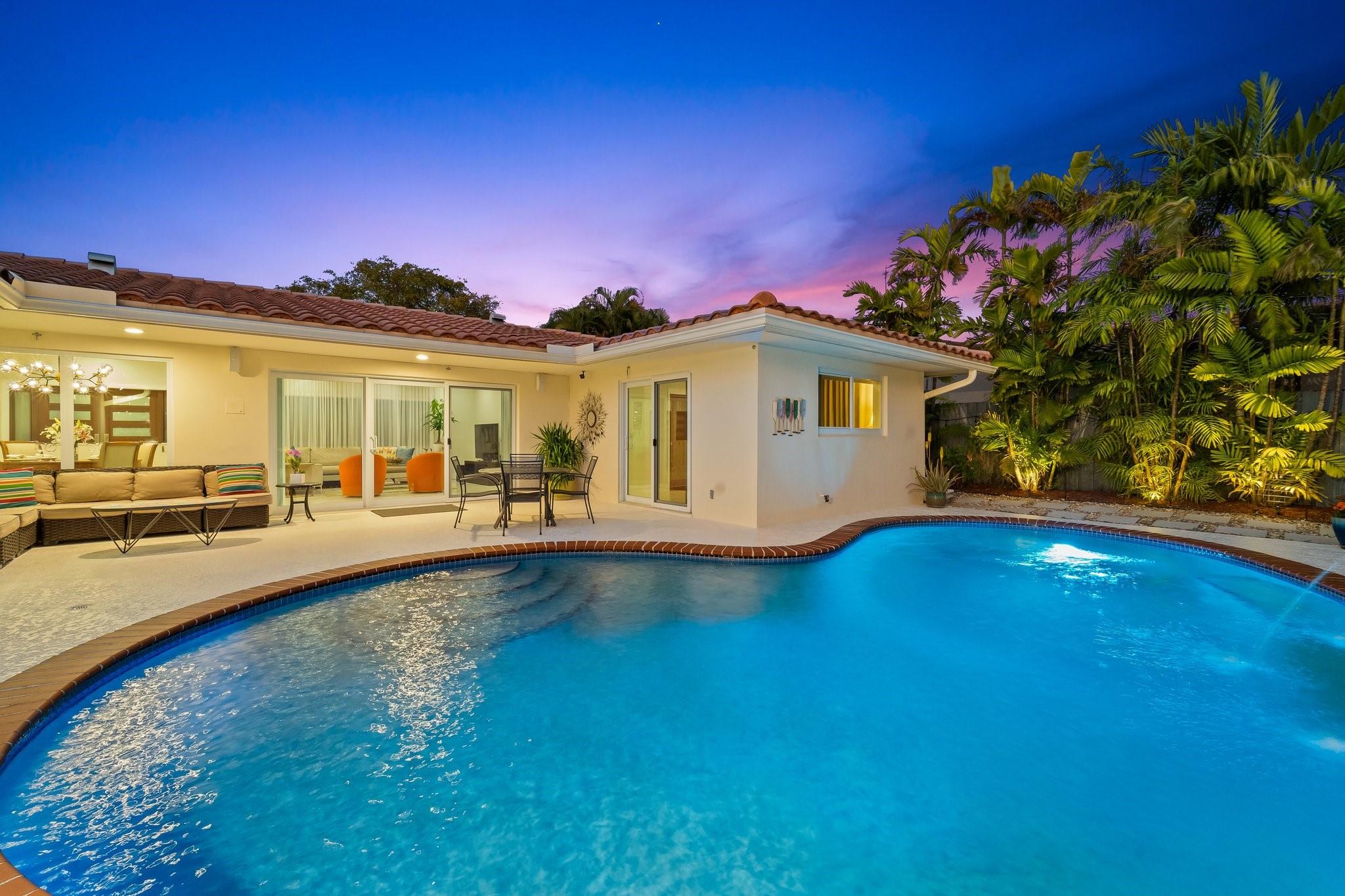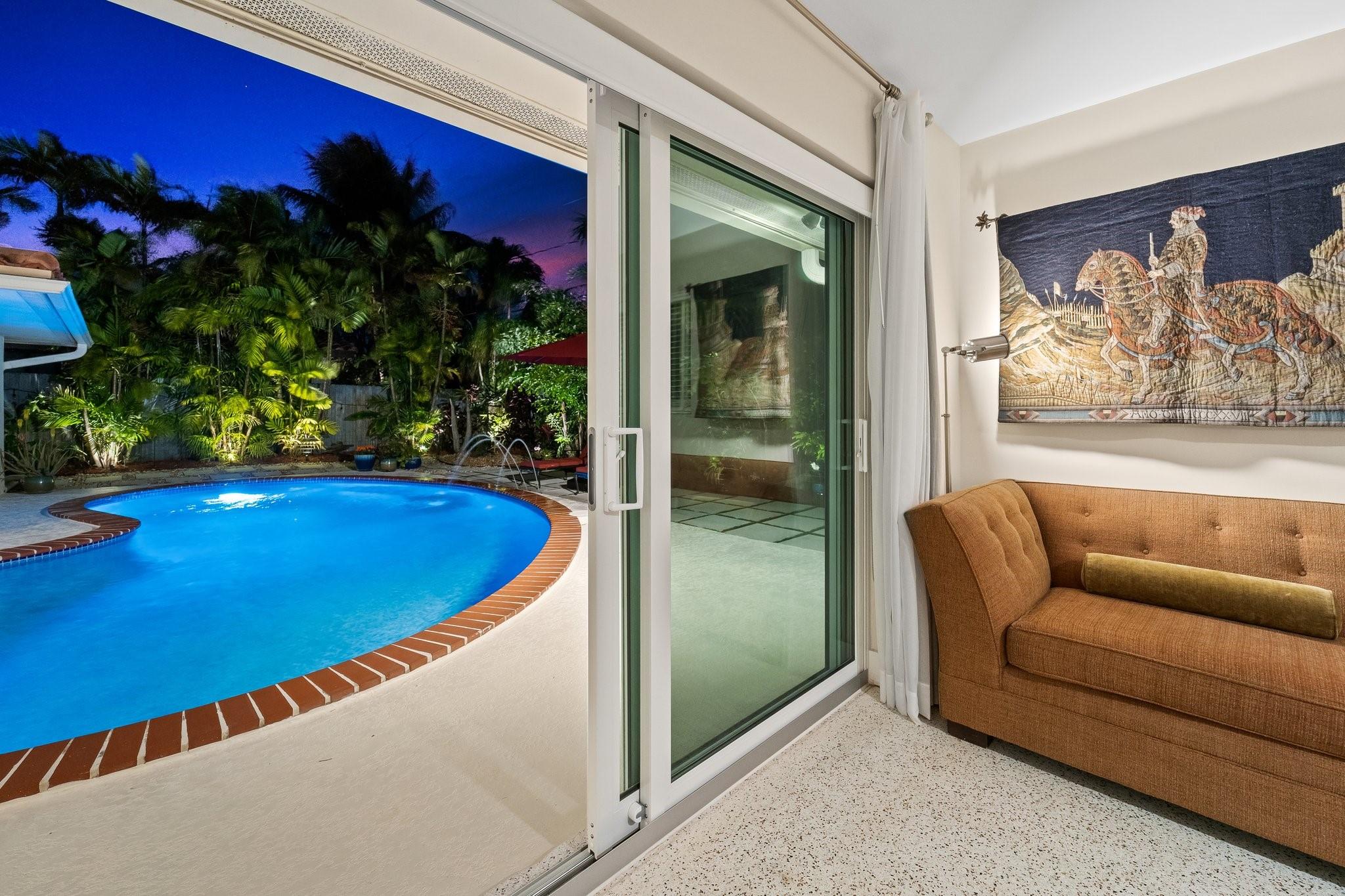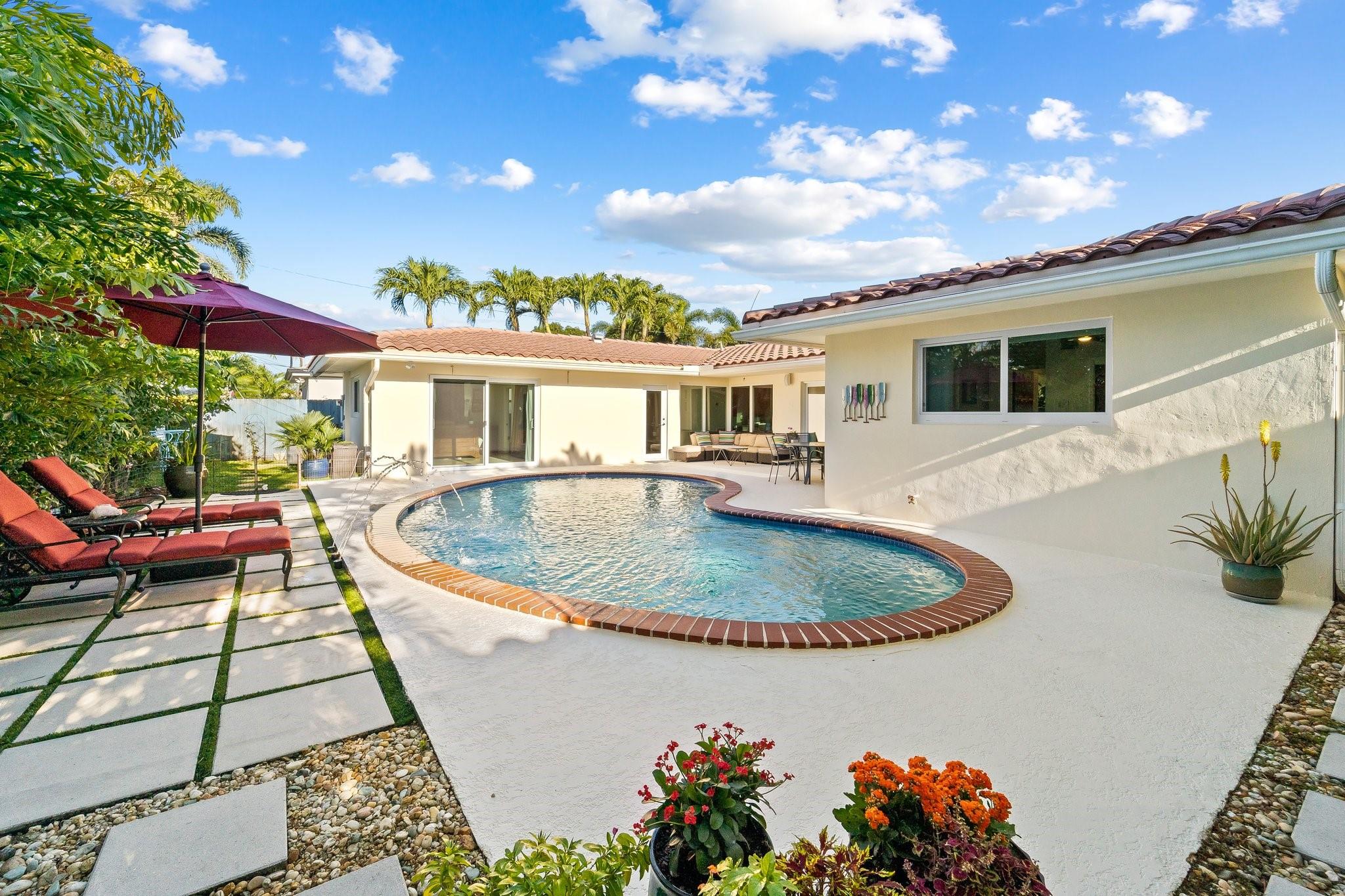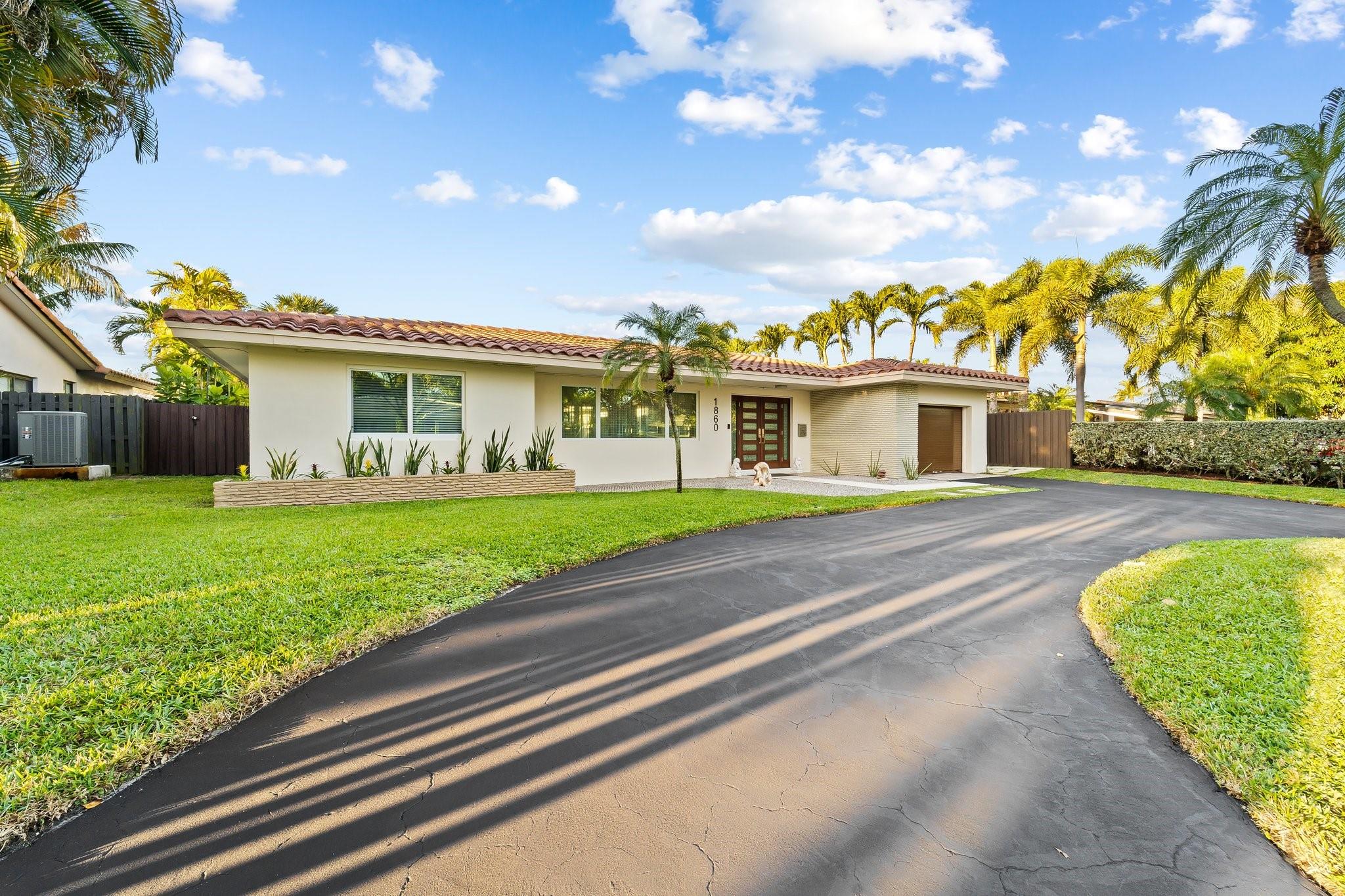 Experience the epitome of mid-century charm blended with modern luxury in the prestigious Coral Ridge neighborhood, just minutes from the pristine beaches and the vibrant heart of Fort Lauderdale. This exquisite fully renovated residence, nestled within a tranquil setting, offers an unparalleled lifestyle with proximity to the Coral Ridge Golf and Country Club, Wilton Manors, Las Olas's shopping and dining delights. The home's thoughtful split floor plan includes an adaptable office space, seamlessly doubling as a fourth bedroom. Interior spaces are bathed in natural light, thanks to expansive walls of glass that forge a harmonious connection between the indoors and a mesmerizing outdoor courtyard and saltwater pool.