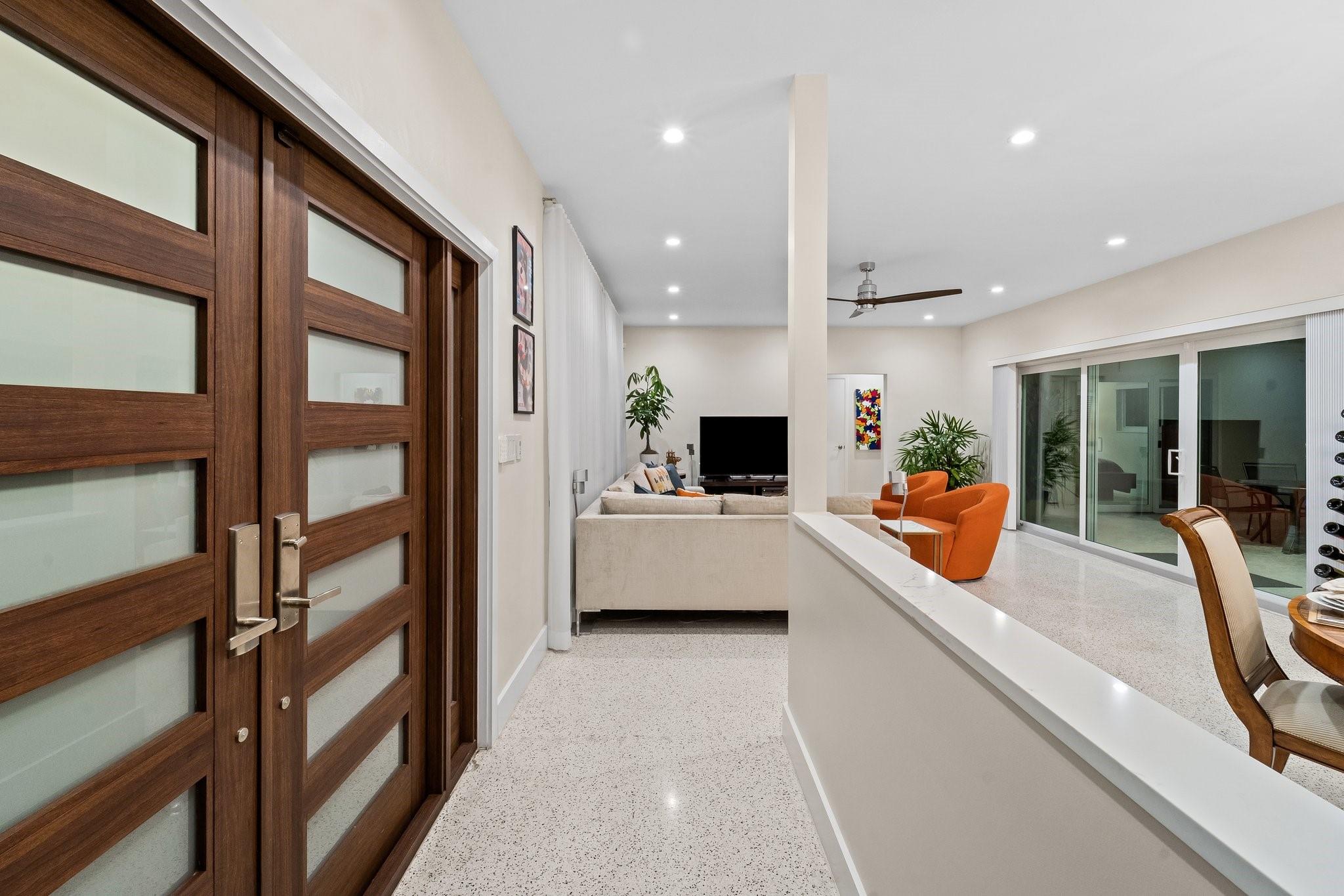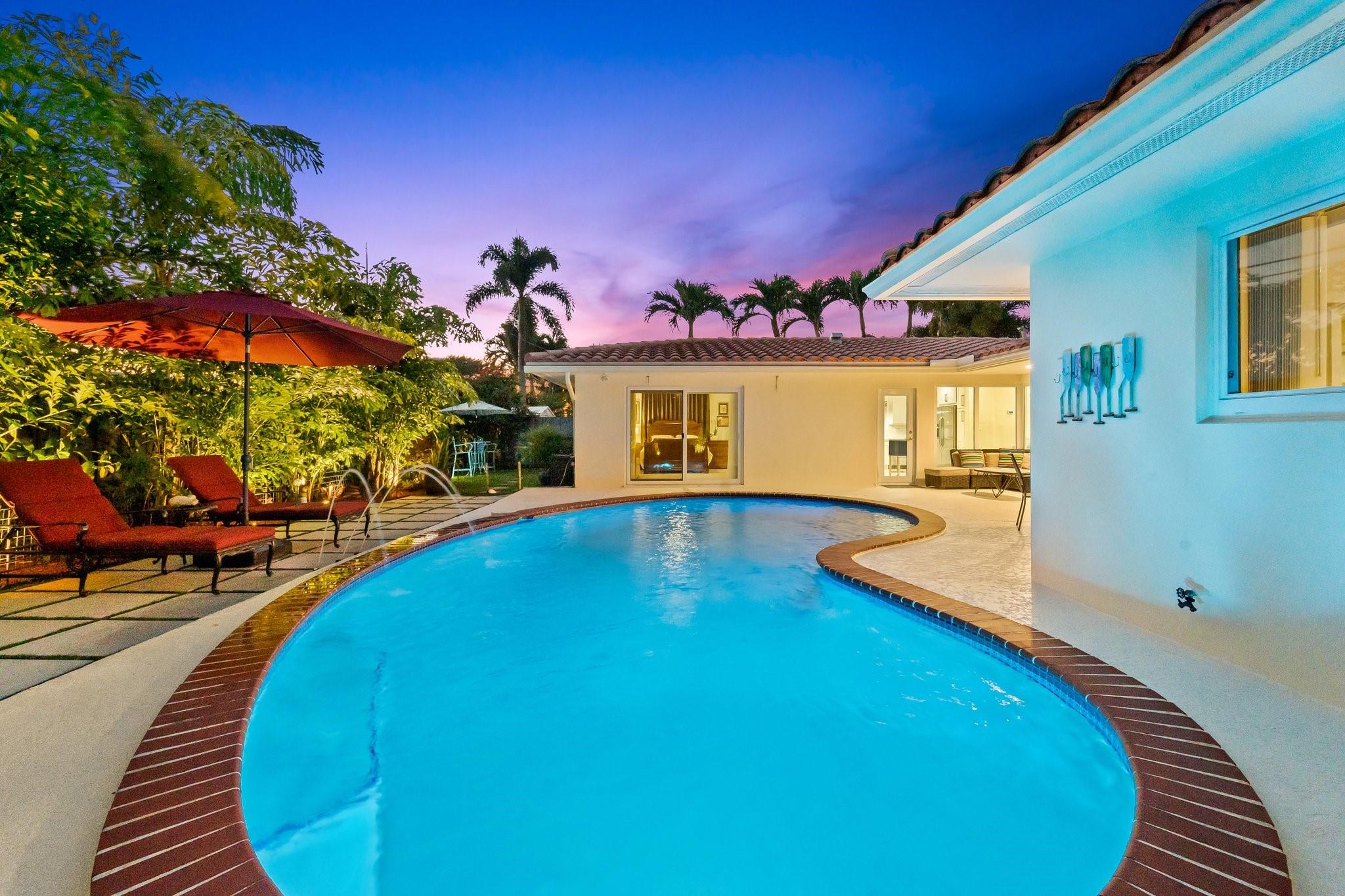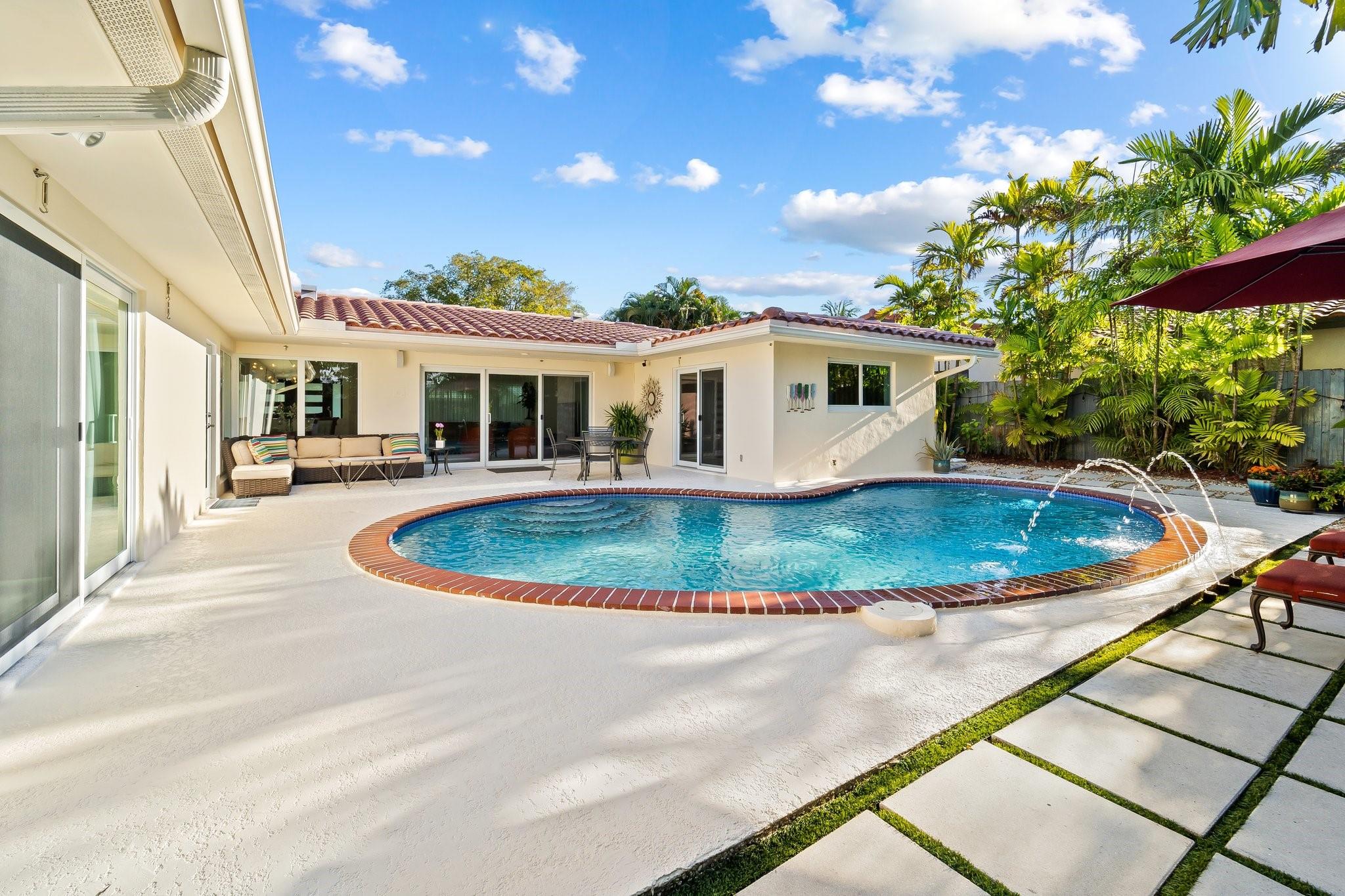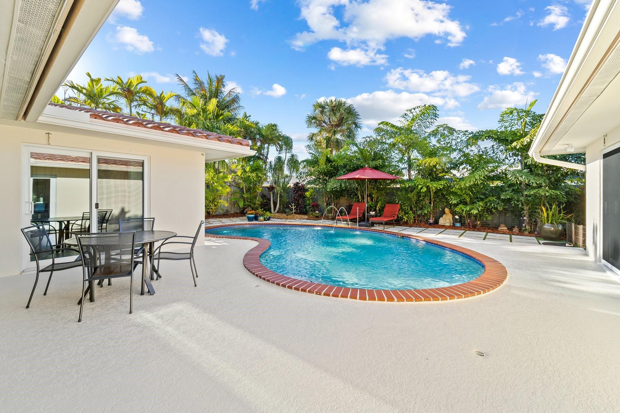 Experience the epitome of mid-century charm blended with modern luxury in the prestigious Coral Ridge neighborhood, just minutes from the pristine beaches and the vibrant heart of Fort Lauderdale. This exquisite fully renovated residence, nestled within a tranquil setting, offers an unparalleled lifestyle with proximity to the Coral Ridge Golf and Country Club, Wilton Manors, Las Olas's shopping and dining delights. The home's thoughtful split floor plan includes an adaptable office space, seamlessly doubling as a fourth bedroom. Interior spaces are bathed in natural light, thanks to expansive walls of glass that forge a harmonious connection between the indoors and a mesmerizing outdoor courtyard and saltwater pool.