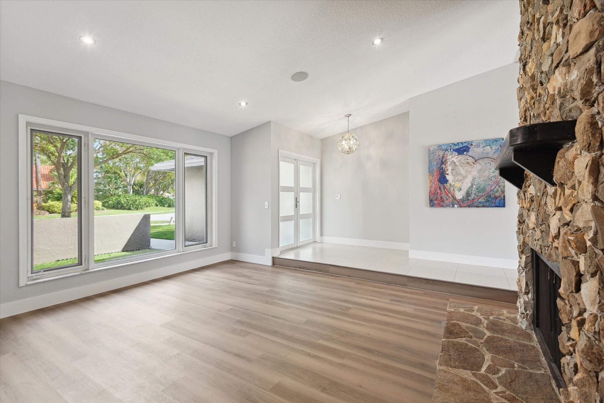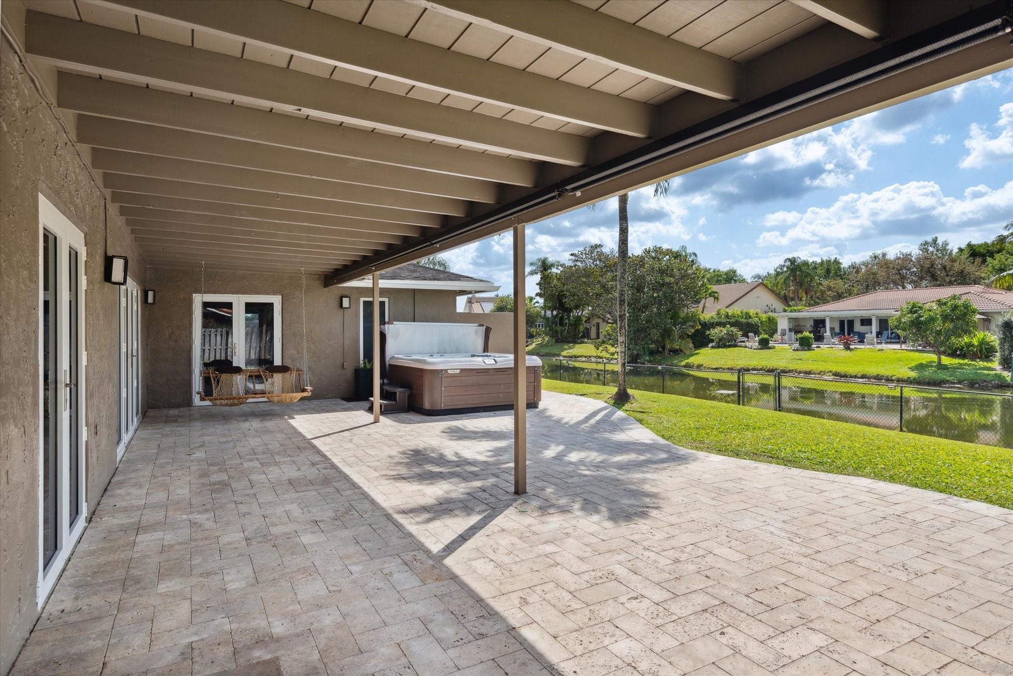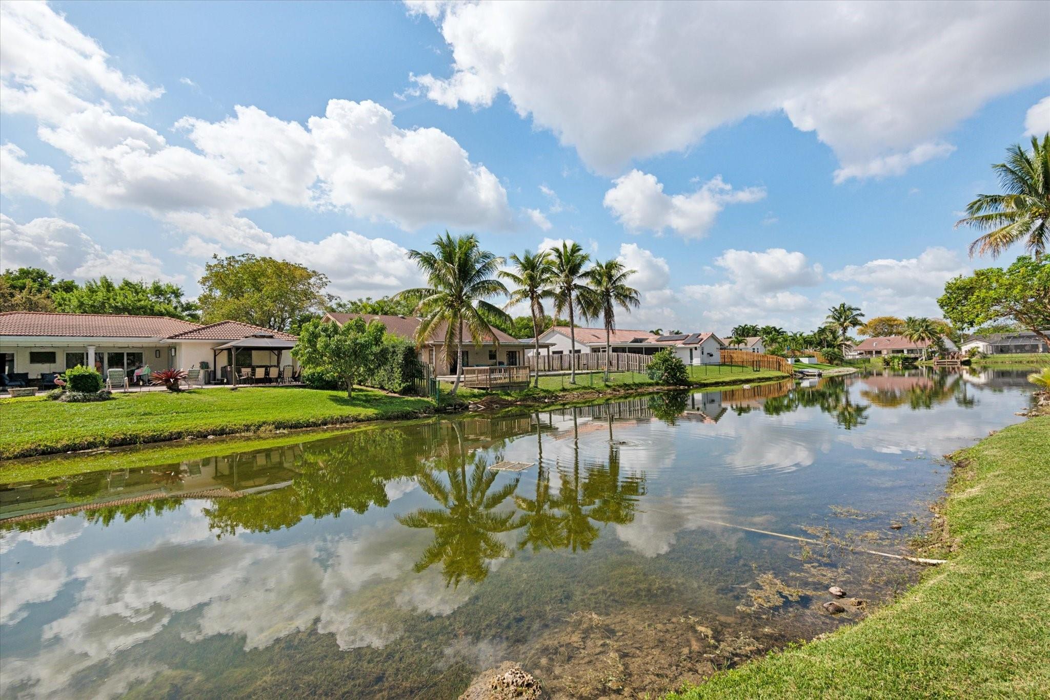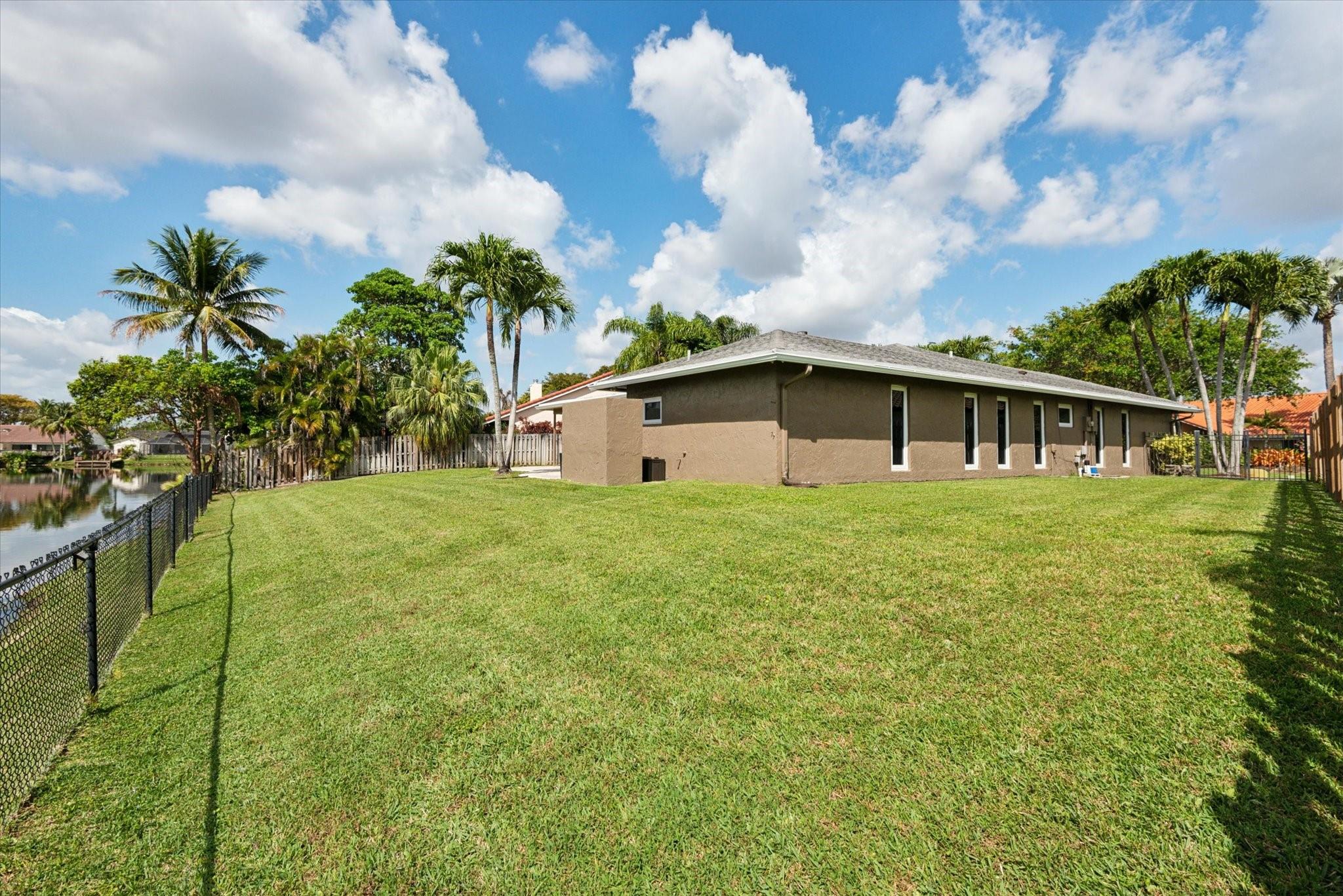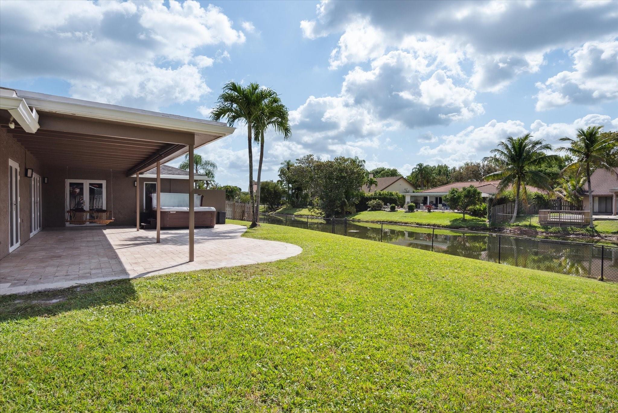 Just listed in Jacaranda Lakes is this updated and move in condition 4BR, 2 Bath home on a lg. interior waterfront lot with a hot tub! Beautiful open floor plan upon entry is great for entertaining. Vaulted ceilings and wood burning fireplace in formal living room open to dining room. New vinyl wood floors in bedroom foyer, all bedrooms & living room. The remainder of the home is tiled! Extra-large granite island in kitchen easily seats four people with induction range & double ovens (drawer under oven is second oven), microwave, and water filtration system at kitchen sink! Top of the line stainless steel appliances including an LG refrigerator. Both bathrooms updated to today's standards! Split A/C in gar. Beautiful yard can easily fit a pool & swing set. Hookup for generator.