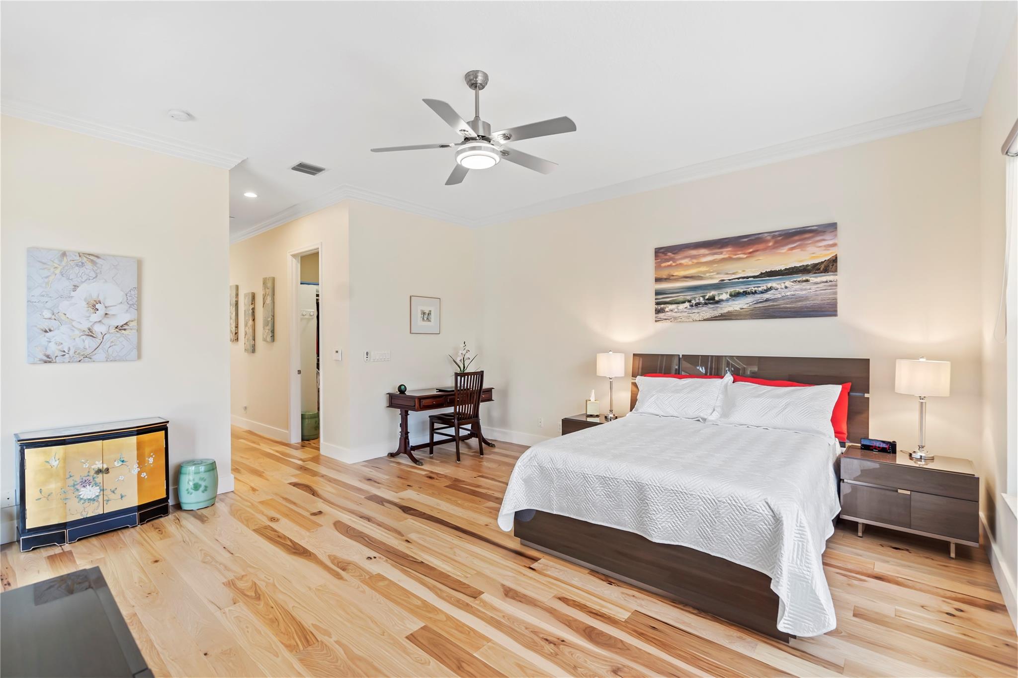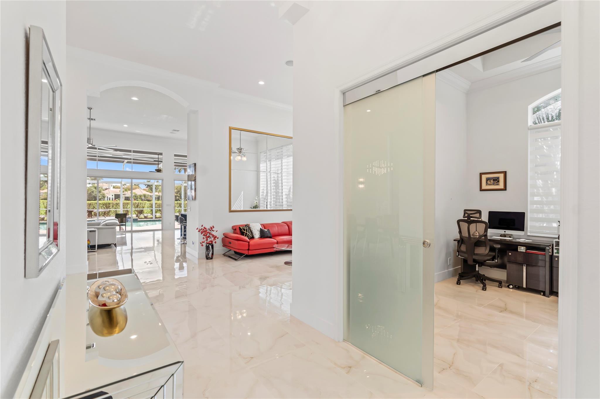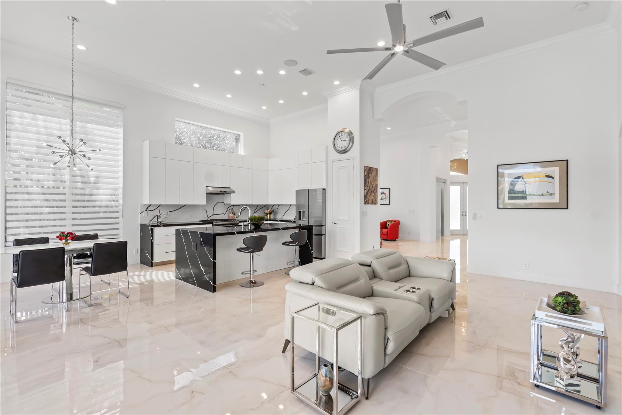 Rarely available, completely renovated 3 BR + Den/Office, 3 BA (Cambridge model) home with a pool and a golf cart garage. New chef's kitchen with modern European cabinetry, quartz countertops, stainless appliances including a double oven natural gas stove and a huge island that opens to the family room with views of the pool. Gorgeous 24x48 porcelain tile floor in the living areas & office and hardwood floors in the bedrooms. Updates include a new Roof/gutters and single glazed impact glass front door (2022) & 2 new A/C's (2023). The primary bedroom has 2 walk-in closets and a new luxurious ensuite featuring imported German Dornbracht fixtures and faucets, new vanities with quartz countertops, porcelain tile, anti-fog powered mirrors & soaker tub encased in marble tile.
