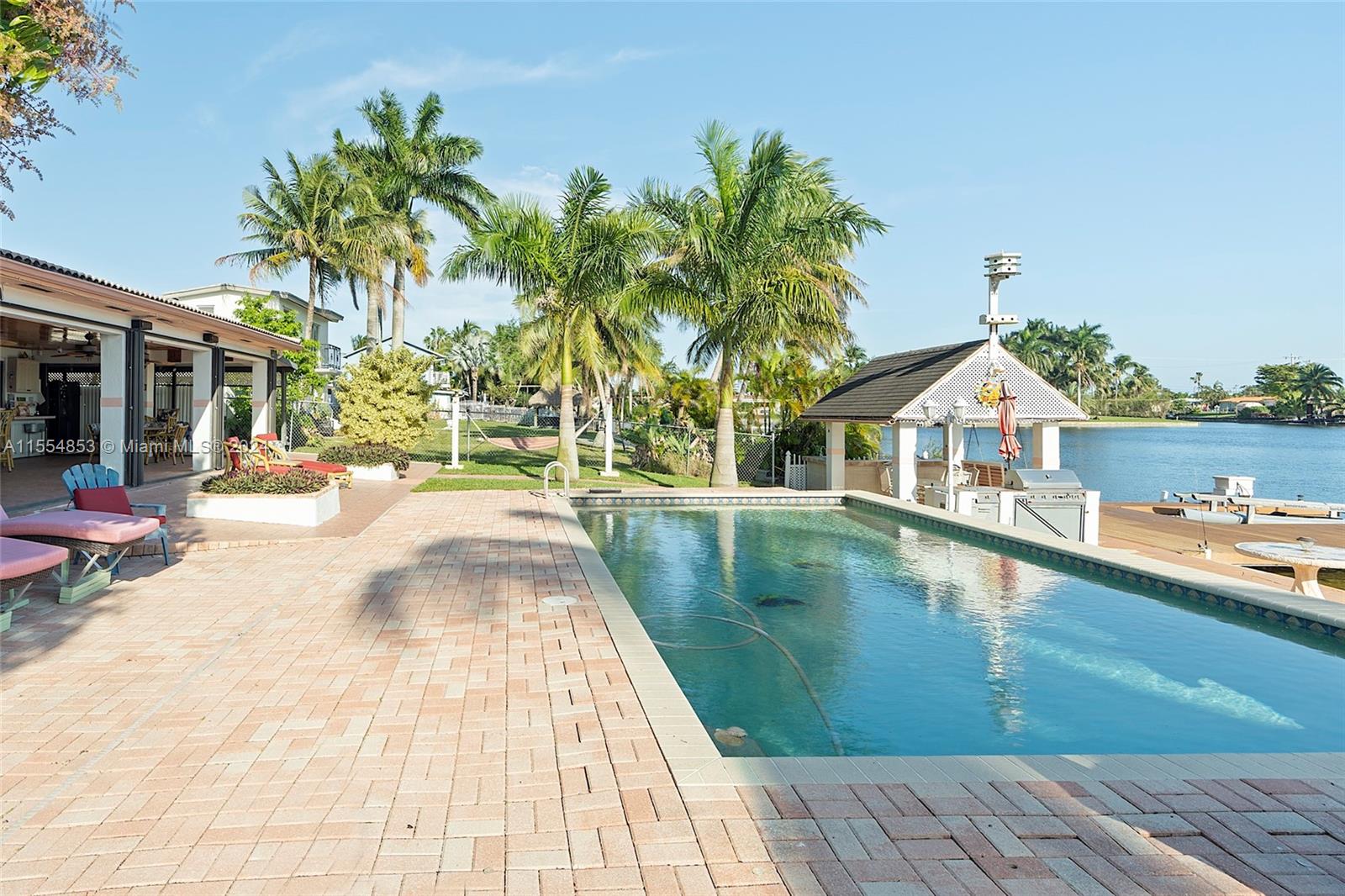Beautiful lakefront home in Palm Springs North! Spacious 3BR/2BA with 1-car garage, circular driveway, porcelain tile, updated kitchen/baths, SS appliances, reverse osmosis system, partial impact windows and full size accordion shutters to supplement. Enjoy a covered patio with bar, saltwater pool, beach area, gazebo/wet bar with grill, and private dock with boat lifts. Prime location near I-75/Turnpike & 826. A must-see paradise!