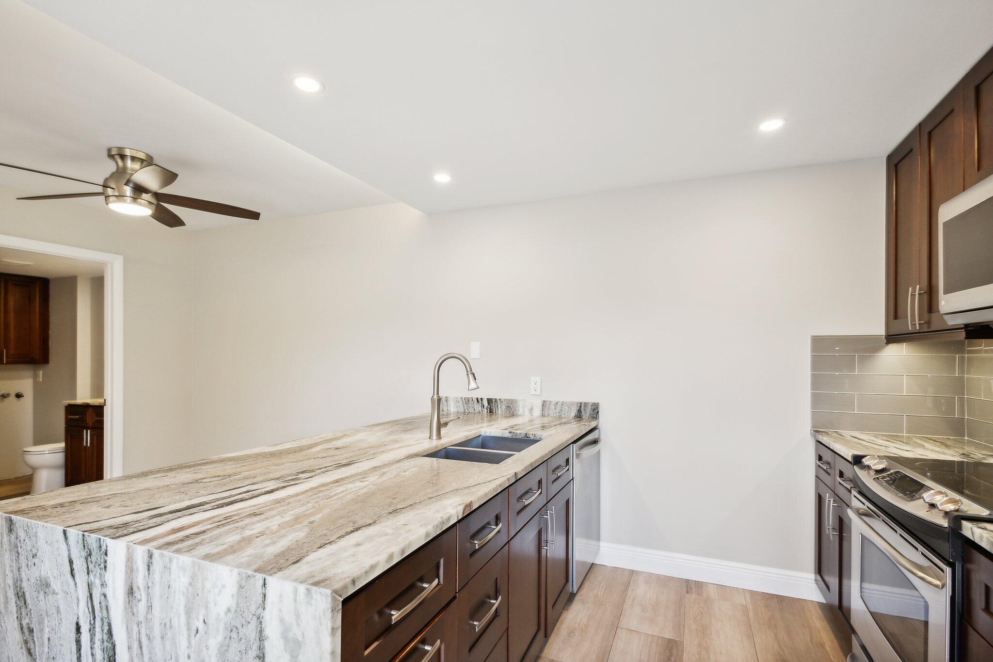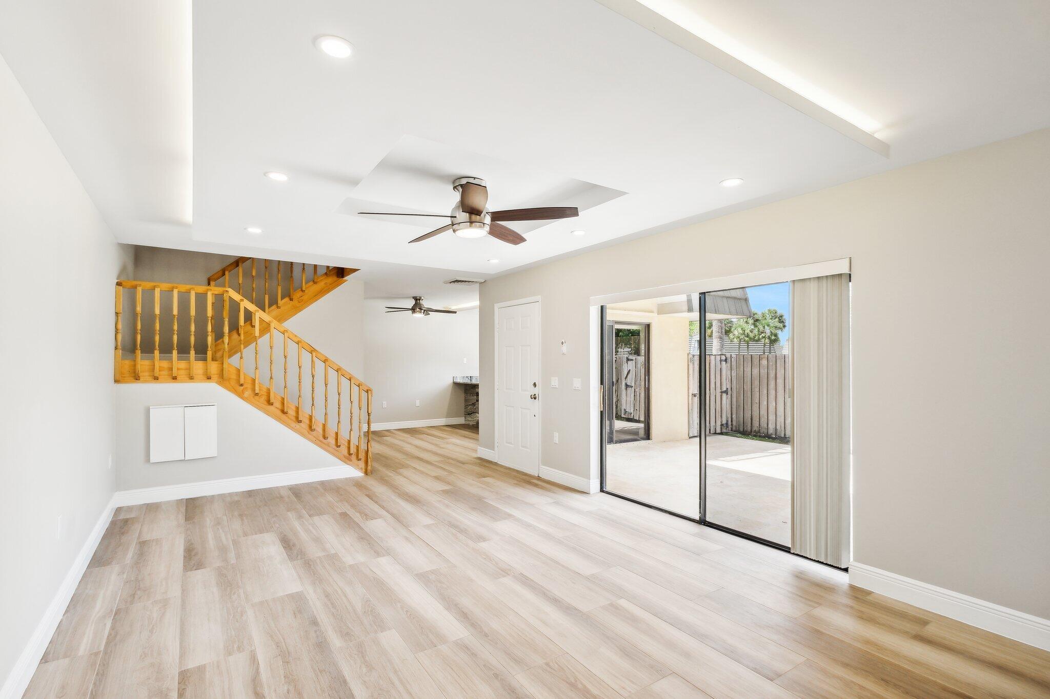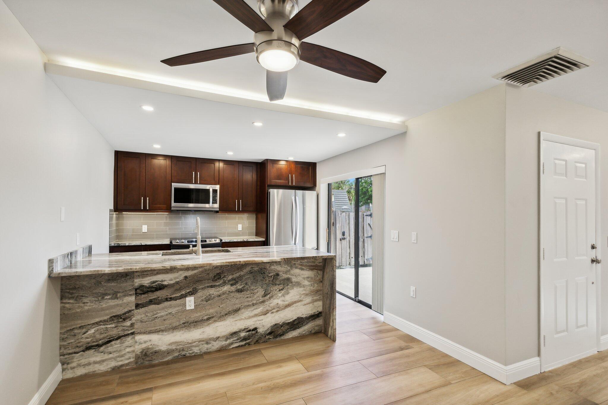 This Beautifully upgraded and spacious town home is the nicest in Sandalwood! Gorgeous kitchen features marble waterfall countertops, rich wood cabinets and stainless steel appliances. All bathrooms are redone with marble and wood as well. Wood look tile throughout. High hat lighting and upgraded recessed halo lighting. Marble patio with lovely landscaping. Roof 2018. AC 2018. Water heater 2017. Clear hurricane shutters. Freshly painted and not a thing to do! The community offers 3 saltwater pools, tennis, bocce ball, Raquetball, playgrounds, green spaces, walking/jogging/exercise trails and lakes. HOA includes insurance, roof, water, sewer, trash and cable. The Ballpark of the Palm Beaches is next door - MLB spring training with the Houston Astros and Washington Nationals.
