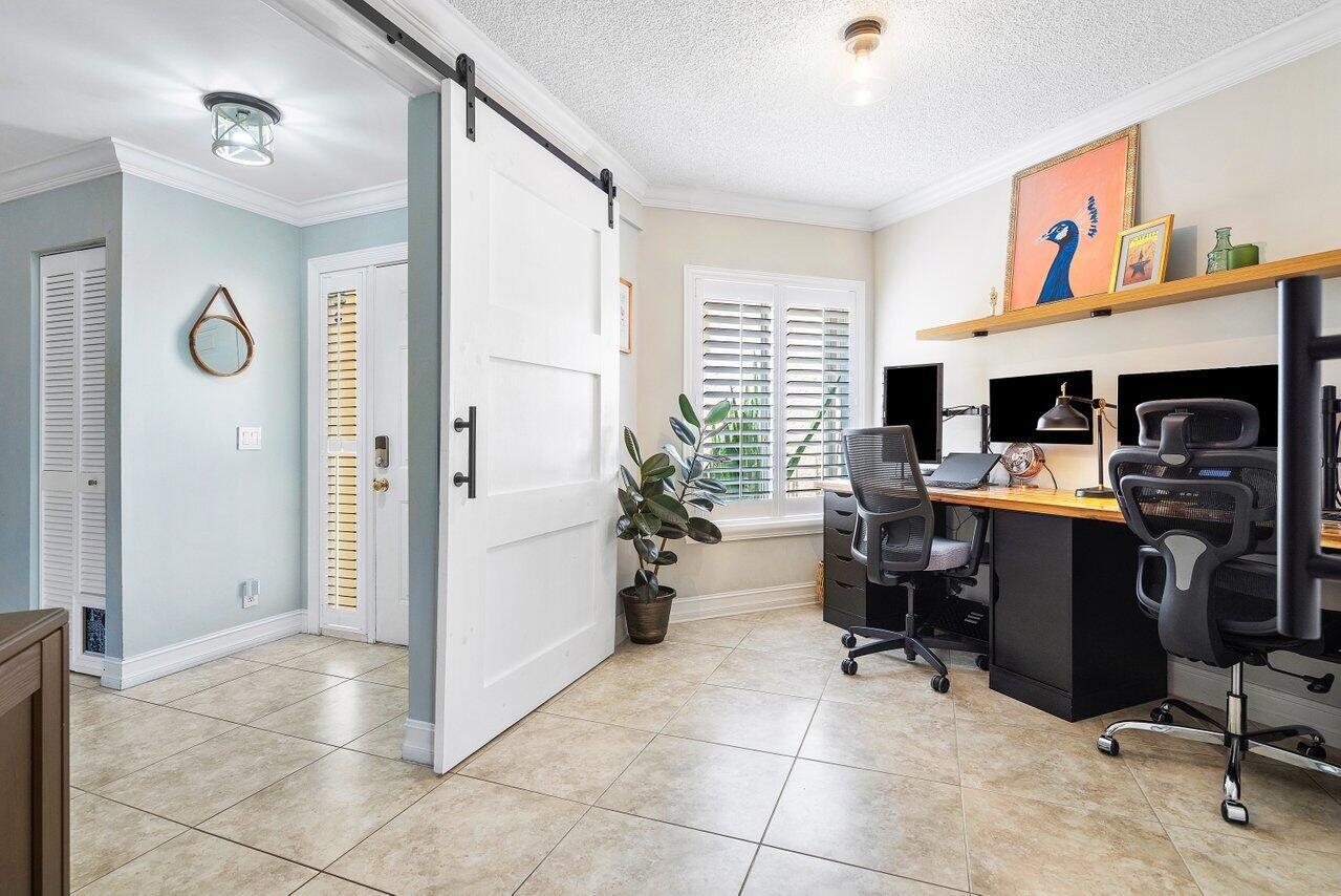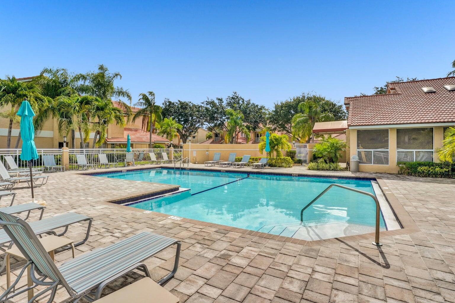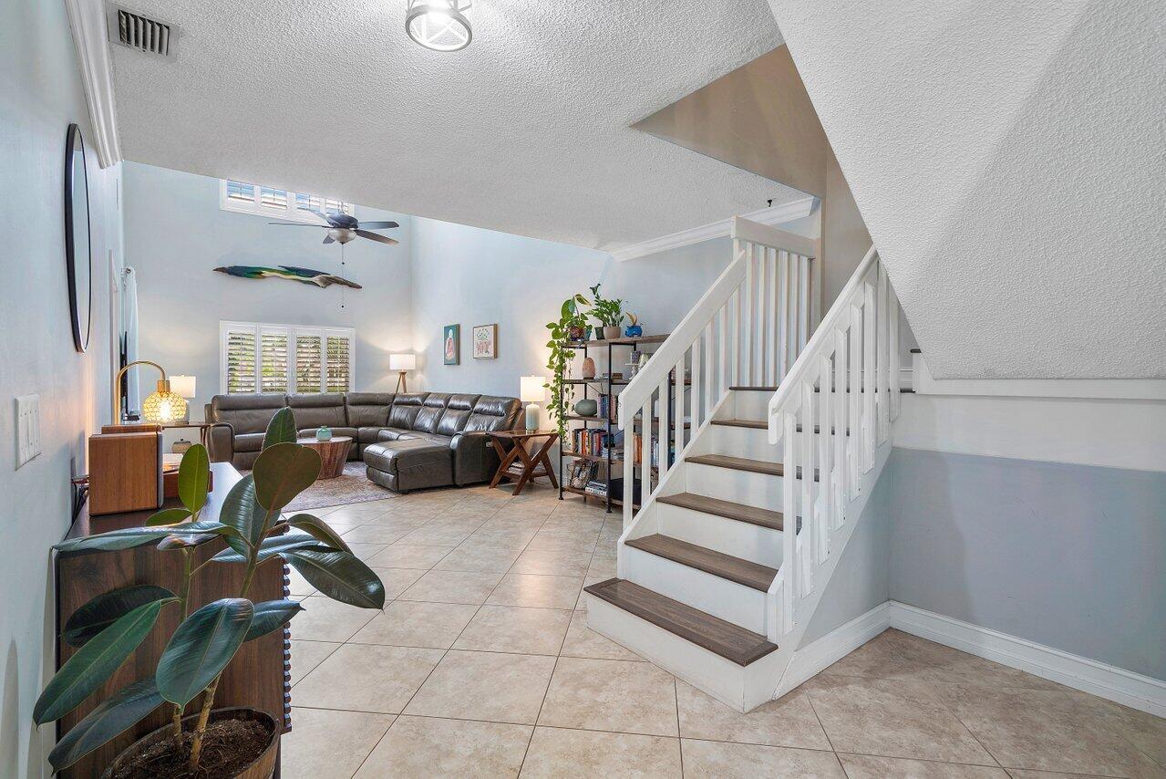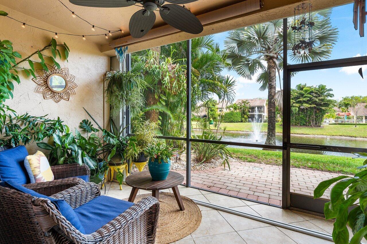 This fantastic 3 bedroom + office, lakefront, townhome has a long list of upgrades from the New Chef's kitchen with all Samsung appliances and Brazilian Walnut counters and beautiful wood floors upstairs to the Accordian shutters on all windows, gorgeously renovated bathrooms including the stunning Primary bathroom with soaking tub and separate shower. The living room has dramatic vaulted ceilings and wonderful lake views. There is a screened porch + a paver patio to enjoy the beautiful lake and wonderful eastern exposure. Boca Isles offers a newly renovated heated & chilled pool, hot tub and exercise room. Located in wonderful SE Boca with all A rated schools. HOA is installing all new roofs and painting this year. Maintenance includes Insurance, Alarm, Roofs, Cable TV & Water