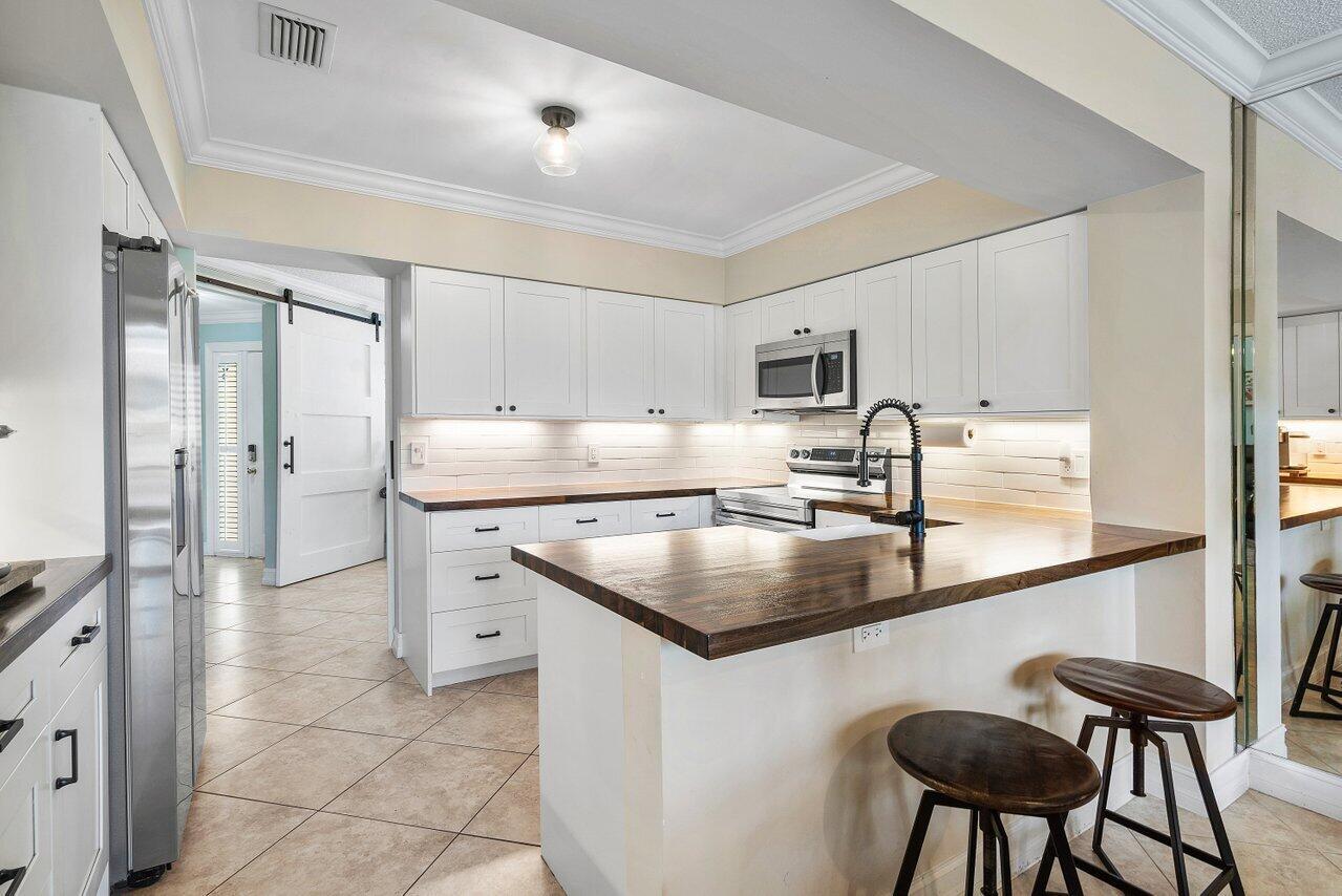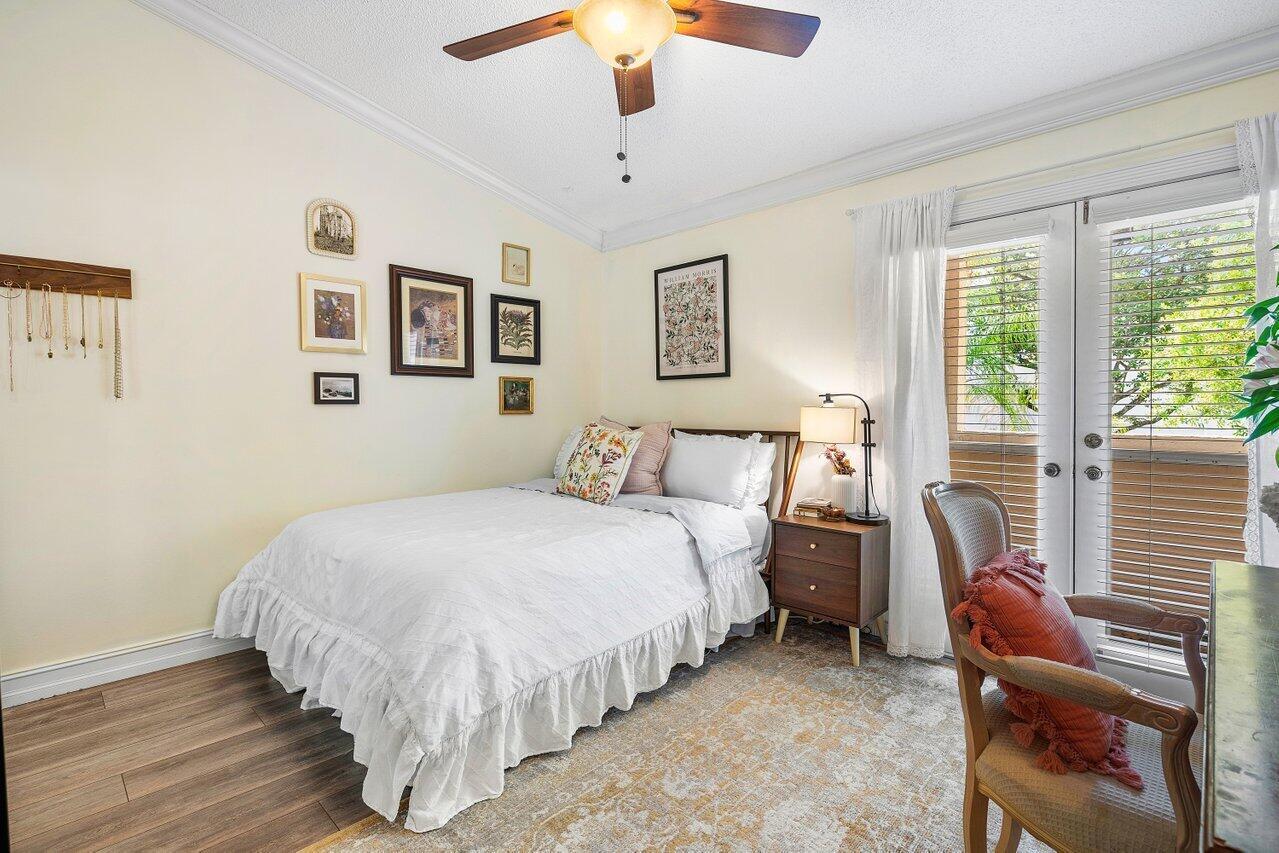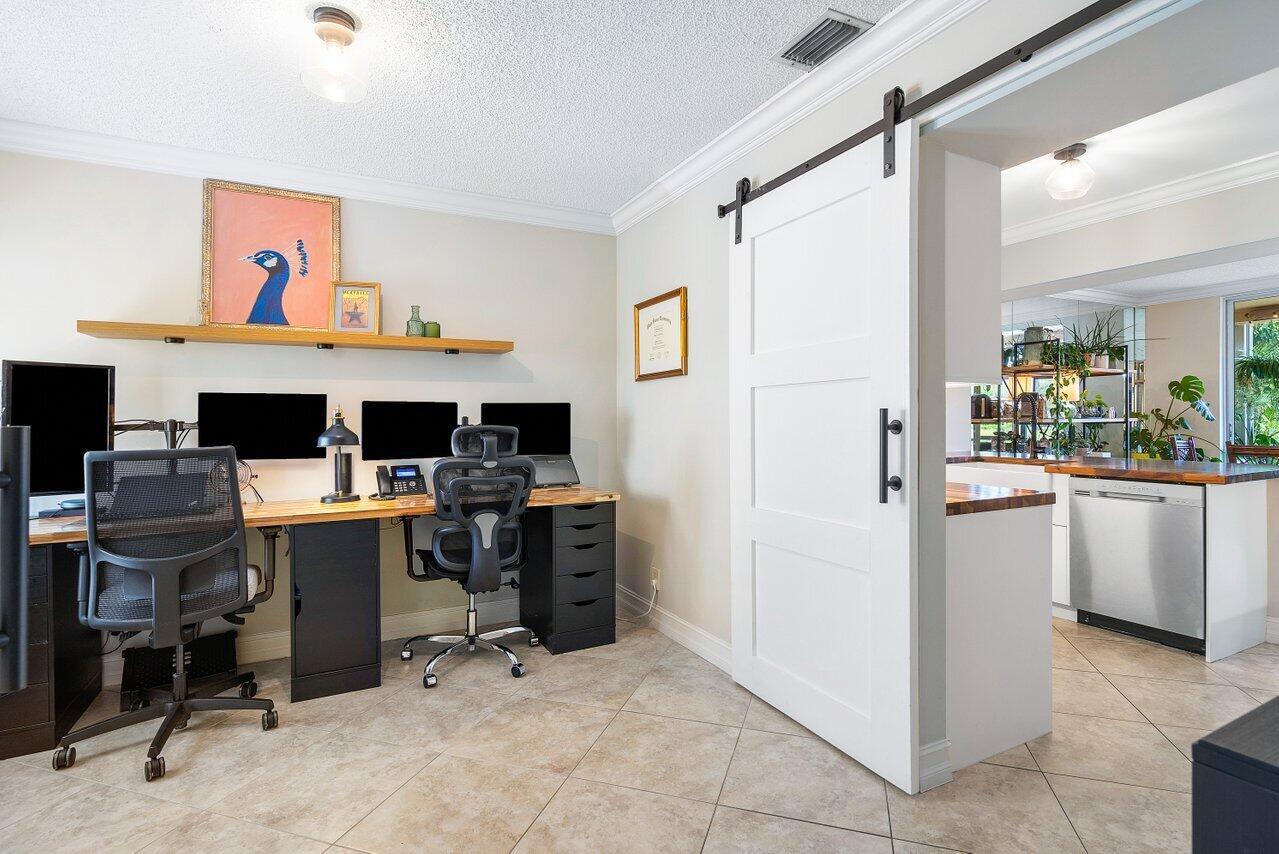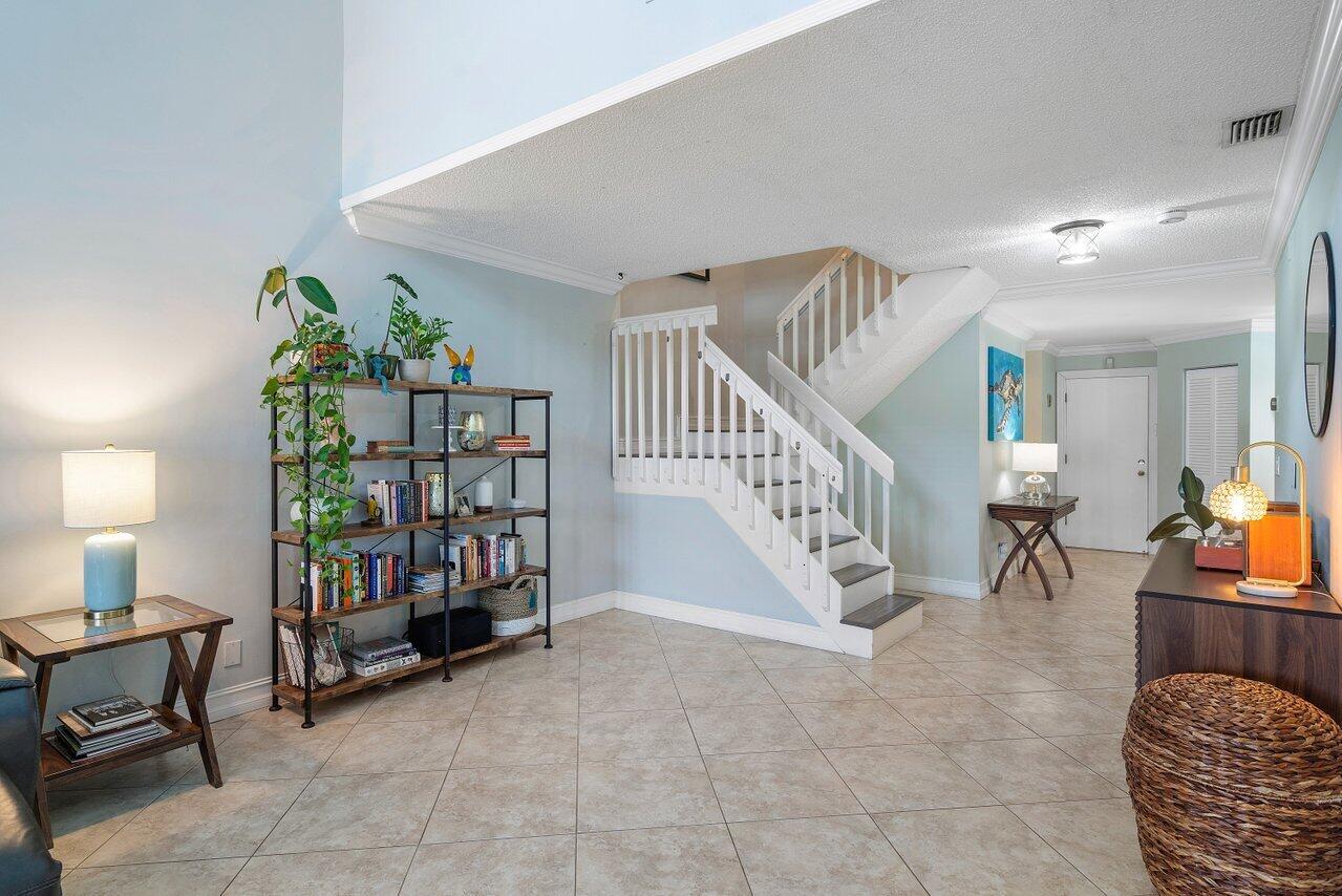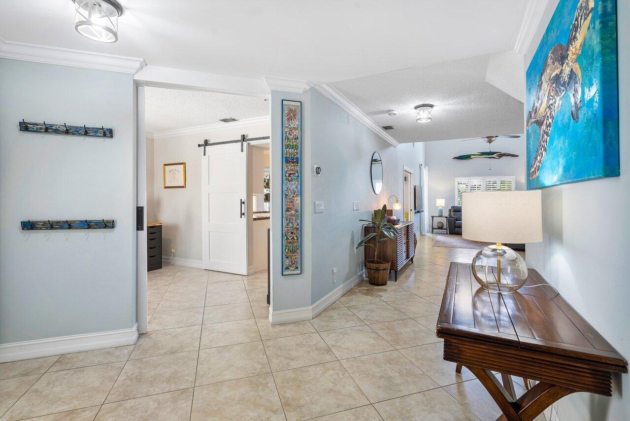This fantastic 3 bedroom + office, lakefront, townhome has a long list of upgrades from the New Chef's kitchen with all Samsung appliances and Brazilian Walnut counters and beautiful wood floors upstairs to the Accordian shutters on all windows, gorgeously renovated bathrooms including the stunning Primary bathroom with soaking tub and separate shower. The living room has dramatic vaulted ceilings and wonderful lake views. There is a screened porch + a paver patio to enjoy the beautiful lake and wonderful eastern exposure. Boca Isles offers a newly renovated heated & chilled pool, hot tub and exercise room. Located in wonderful SE Boca with all A rated schools. HOA is installing all new roofs and painting this year. Maintenance includes Insurance, Alarm, Roofs, Cable TV & Water