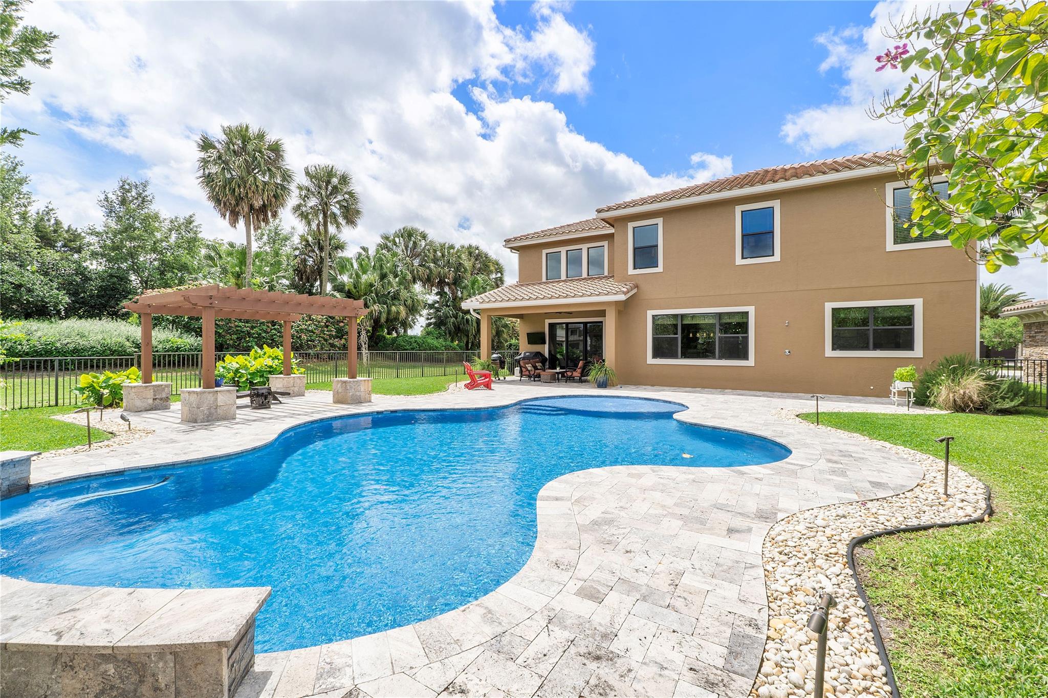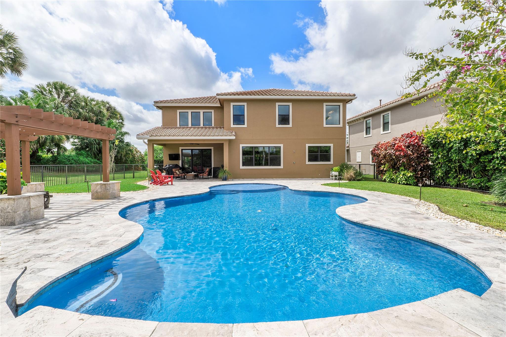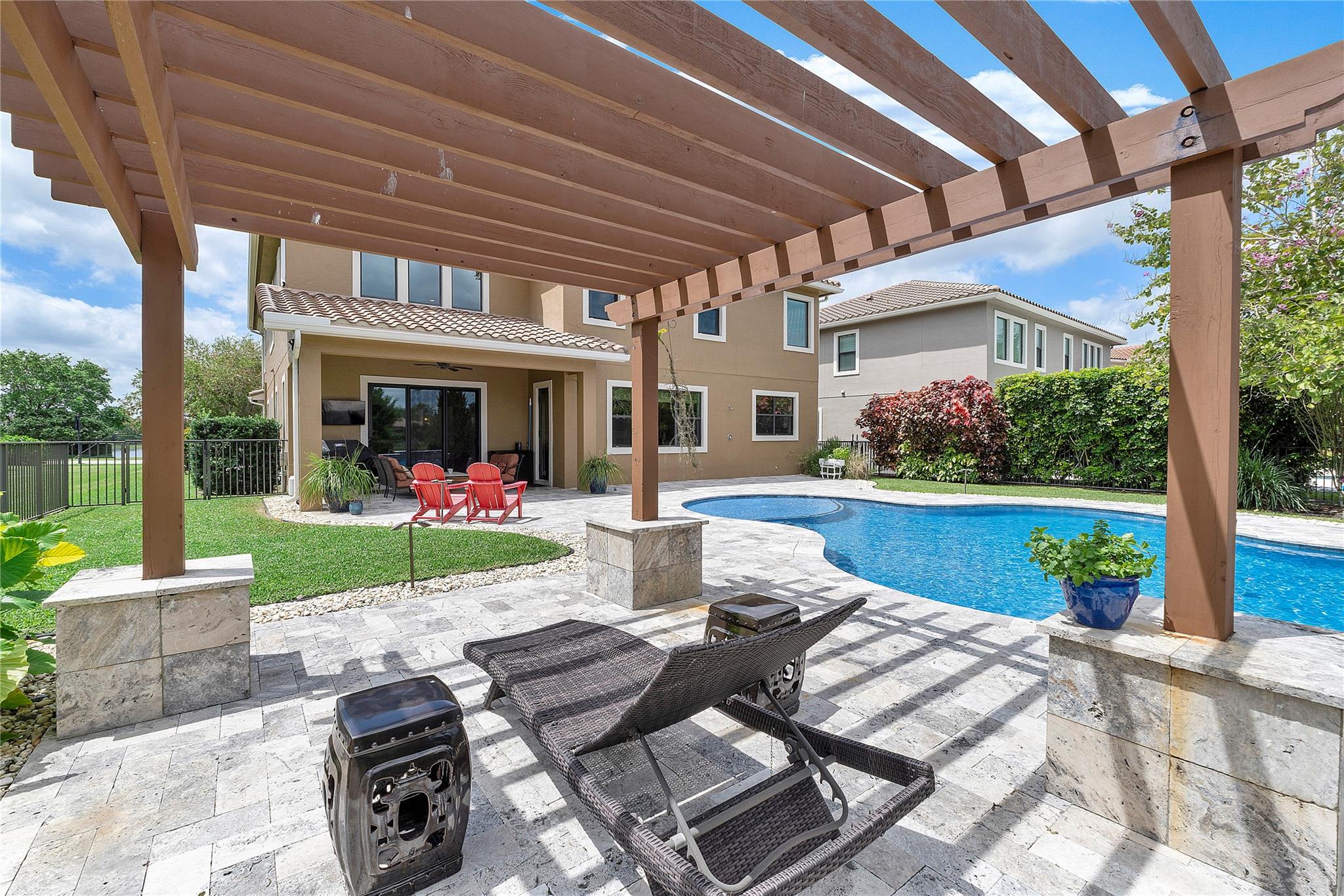 Move in Condition!!! Luxurious 5-bed, 4.5-bath home boasts marble floors downstairs, impact glass throughout. Enjoy a spacious backyard oasis with a saltwater pool and pergola. Chef's kitchen features a large center island, gas stove, and Jenn Air appliances, complemented by a separate bar area. 1st-floor bedroom suite offers convenience, while the 2nd-floor primary bedroom boasts a huge walk-in closet, separate tub/shower, makeup vanity, and double sinks.