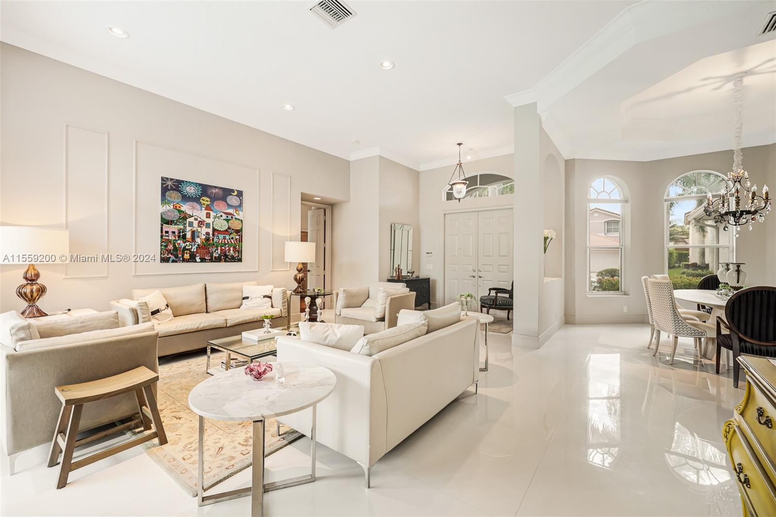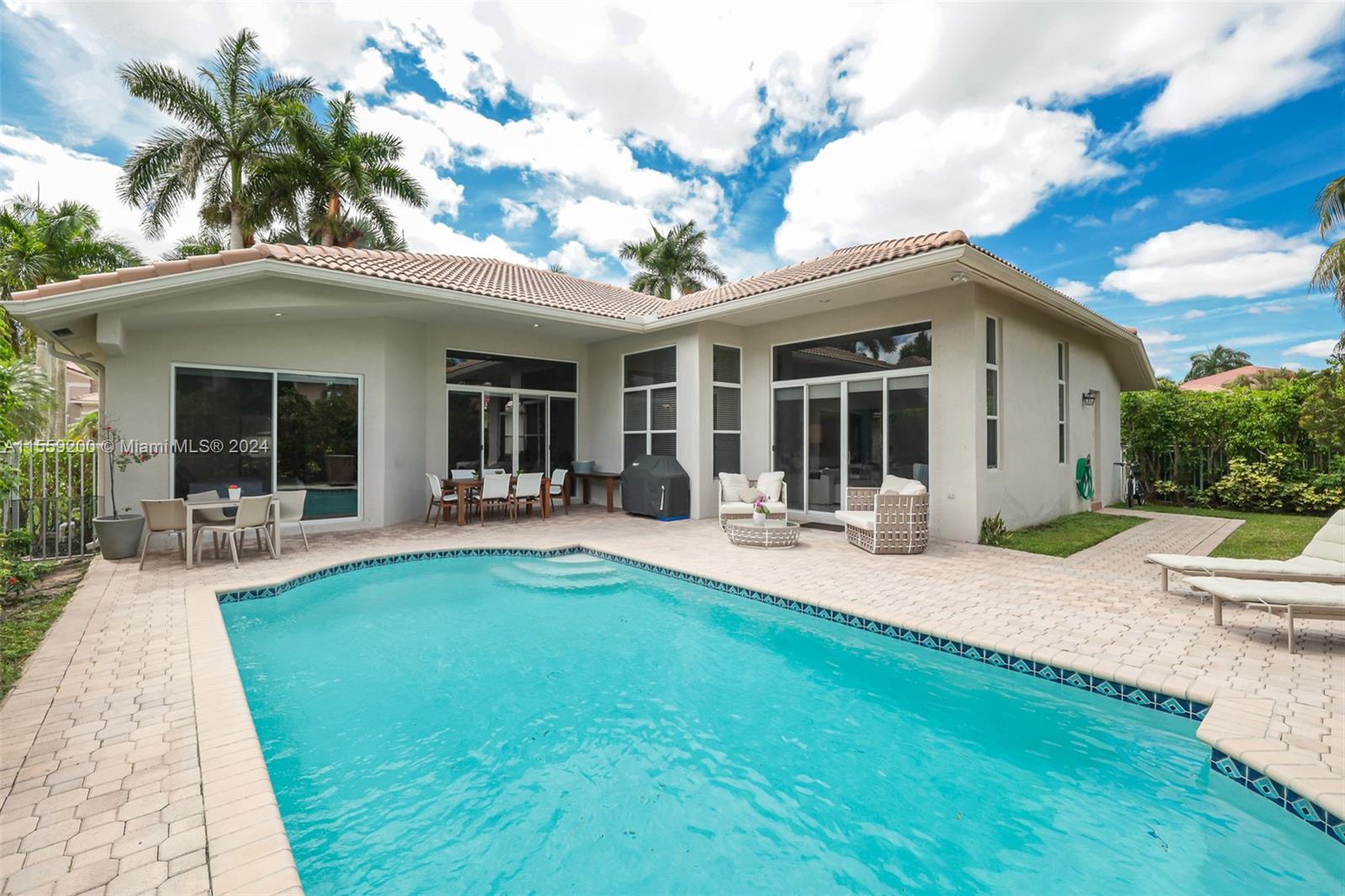 Nestled within the prestigious Weston Hills Country Club this elegant residence is sophisticated and meticulously maintained. The property features 4 bedrooms and 3 bathrooms with porcelain flooring across all common spaces. The Primary Suite offers luxurious engineered wood flooring, a cozy sitting area, a spacious bathroom with dual sinks and a separate shower. The kitchen comes with stainless steel appliances and new countertops, ensuring a ready-to-enjoy home experience from the moment you step in. The outdoor area with pool and brand new diamond bright, is perfect for gatherings. The home seamlessly combines style and functionality. Steps from School Bus Stop, Park, Playground, Basketball and Pickleball Court. A+ schools. Near north gate and Highways.