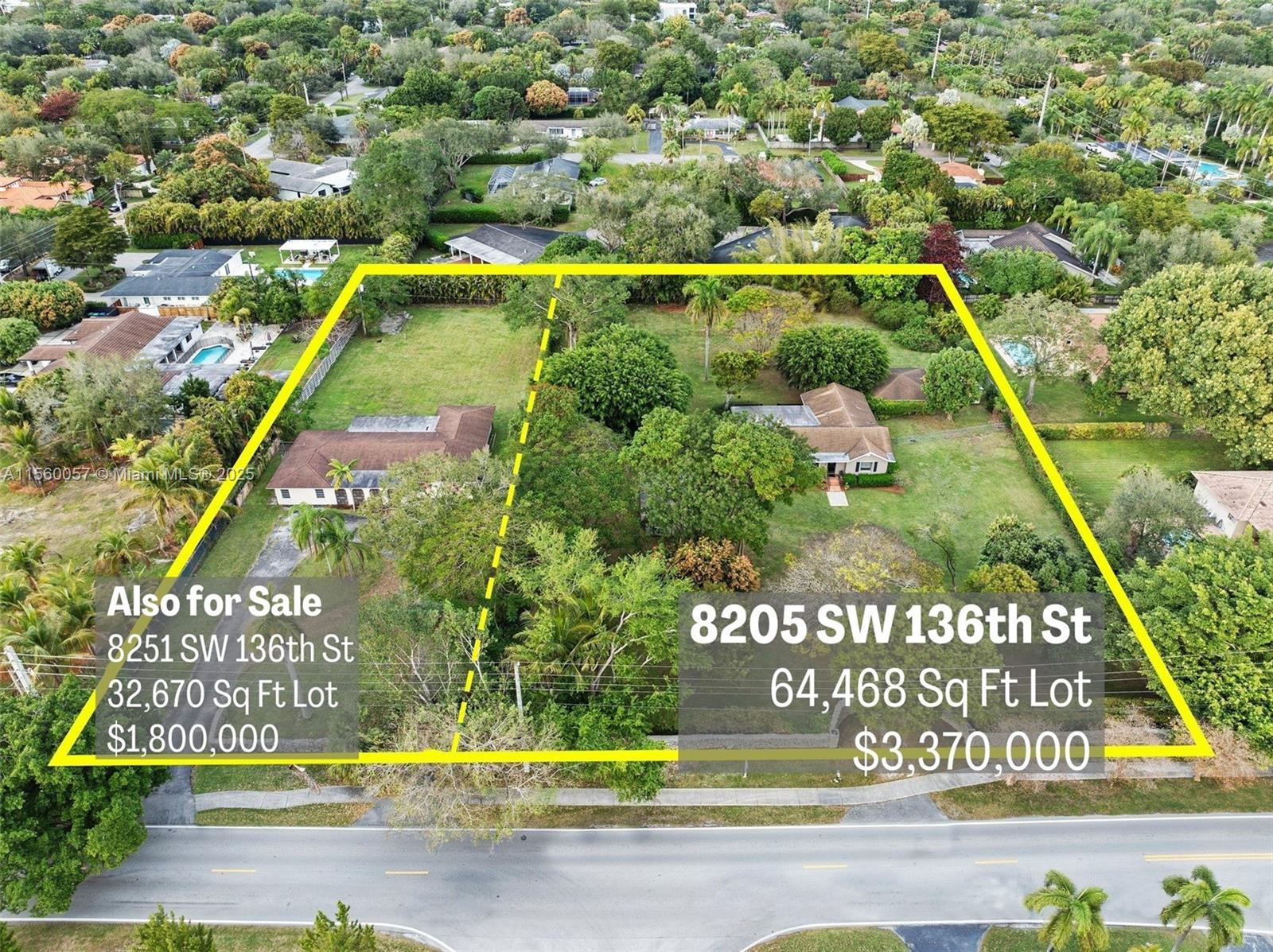 Pinecrest Land Bonanza! Two adjacent lots for sale at 8205 & 8251 SW 136th St, totaling 2.25 acres. Buy one or both lots, develop or lease one or both properties, live in the beautifully maintained 1939 original ranch at 8205 -- whatever your Pinecrest dream, the combined 97,138 SF is the canvas you need to fulfill it. The gated original coral rock wall fronting 8205 leads to a home feat. priceless Dade County Pine floors, generous & distinct living spaces, a primary suite with a deep-soaking tub, a storybook Florida outdoor family room opening to a large deck & more. The land is populated with flowering trees, 3 mango trees & an avocado tree. Bonus feat. incl. attractive wood elements, a carport, shed & large out-building full of possibilities. 2017 Roof, 2019 A/C. Near A+ Schools & US1.