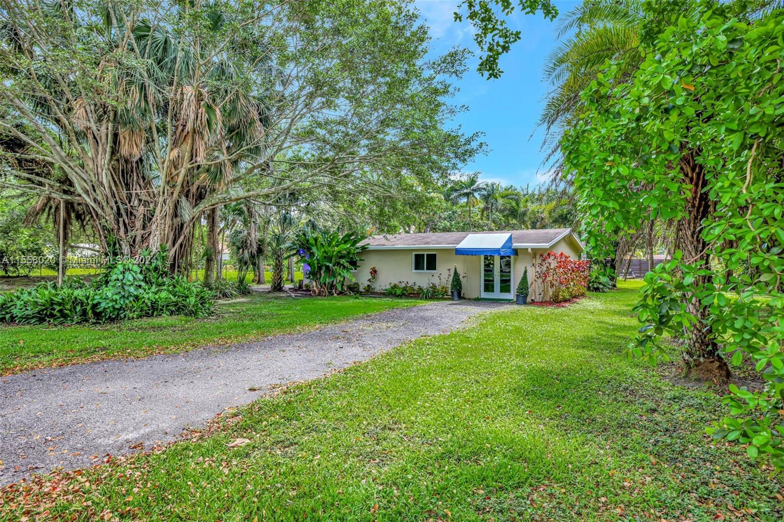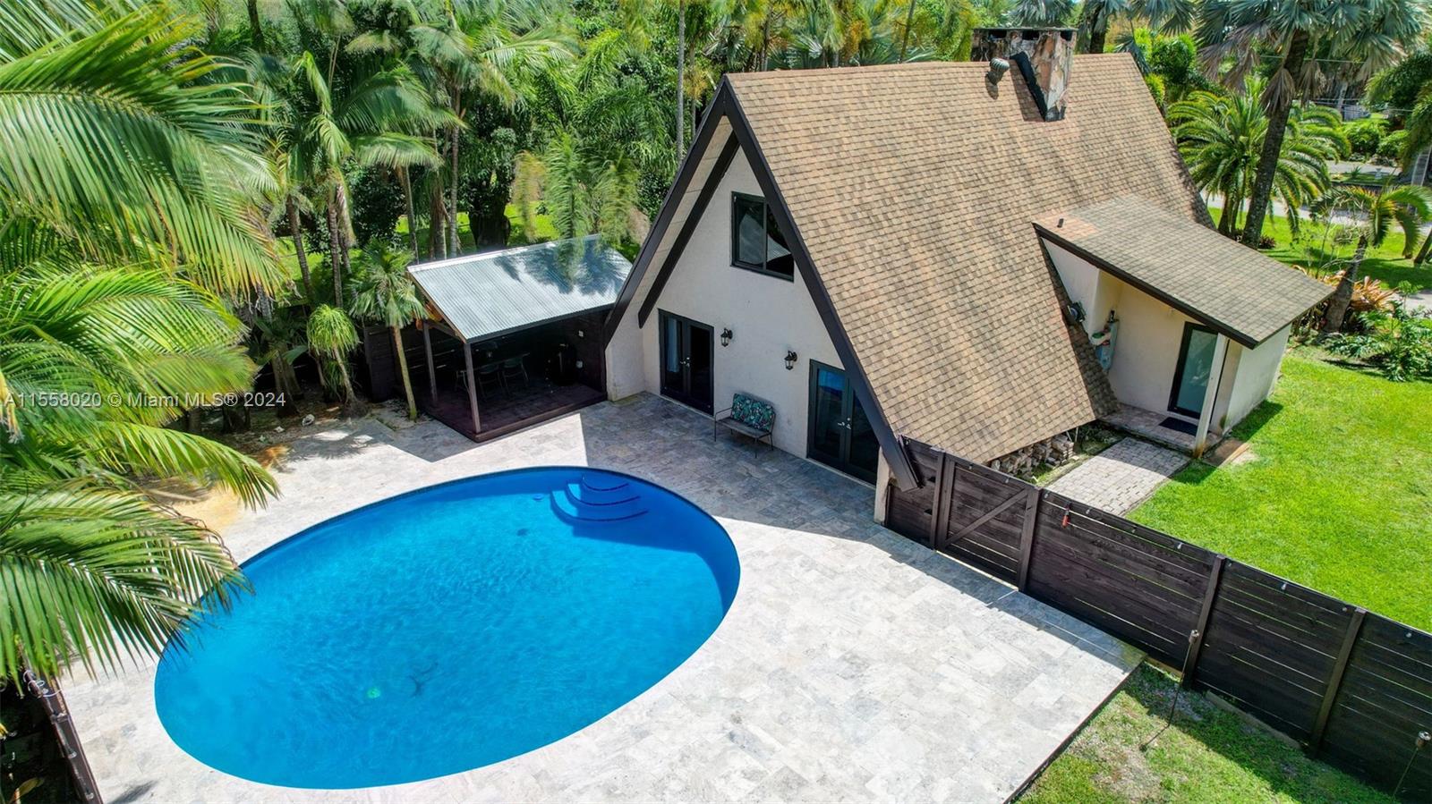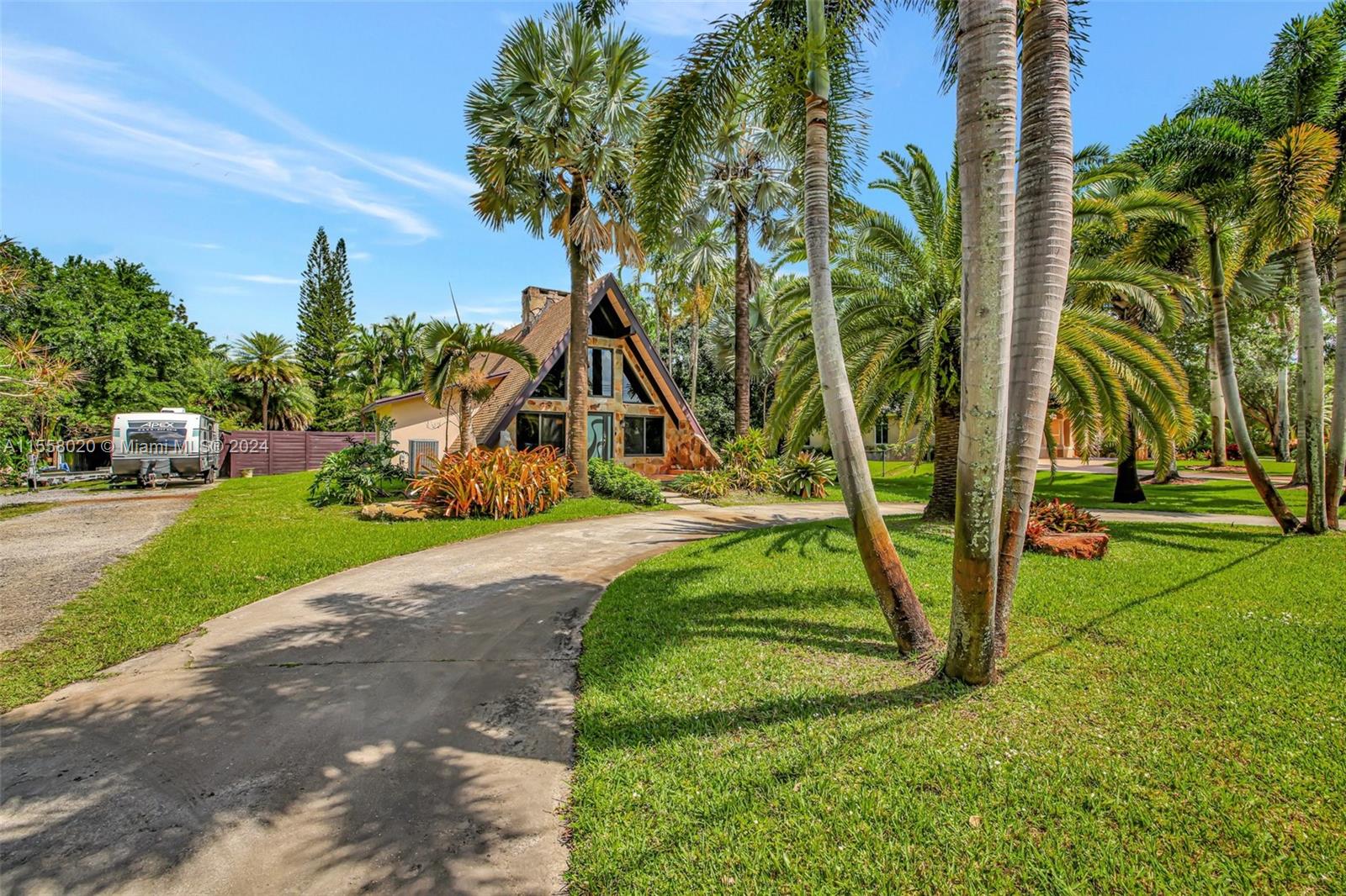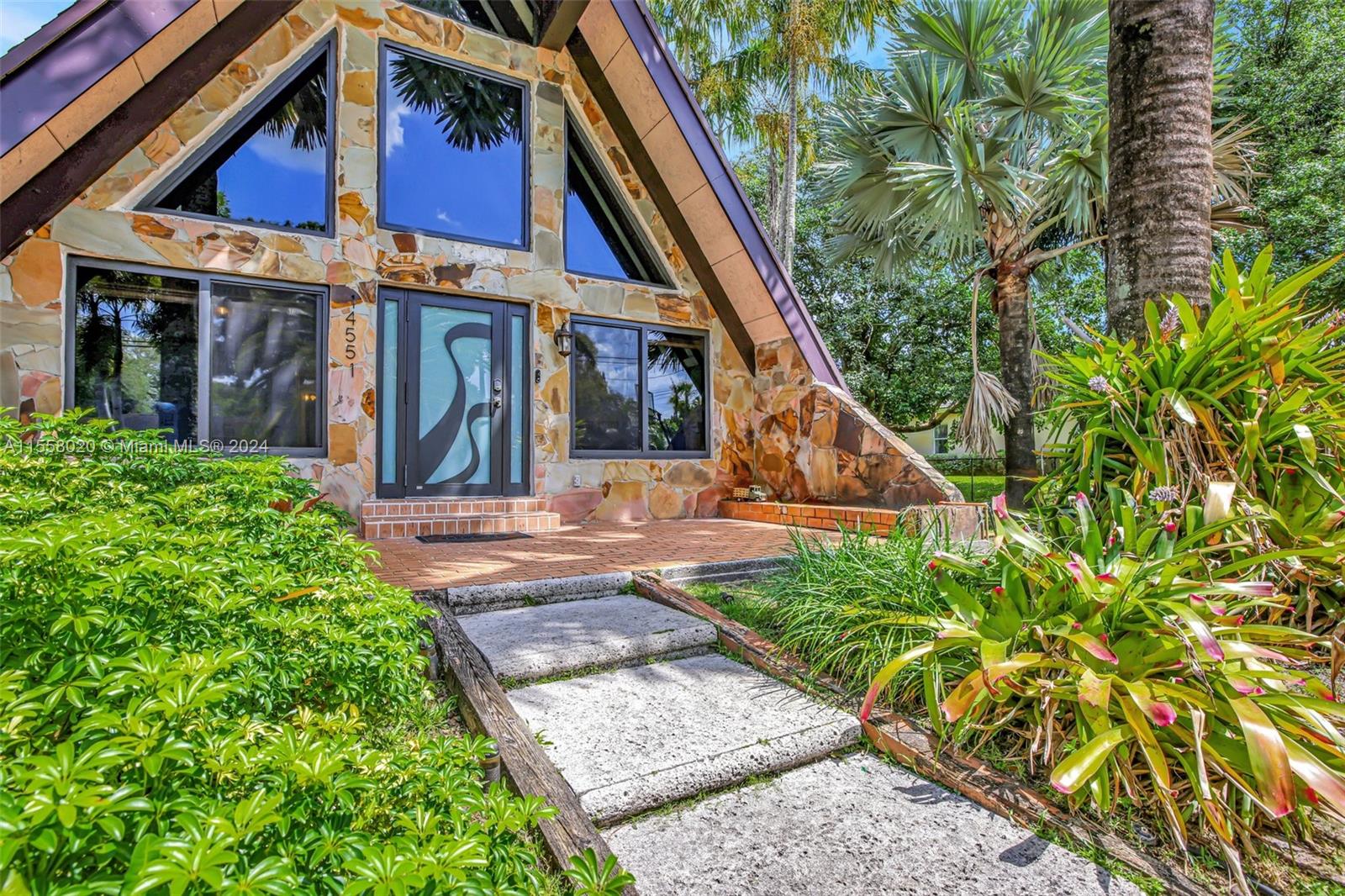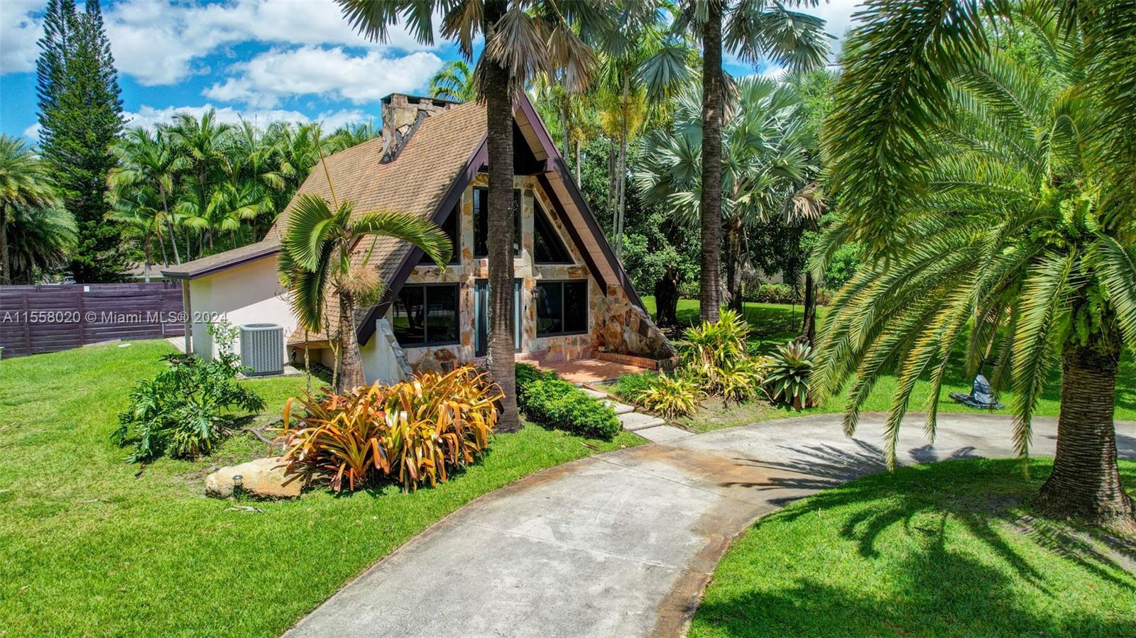One of a kind A-Frame home, nestled on nearly an acre w/ convenient front & rear access in one of Davie's best neighborhoods. 3 bed, 2 bath pool home PLUS fully equipped charming 2 bed, 1 bath guest house in what feels like tree lined Coconut Grove. Main residence accessible off 24th St features updated open kitchen, wood-burning fireplace & two 1st floor bedrooms opening to pool area; spiral staircase leads to secluded master suite above. Guest house, accessible via 23rd Ct, features a complete kitchen, cozy living space, bedroom, bath & office/bed - perfect for guests/rental income. Large storage shed, lush mature fruit trees & expansive space for all your hobbies, truly a rare find. Hurricane impact windows & doors. A true treasure offering privacy, space, versatility & A Rated Schools.