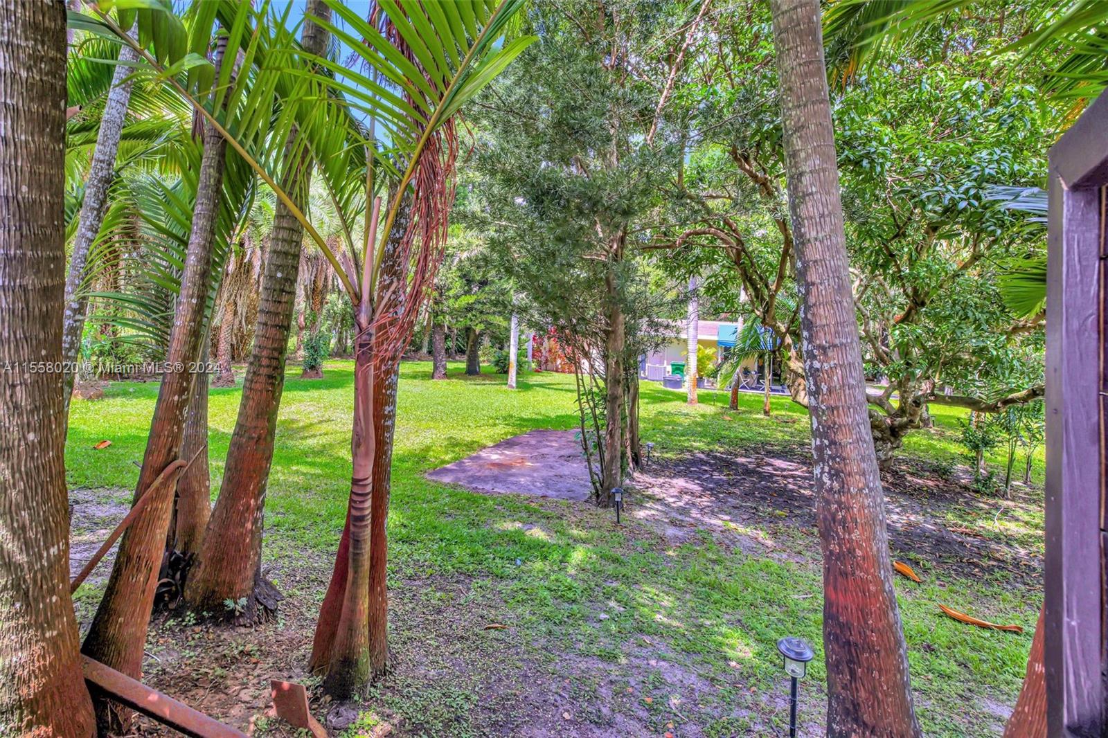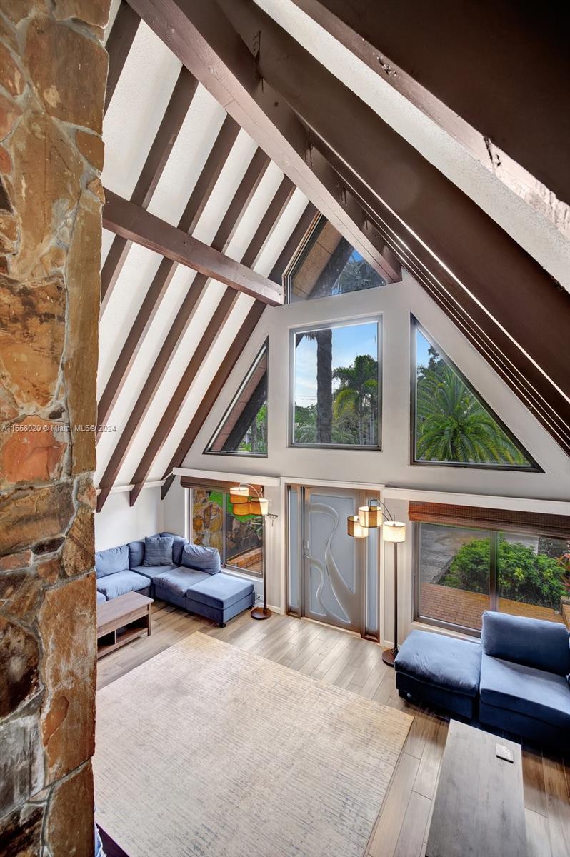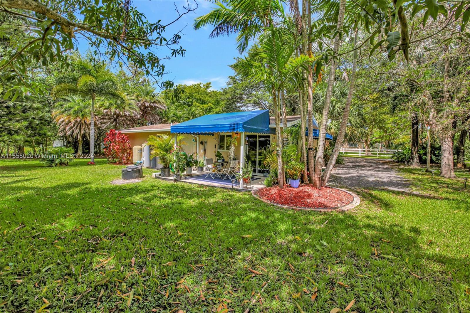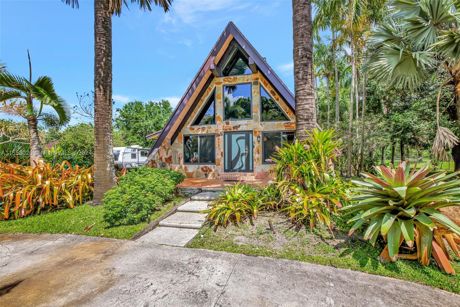 One of a kind A-Frame home, nestled on nearly an acre w/ convenient front & rear access in one of Davie's best neighborhoods. 3 bed, 2 bath pool home PLUS fully equipped charming 2 bed, 1 bath guest house in what feels like tree lined Coconut Grove. Main residence accessible off 24th St features updated open kitchen, wood-burning fireplace & two 1st floor bedrooms opening to pool area; spiral staircase leads to secluded master suite above. Guest house, accessible via 23rd Ct, features a complete kitchen, cozy living space, bedroom, bath & office/bed - perfect for guests/rental income. Large storage shed, lush mature fruit trees & expansive space for all your hobbies, truly a rare find. Hurricane impact windows & doors. A true treasure offering privacy, space, versatility & A Rated Schools.