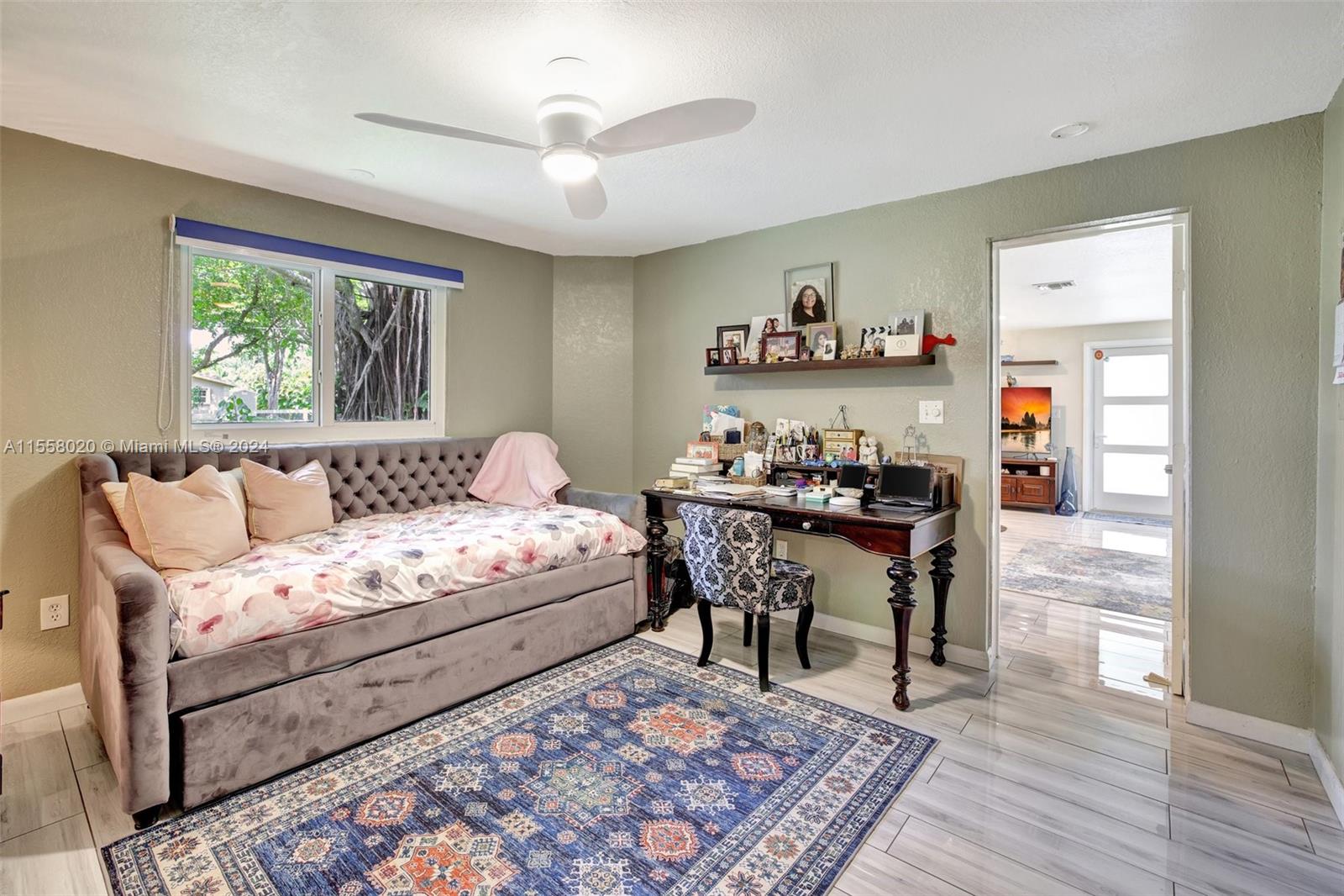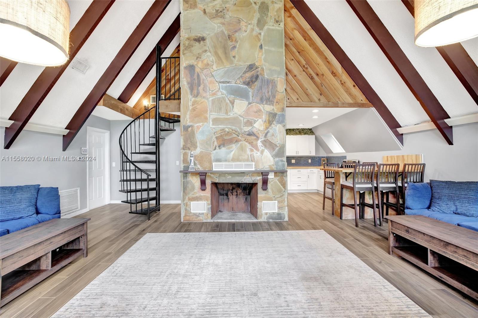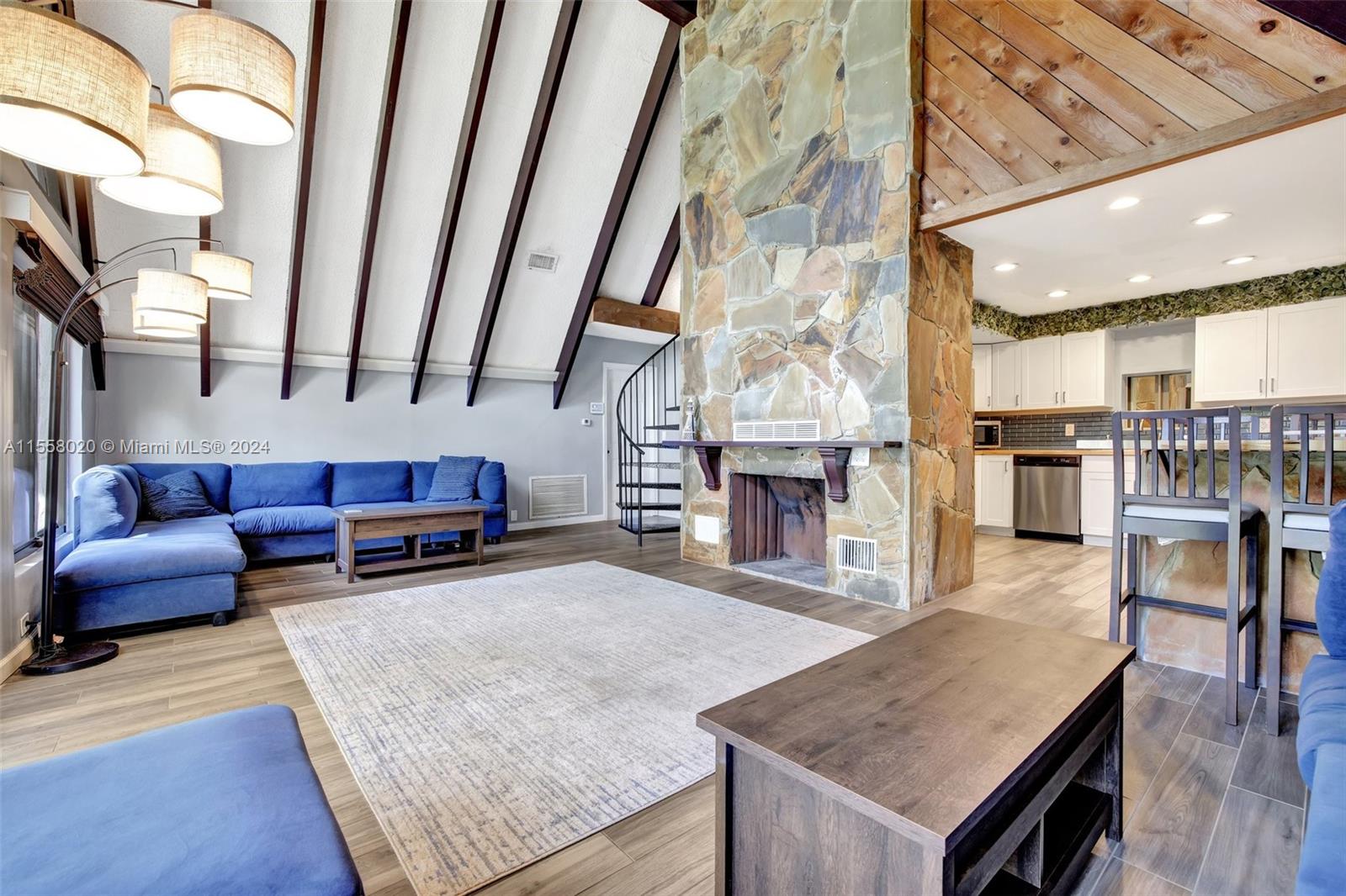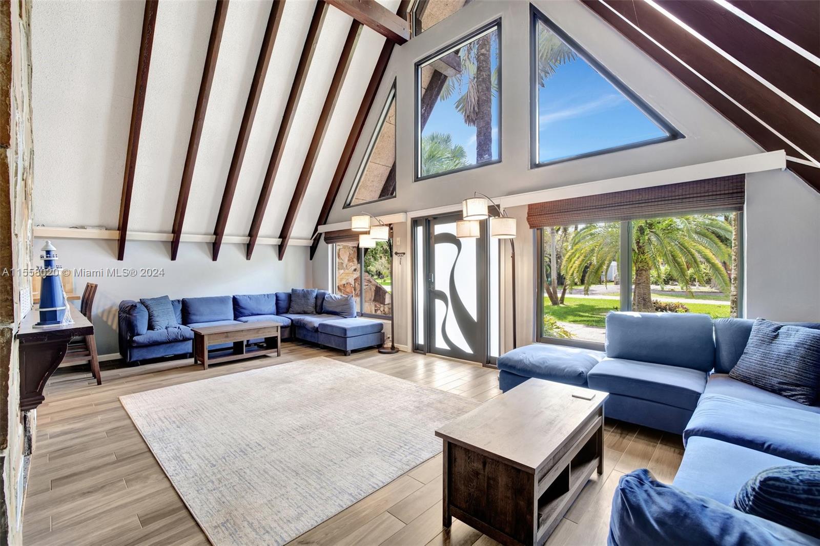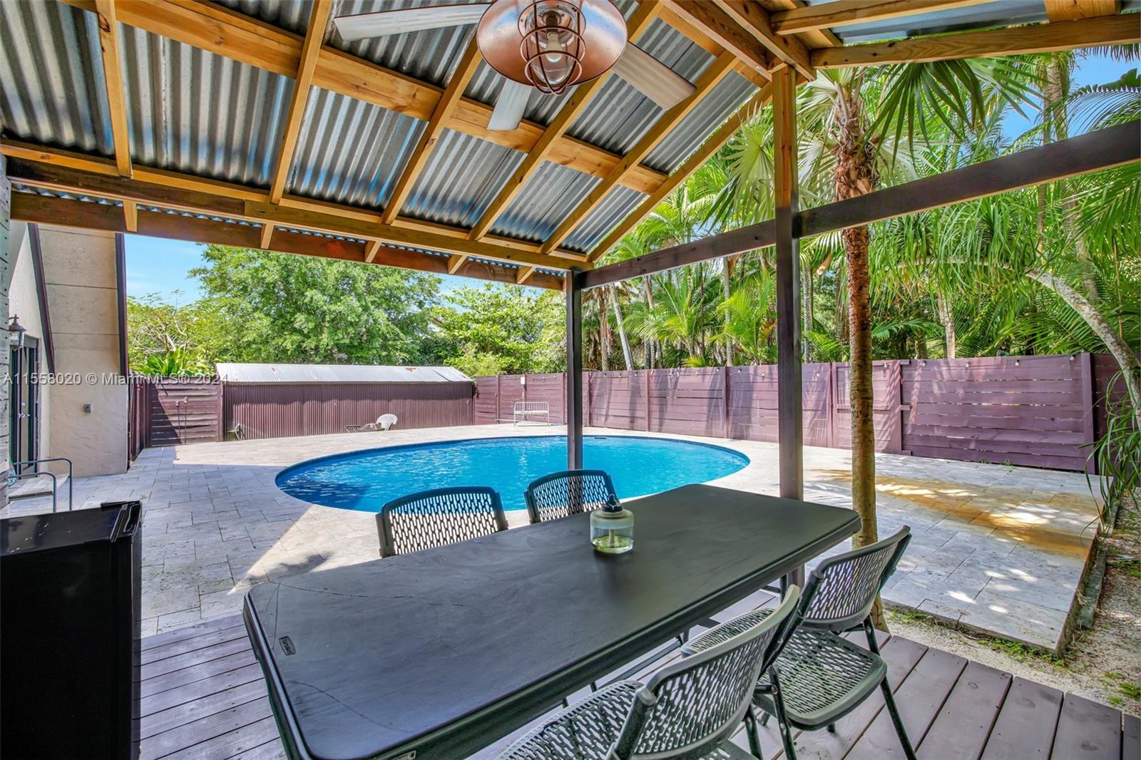 One of a kind A-Frame home, nestled on nearly an acre w/ convenient front & rear access in one of Davie's best neighborhoods. 3 bed, 2 bath pool home PLUS fully equipped charming 2 bed, 1 bath guest house in what feels like tree lined Coconut Grove. Main residence accessible off 24th St features updated open kitchen, wood-burning fireplace & two 1st floor bedrooms opening to pool area; spiral staircase leads to secluded master suite above. Guest house, accessible via 23rd Ct, features a complete kitchen, cozy living space, bedroom, bath & office/bed - perfect for guests/rental income. Large storage shed, lush mature fruit trees & expansive space for all your hobbies, truly a rare find. Hurricane impact windows & doors. A true treasure offering privacy, space, versatility & A Rated Schools.