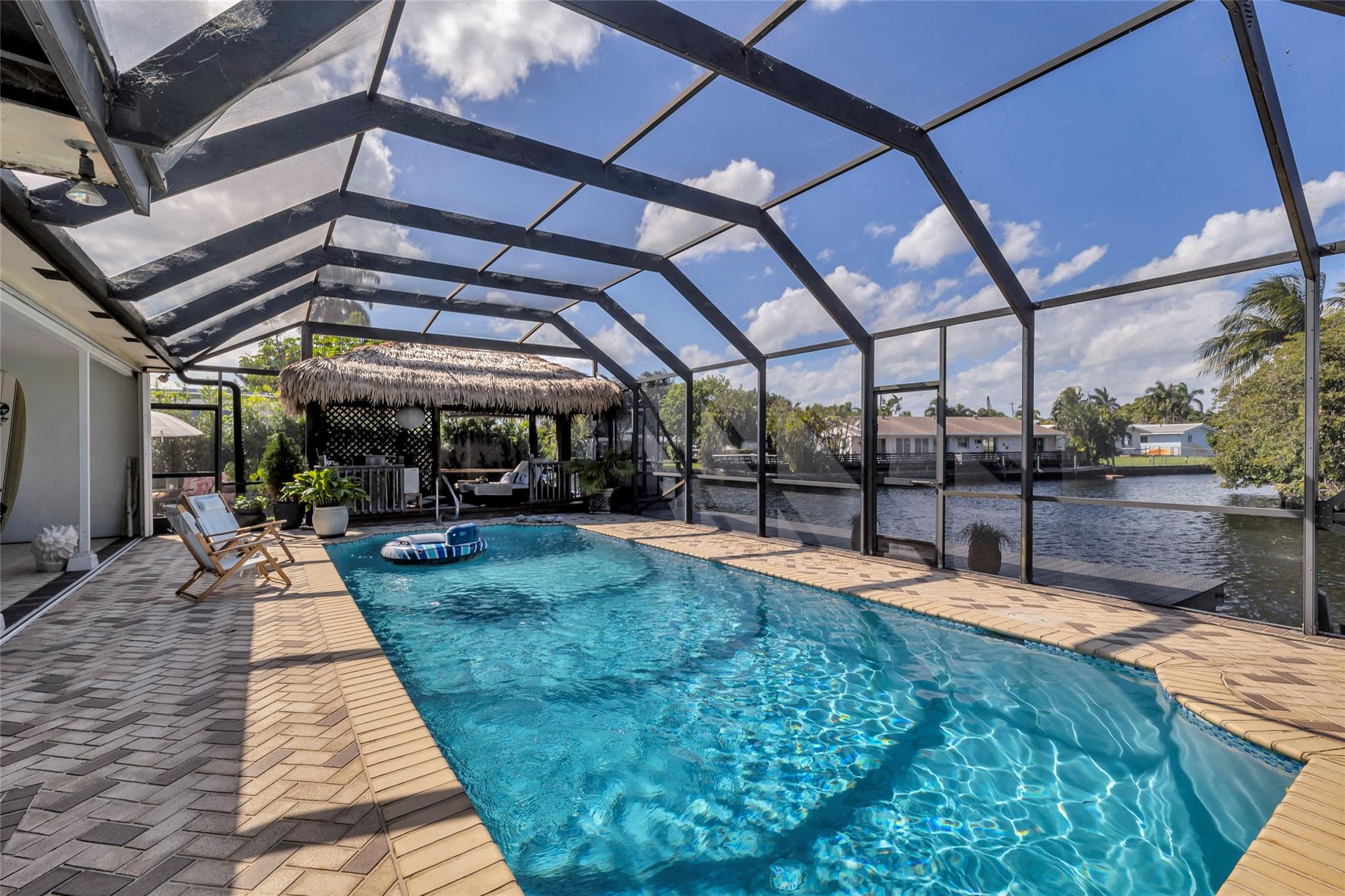 You deserve a vacation EVERYDAY Kick your shoes off & relax on your own piece of paradise featuring a wonderful waterfront mediterranean style home. 2 living areas on this property: inside AND outside! Tropical landscaping surrounds the home creating a sense of seclusion. Enjoy serene moments while sitting in the beautifully paved patio leading to the sparkling pool, expansive Tiki Hut with bar and view of the canal. Situated on an extra high concrete seawall with 75 ft of waterfront with ocean access. Bring your boat & fishing rods: Tarpon, Red Fish, Black Drum, Peacock Bass frequent the dock. The telescoping sliding doors allow you to create an open-air experience - turn the AC off! See & experience this unique beautiful property in person. Home Warranty Included!